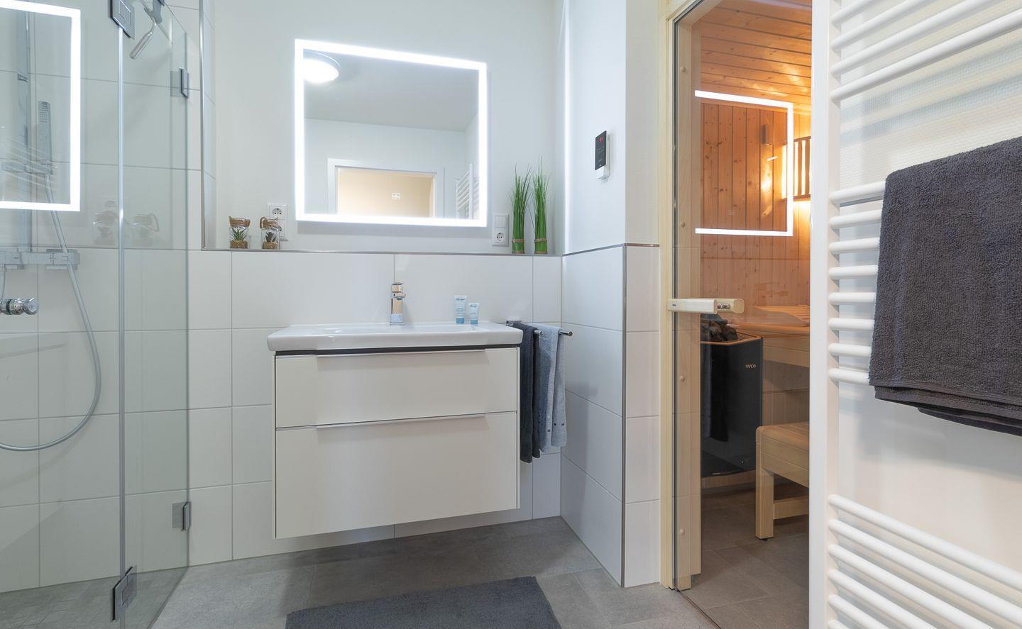 Dein Bad wird zur privaten Wohlfühloase: Starte den Tag unter der großzügigen Dusche oder entspanne am Abend in deiner eigenen Sauna – hier erlebst du Wellness pur direkt in deiner Ferienwohnung.