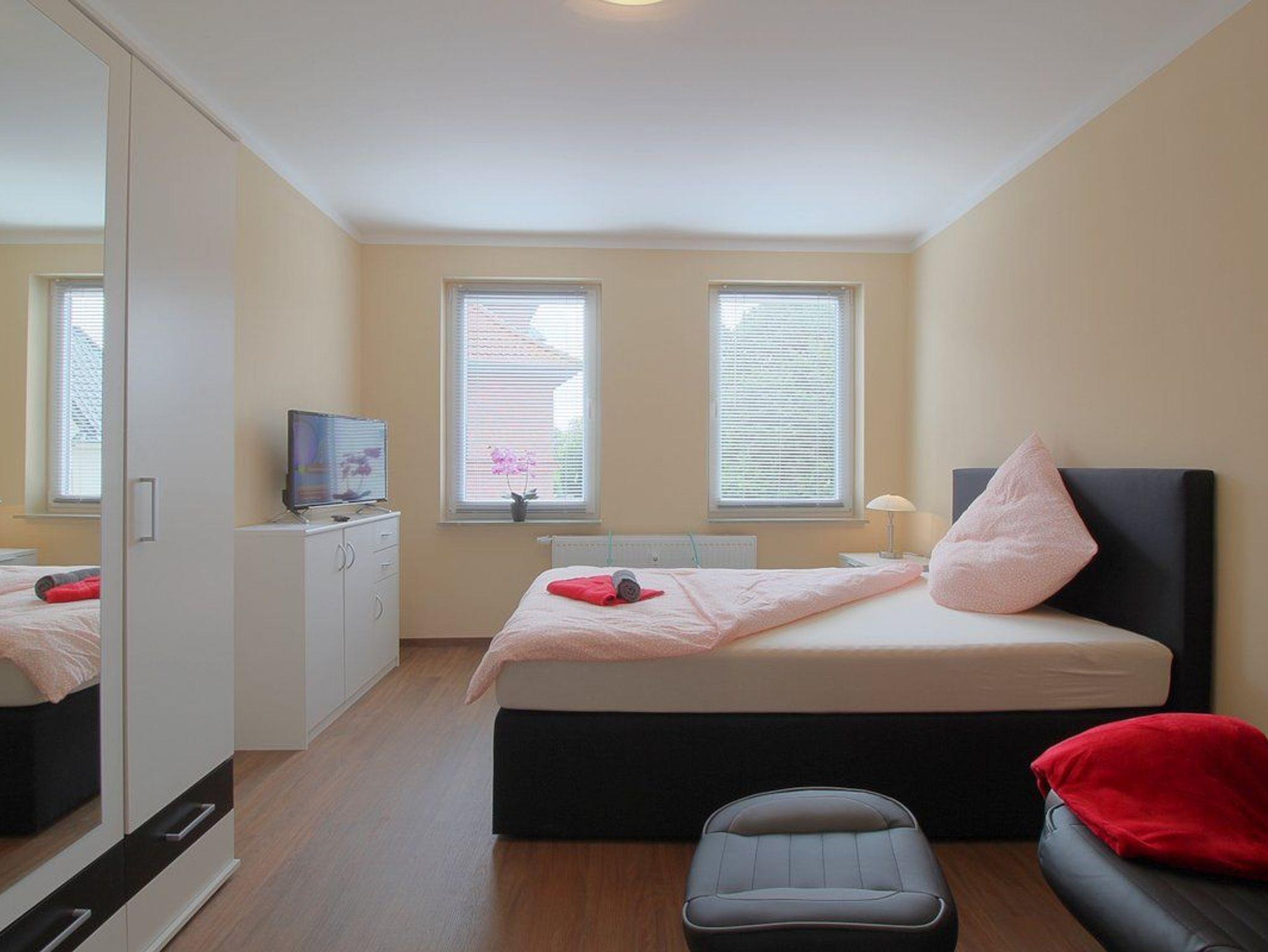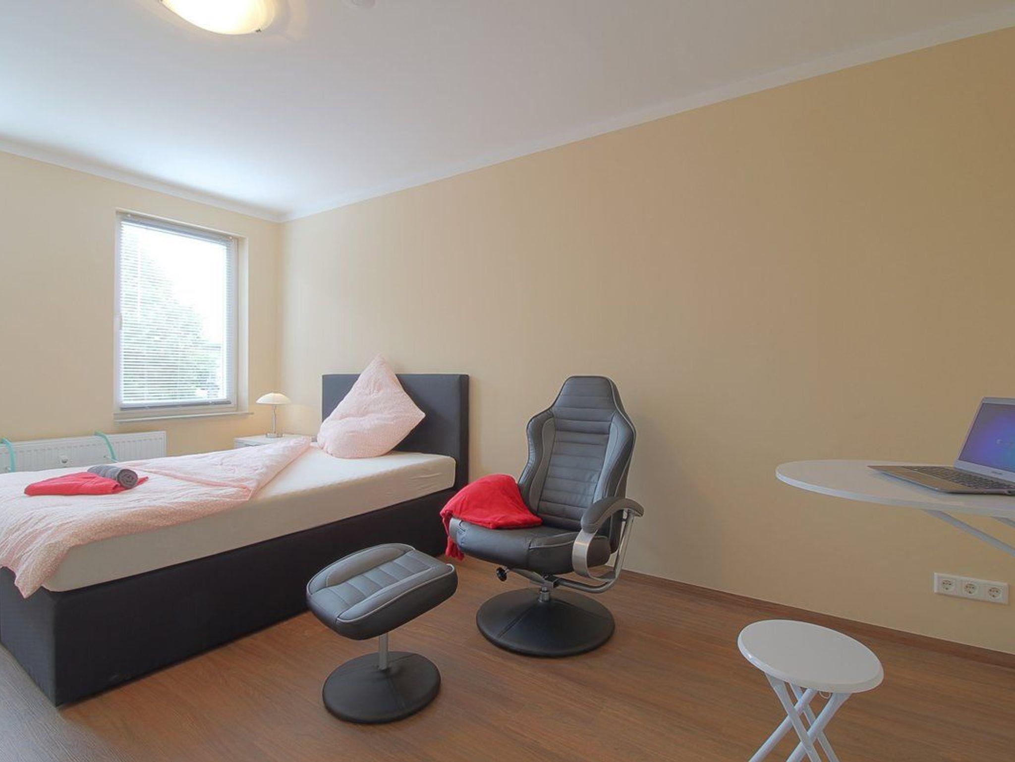 Modern eingerichtetes Einzelzimmer mit einem gemütlichen Boxspringbett, Fernsehsessel, großem Flachbild TV, gemeinsame Küchen- und Badezimmernutzung. Vinylbodenbeläge in allen Räume, daher für Allergiker geeignet. Es fehlt an nichts, hier können Sie nach einem anstrengendem Arbeitstasg Ihren Feierabend genießen.