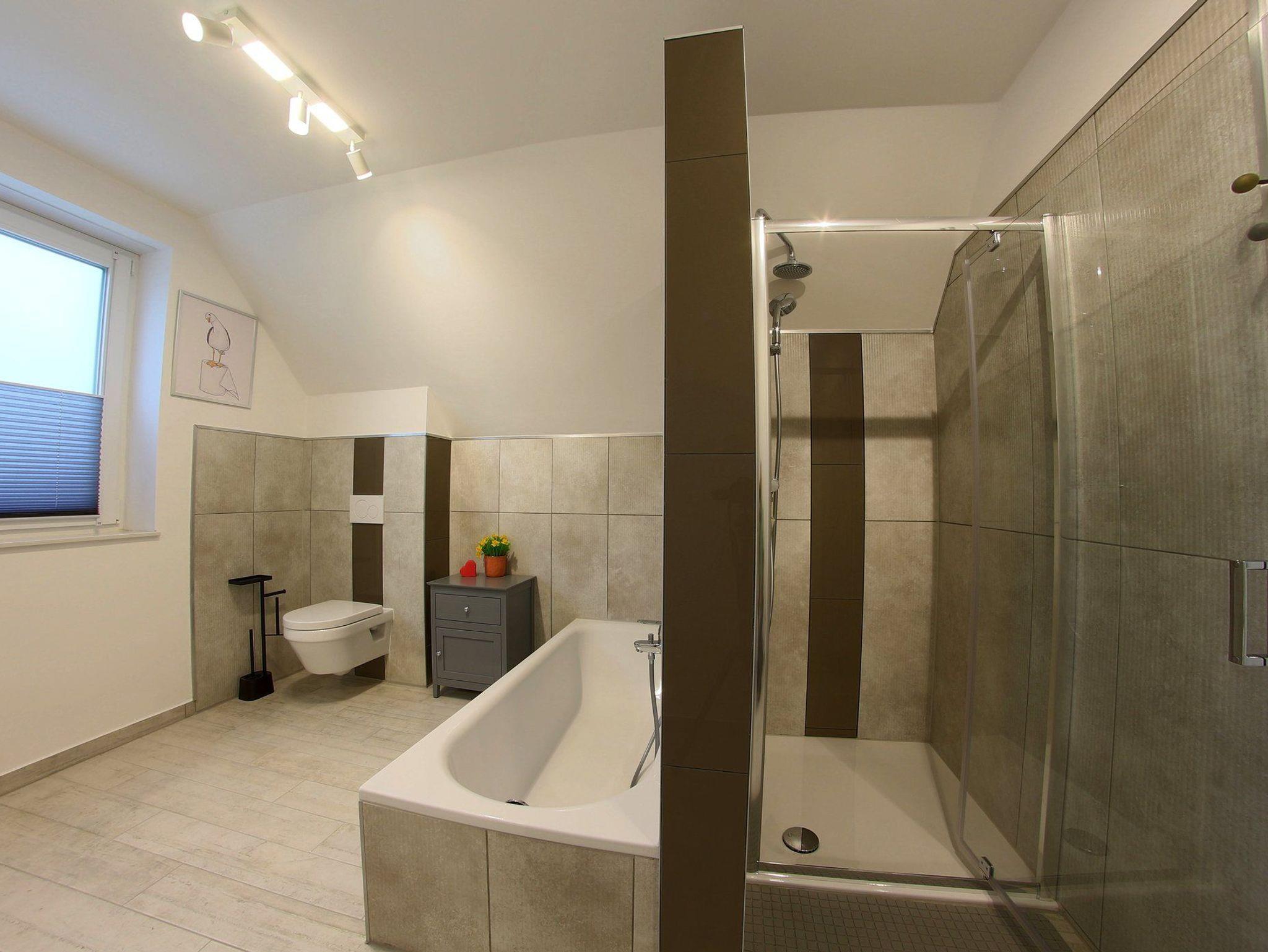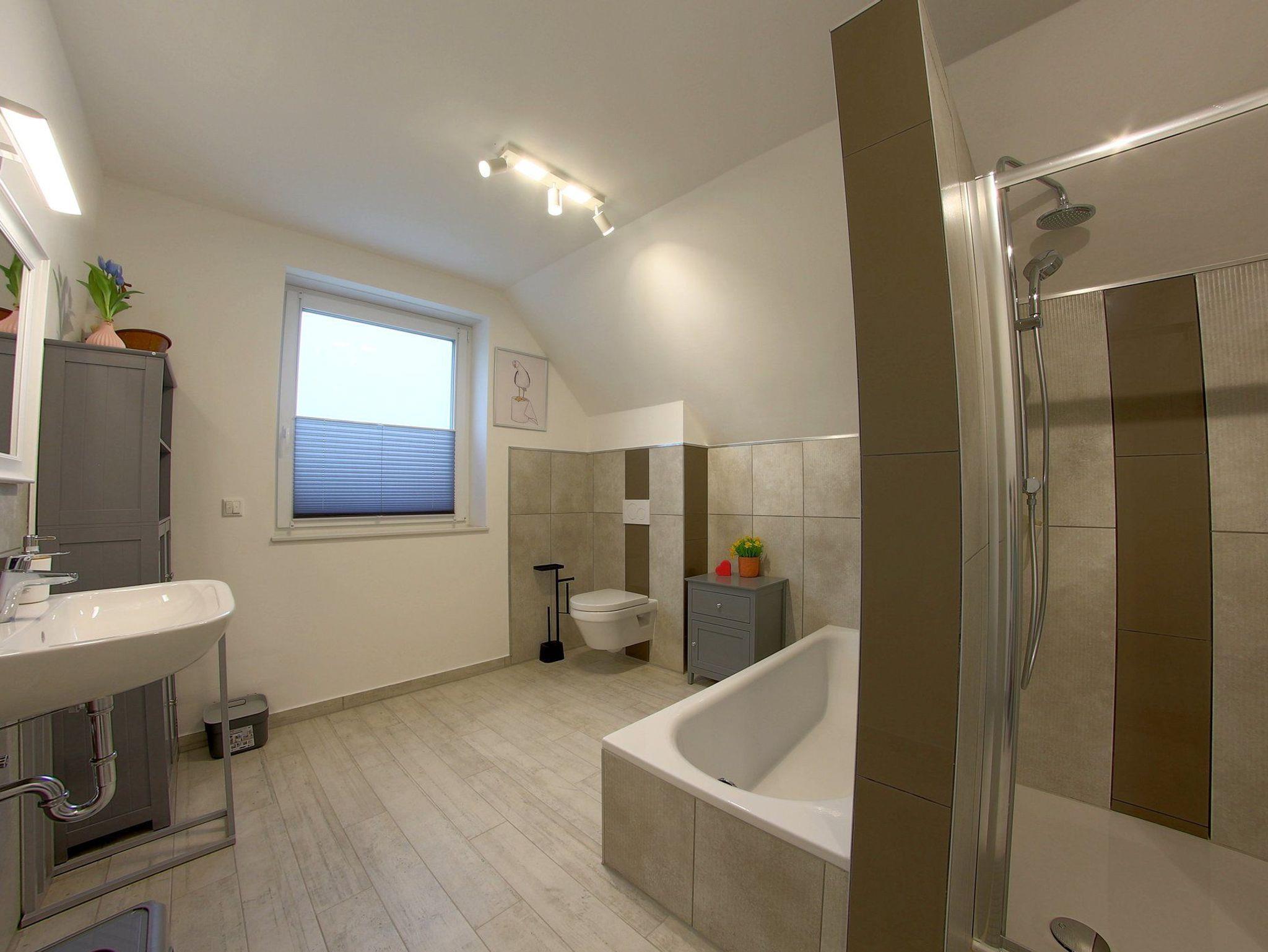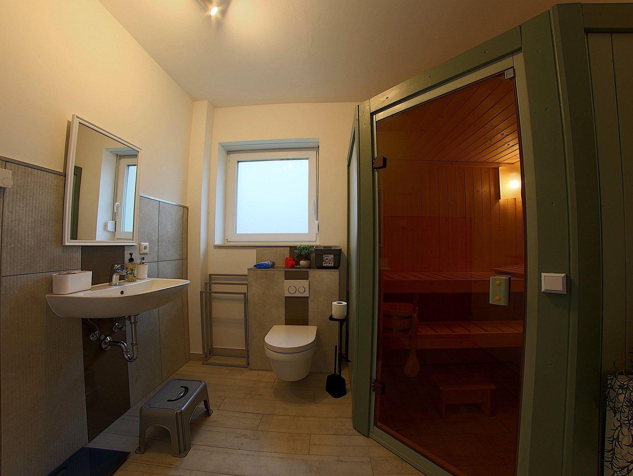 Im Erdgeschoß gibt es ein schickes Duschbad mit Sauna und im Obergeschoß ein Vollbad mit Fenster für die Gäste. Im Abstellraum draußen gibt es eine Waschmaschine