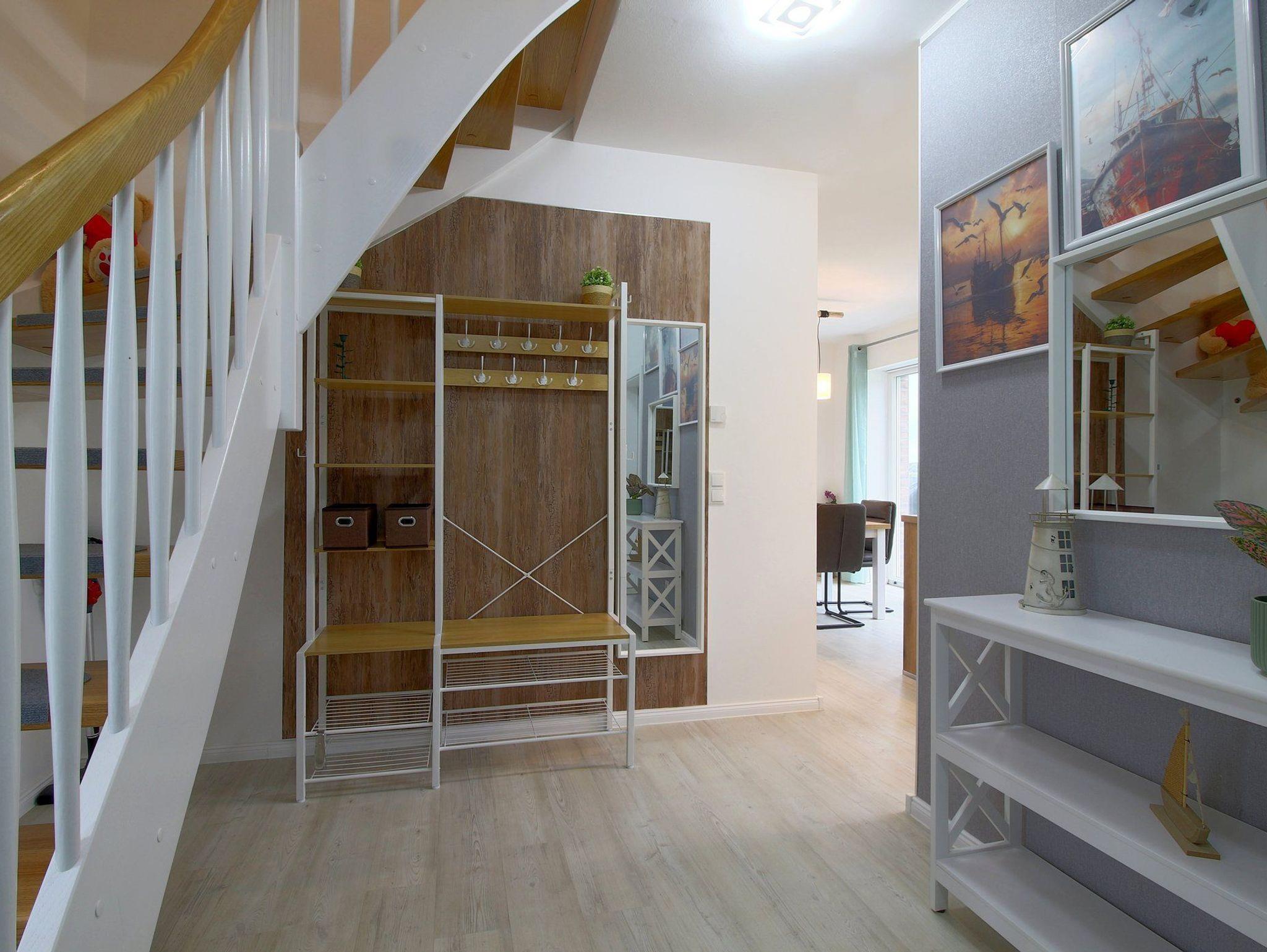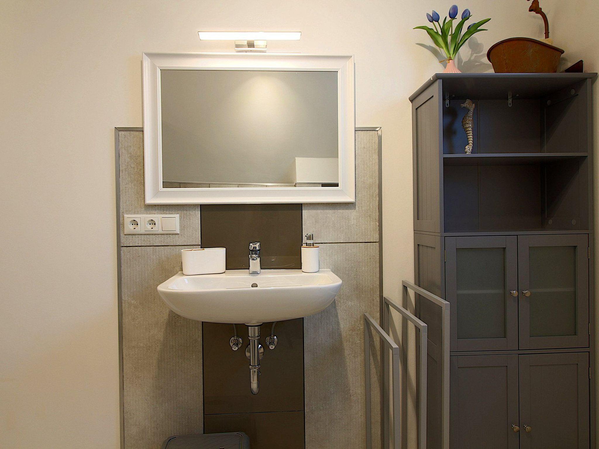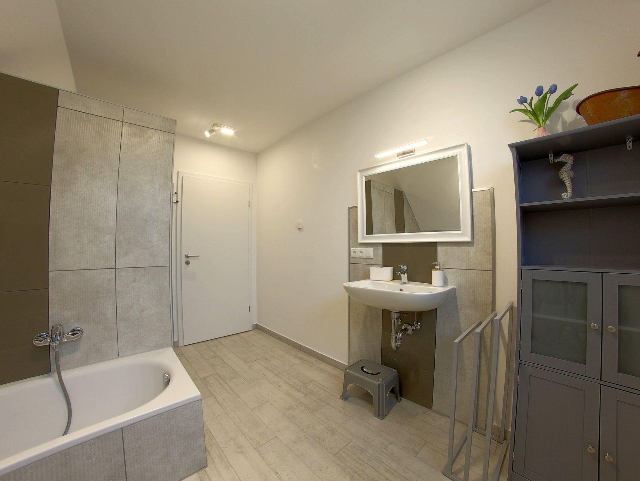 Im Erdgeschoß gibt es ein schickes Duschbad mit Sauna und im Obergeschoß ein Vollbad mit Fenster für die Gäste. Im Abstellraum draußen gibt es eine Waschmaschine