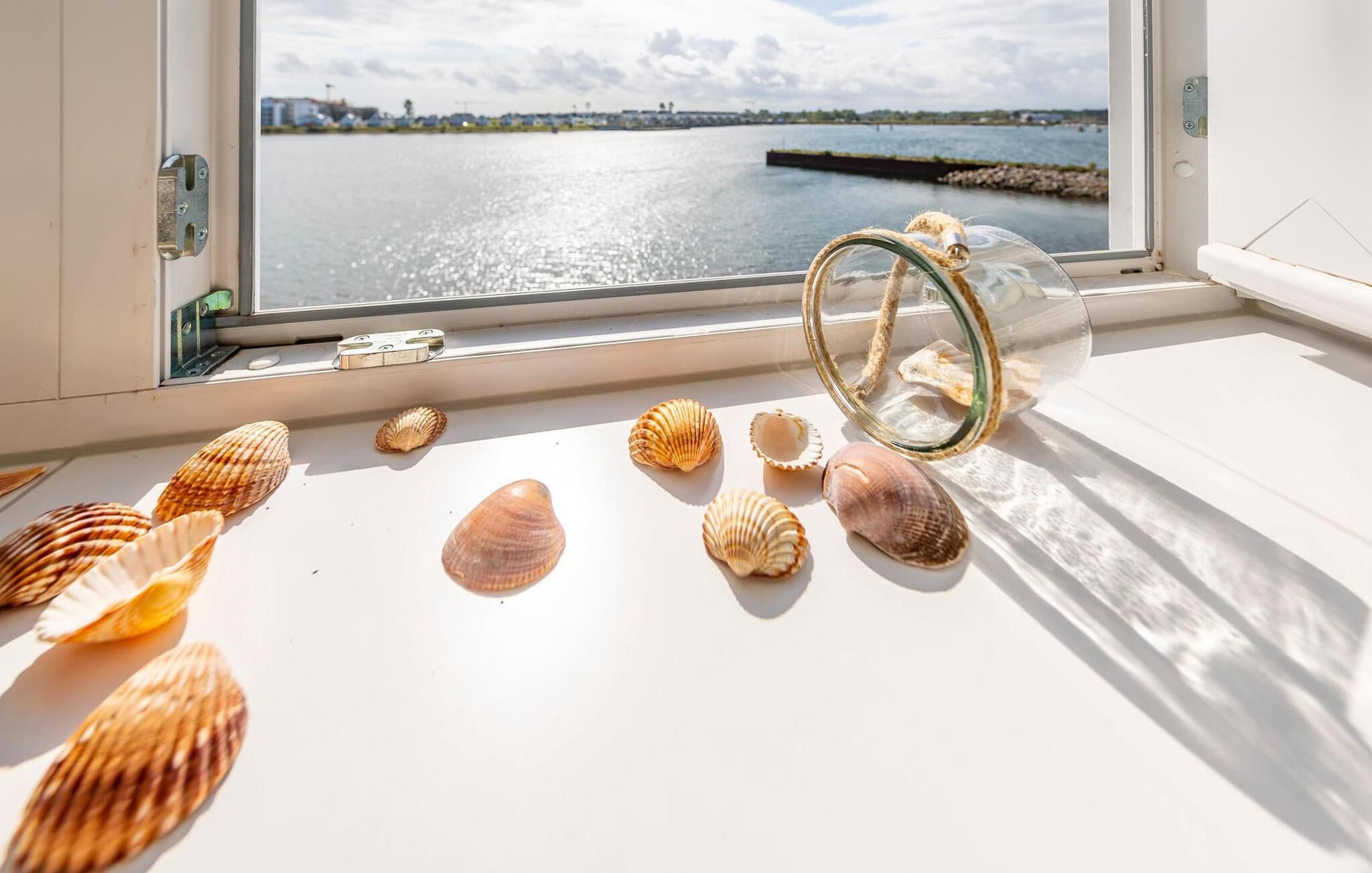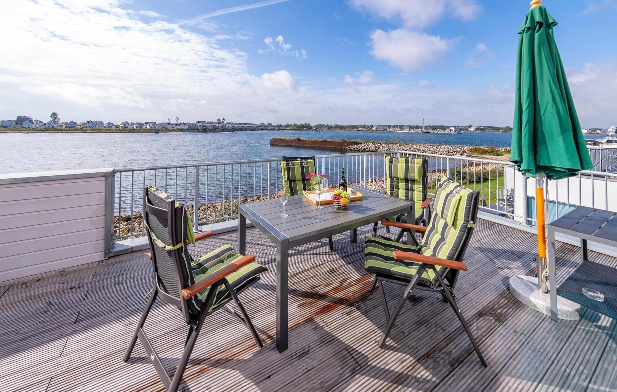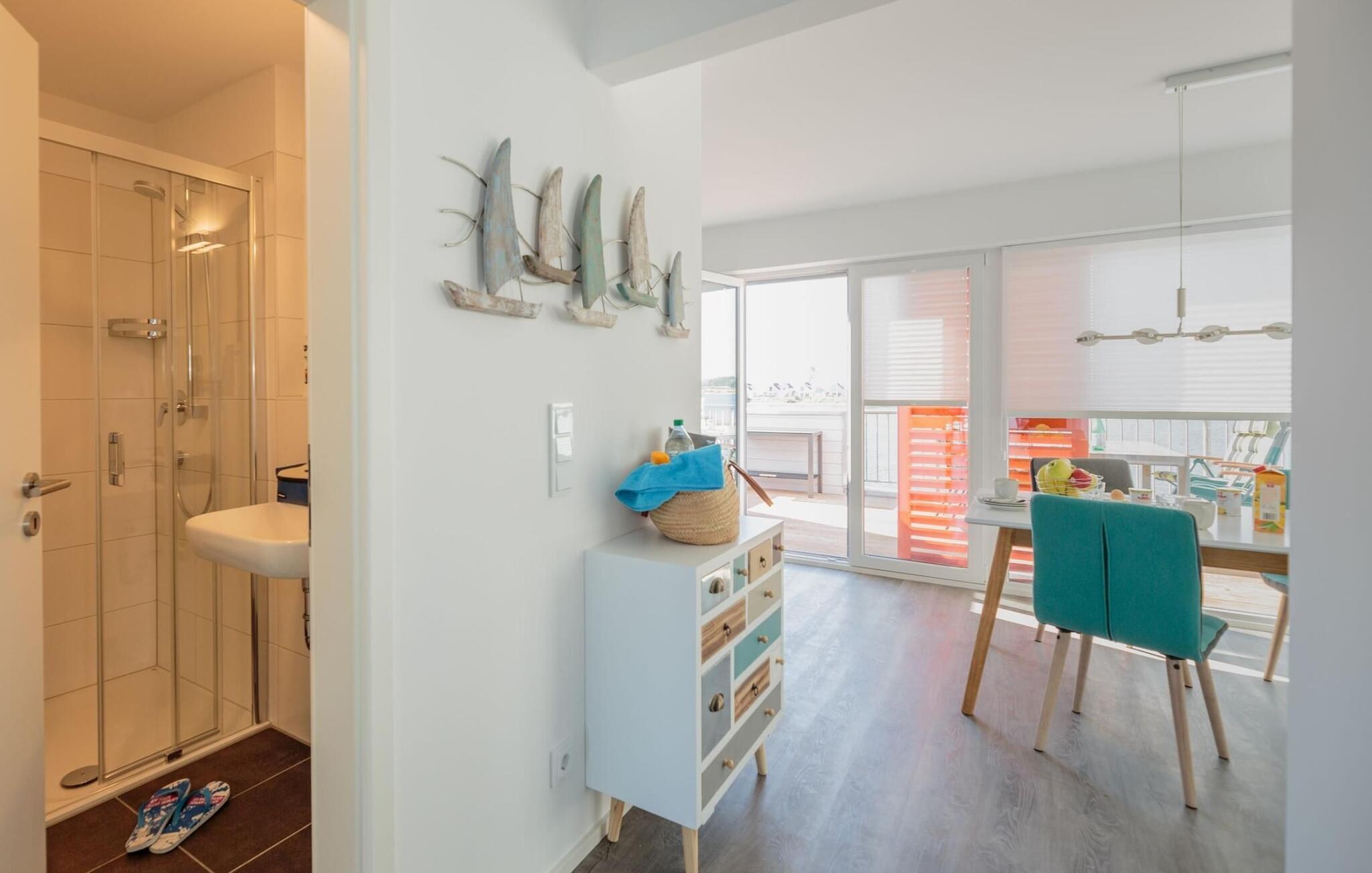 Ferielejlighedens stue/spisestue er oversvømmet af lys med gulv til loft panoramavindue, vand så langt øjet rækker. En fantastisk udsigt åbner op på træterrassen direkte ved siden af spisepladsen med udsigt over sejl- og sportsbådshavnen i OstseeResort Olpenitz. Havnebiograf og sol hele dagen er garanteret og sikrer, at I aldrig keder jer.