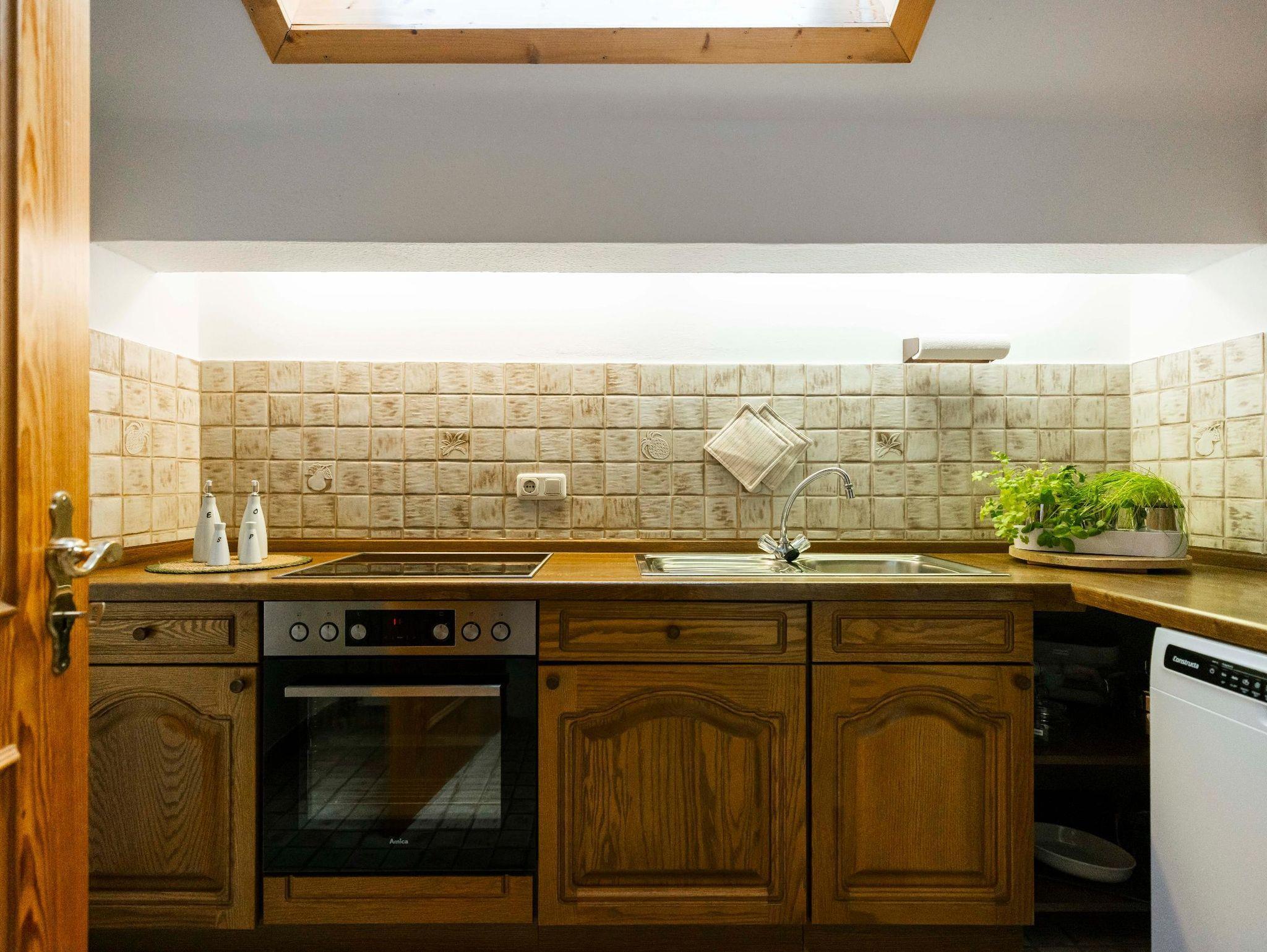 Eine voll ausgestattete Küche mit Geschirrspüler, Filterkaffeemaschine, Wasserkocher, etc.