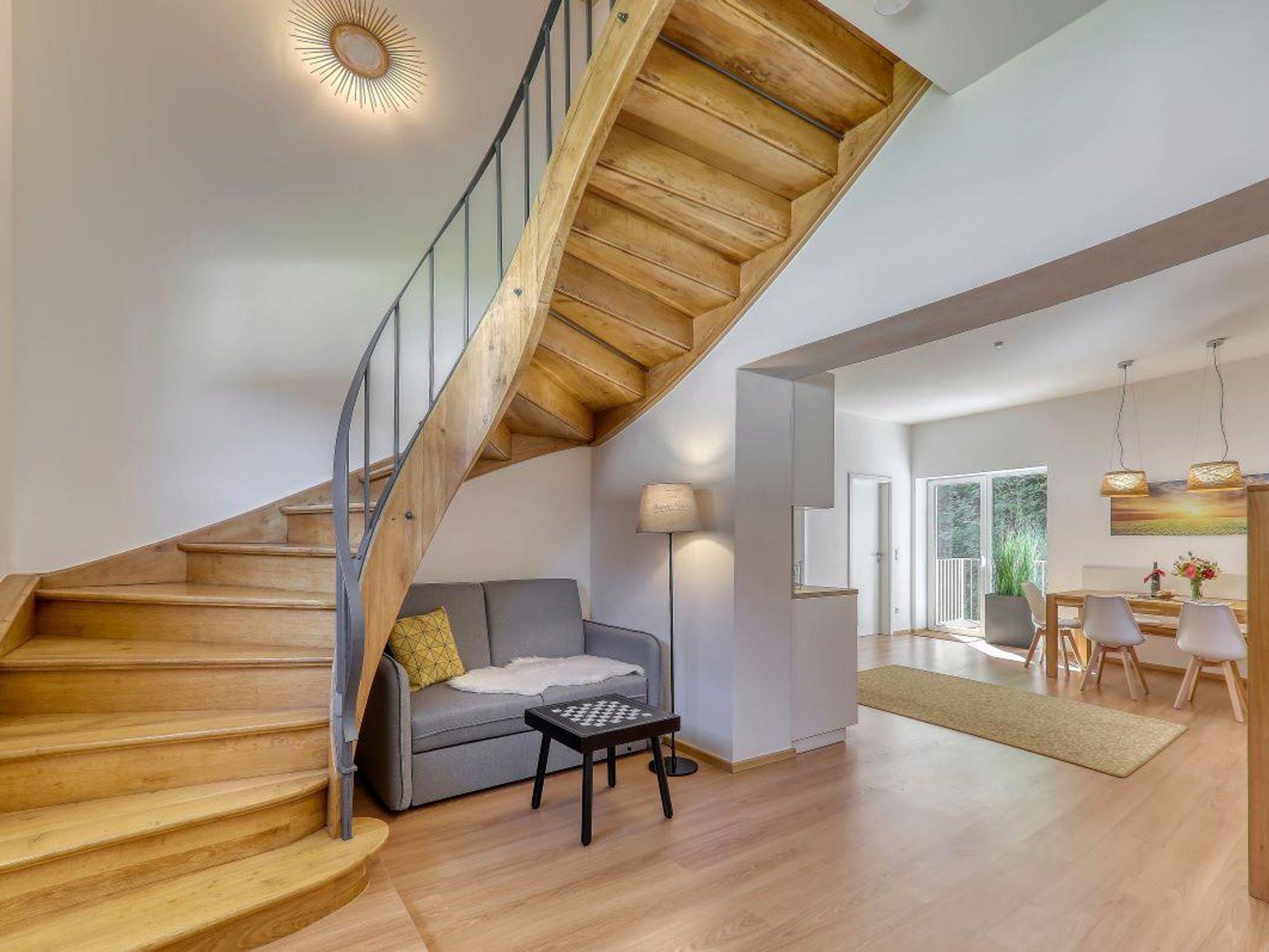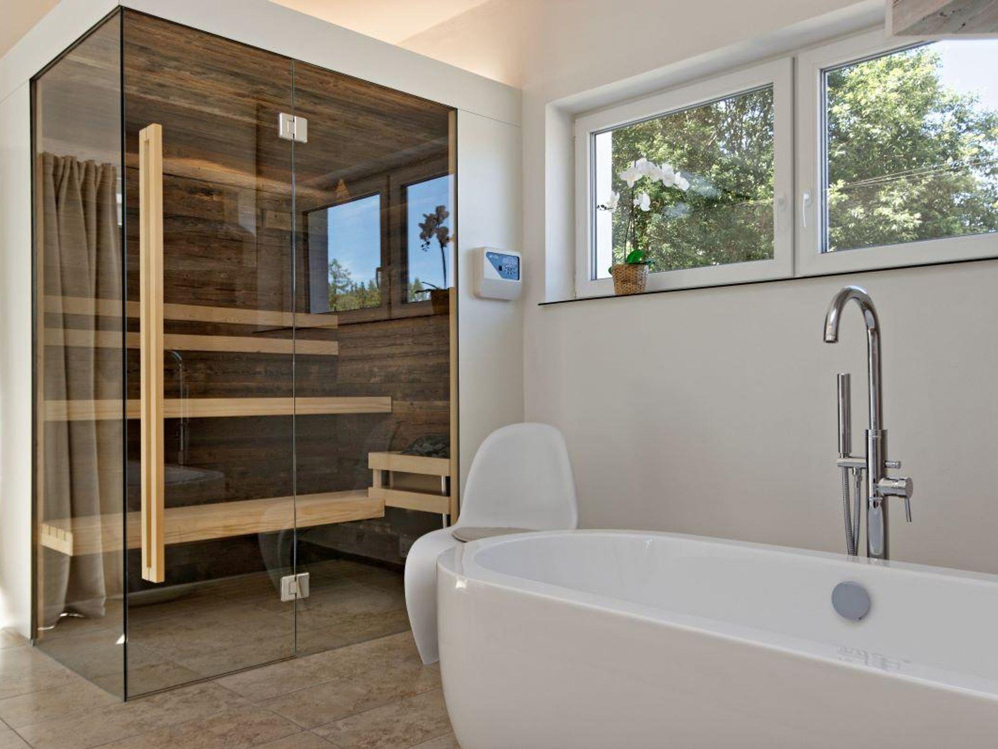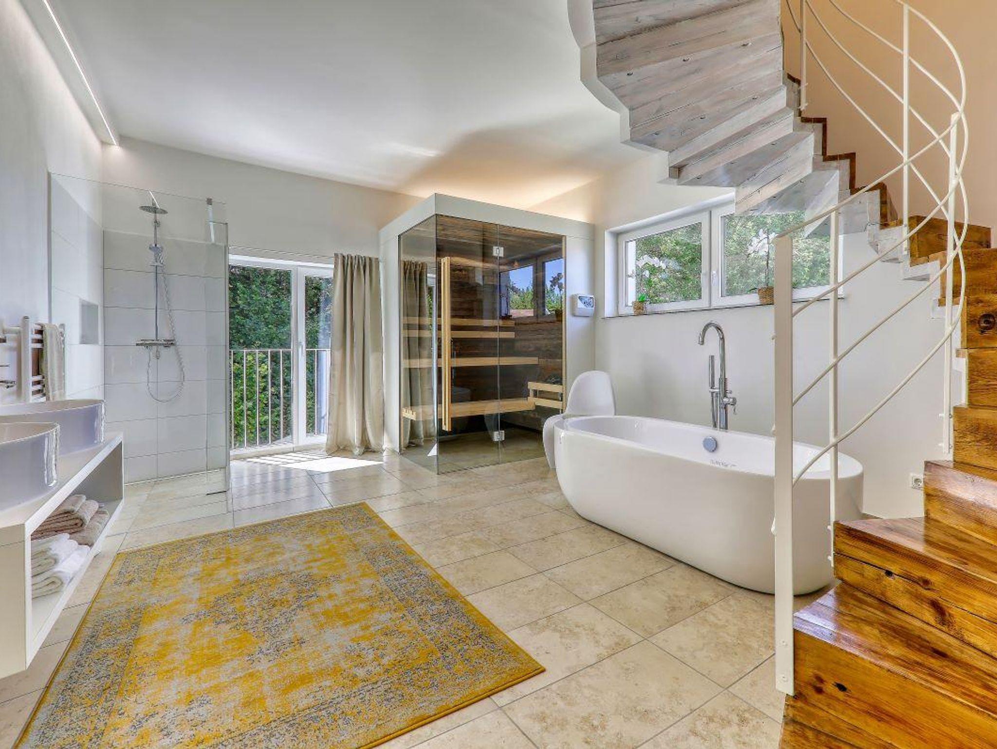 Das Design-Ferienhaus (160 qm) mit großer Sonnenterrasse und Sauna liegt sehr ruhig direkt am Mühlenbach. Es bietet Platz für 2-8 Personen mit 3 Schlafzimmern, 2 Bädern, Saune, großzügigem Wohn- und Essbereich und moderner Einbauküche. Ein Schlafzimmer mit Doppelbett (180 x 200 cm) besitzt ein integriertes eigenes Bad mit großer Dusche, WC und Waschtisch. Das zweite Schlafzimmer ebenfalls mit Doppelbett (180 x 200 cm) und das dritte Schlafzimmer im Turm hat zwei einzelne große Betten (140 x 200 cm). Alle Zimmer bieten einen herrlichen Blick in die Natur und auf den leise plätschernden Mühlenbach. Im großzügigen Wellnessbad erwartet Sie eine freistehende Badewanne, eine Sauna, eine große begehbare Dusche und zwei Waschtische mit Kosmetikspiegel. Vom geräumigen Wohnbereich mit Ledersofa, Kaminofen, kleiner Bibliothek, großem TV und Audio-Anlage sowie vom Essbereich und der Küche gelangen sie direkt auf die Terrasse. Die Küche ist mit allem was man braucht ausgestattet (Herd/Backofen, Kühl/Gefrierschrank, Geschirrspülmaschine, Mikro, Kaffeefiltermaschine, Kapselkaffeemaschine Bosch Tassimo, Toaster, Mixer …). Ein Hochstuhl und ein Kinderreisebettchen wird im Haus auf Wunsch bereitgestellt. Ein Abstell- und ein Waschraum mit Waschmaschine sind vorhanden. Zum Haus gehört ein abschließbare Fahrradgarage und ein Carport mit 2 Stellplätzen.