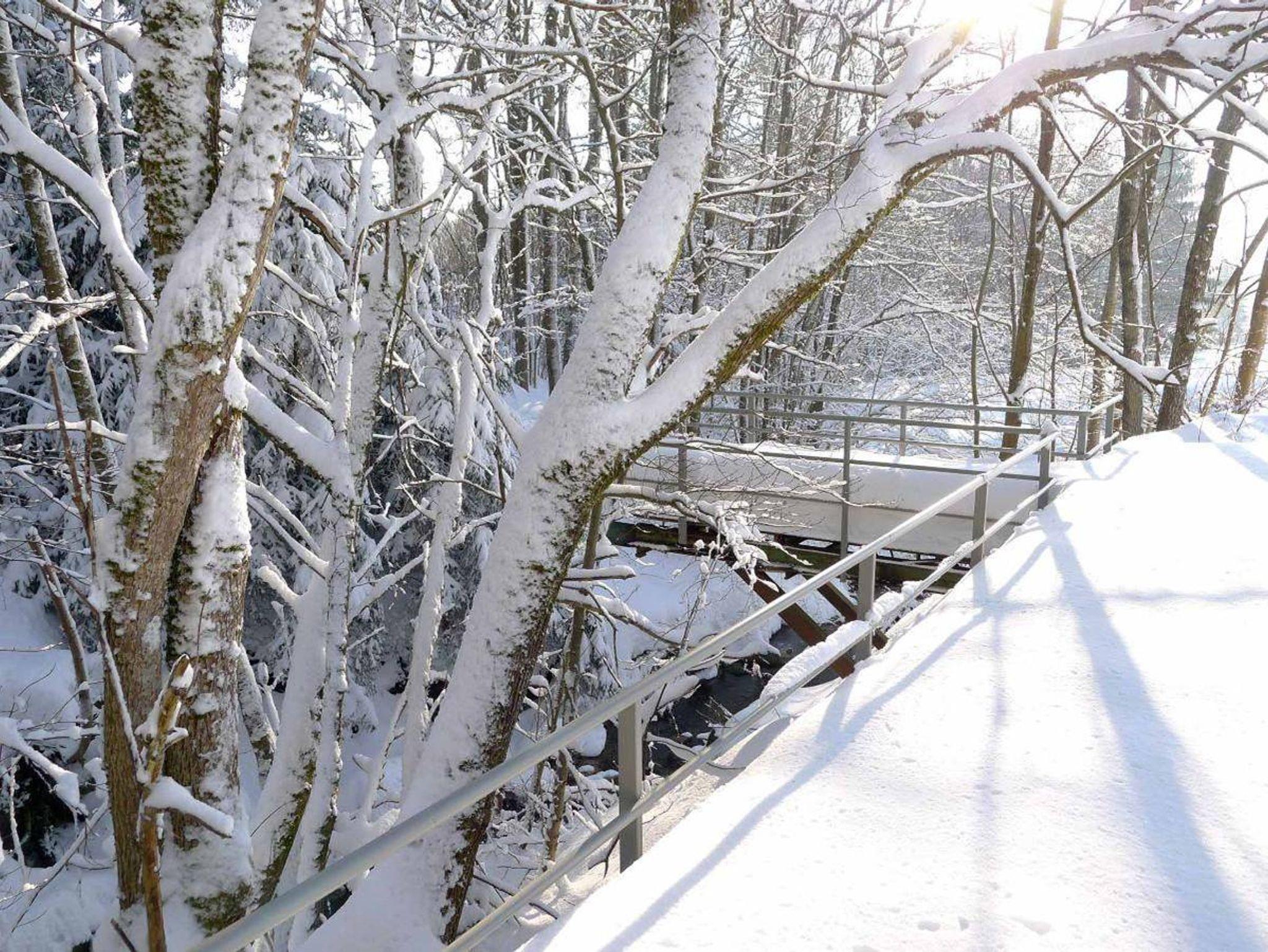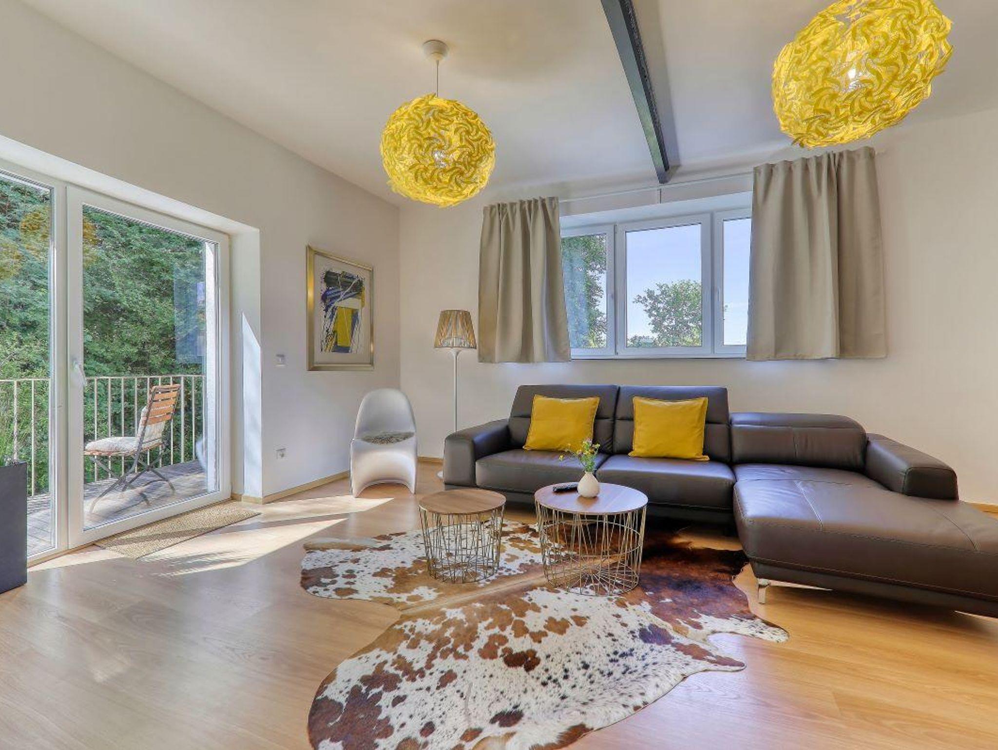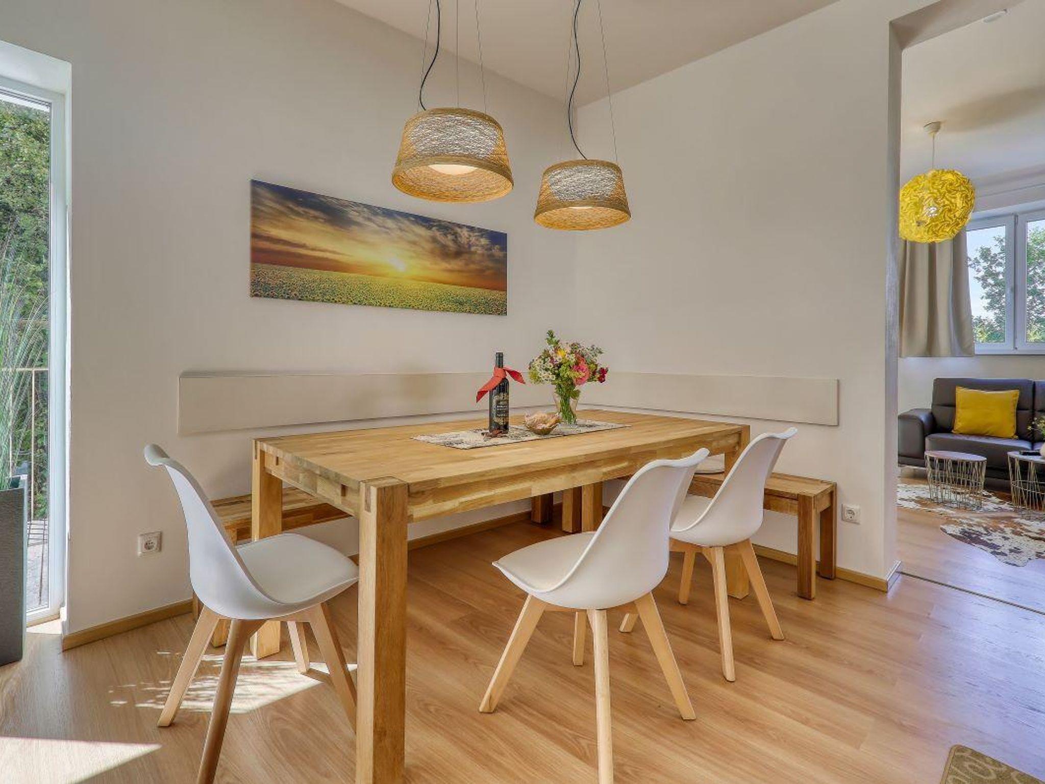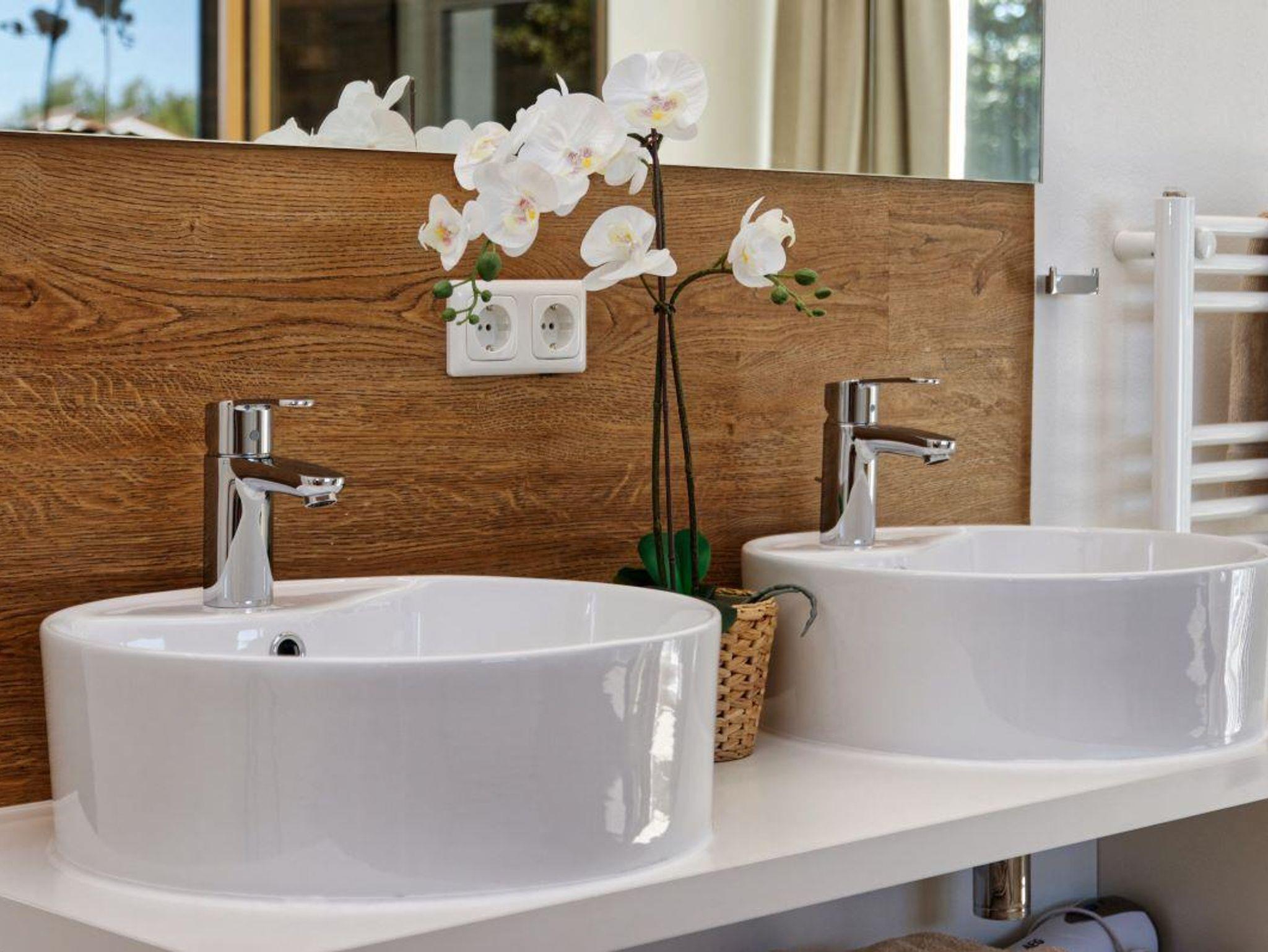 Das Design-Ferienhaus (160 qm) mit großer Sonnenterrasse und Sauna liegt sehr ruhig direkt am Mühlenbach. Es bietet Platz für 2-8 Personen mit 3 Schlafzimmern, 2 Bädern, Saune, großzügigem Wohn- und Essbereich und moderner Einbauküche. Ein Schlafzimmer mit Doppelbett (180 x 200 cm) besitzt ein integriertes eigenes Bad mit großer Dusche, WC und Waschtisch. Das zweite Schlafzimmer ebenfalls mit Doppelbett (180 x 200 cm) und das dritte Schlafzimmer im Turm hat zwei einzelne große Betten (140 x 200 cm). Alle Zimmer bieten einen herrlichen Blick in die Natur und auf den leise plätschernden Mühlenbach. Im großzügigen Wellnessbad erwartet Sie eine freistehende Badewanne, eine Sauna, eine große begehbare Dusche und zwei Waschtische mit Kosmetikspiegel. Vom geräumigen Wohnbereich mit Ledersofa, Kaminofen, kleiner Bibliothek, großem TV und Audio-Anlage sowie vom Essbereich und der Küche gelangen sie direkt auf die Terrasse. Die Küche ist mit allem was man braucht ausgestattet (Herd/Backofen, Kühl/Gefrierschrank, Geschirrspülmaschine, Mikro, Kaffeefiltermaschine, Kapselkaffeemaschine Bosch Tassimo, Toaster, Mixer …). Ein Hochstuhl und ein Kinderreisebettchen wird im Haus auf Wunsch bereitgestellt. Ein Abstell- und ein Waschraum mit Waschmaschine sind vorhanden. Zum Haus gehört ein abschließbare Fahrradgarage und ein Carport mit 2 Stellplätzen.