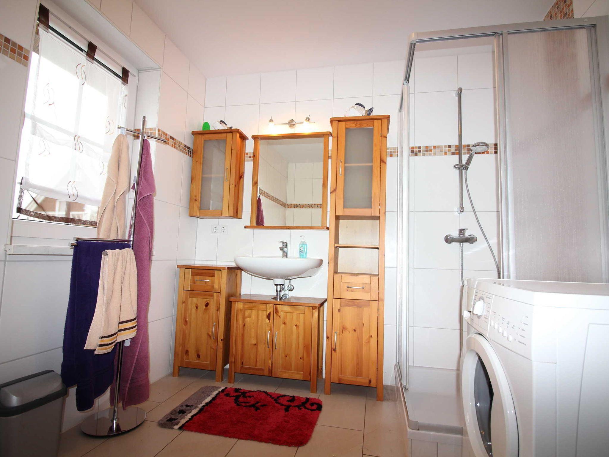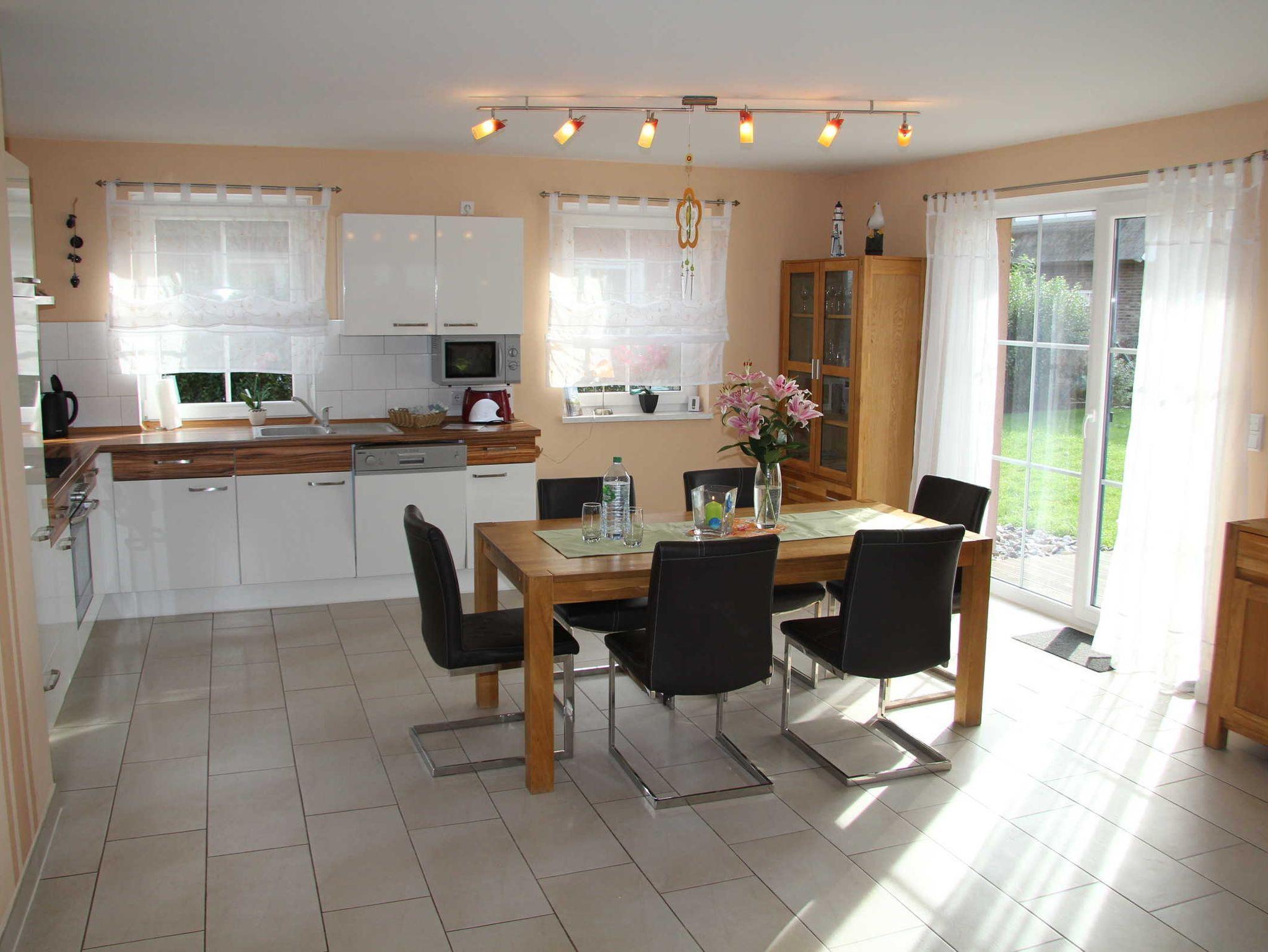 Die moderne Einbauküche ist kompett ausgestattet mit Ceran-Herd und Backofen sowie Spülmaschine. Am separaten Essplatz ist Platz für bis zu 8 Personen. Ebenfalls befindet sich im Erdgeschoss ein Bad mit Dusche und WC.