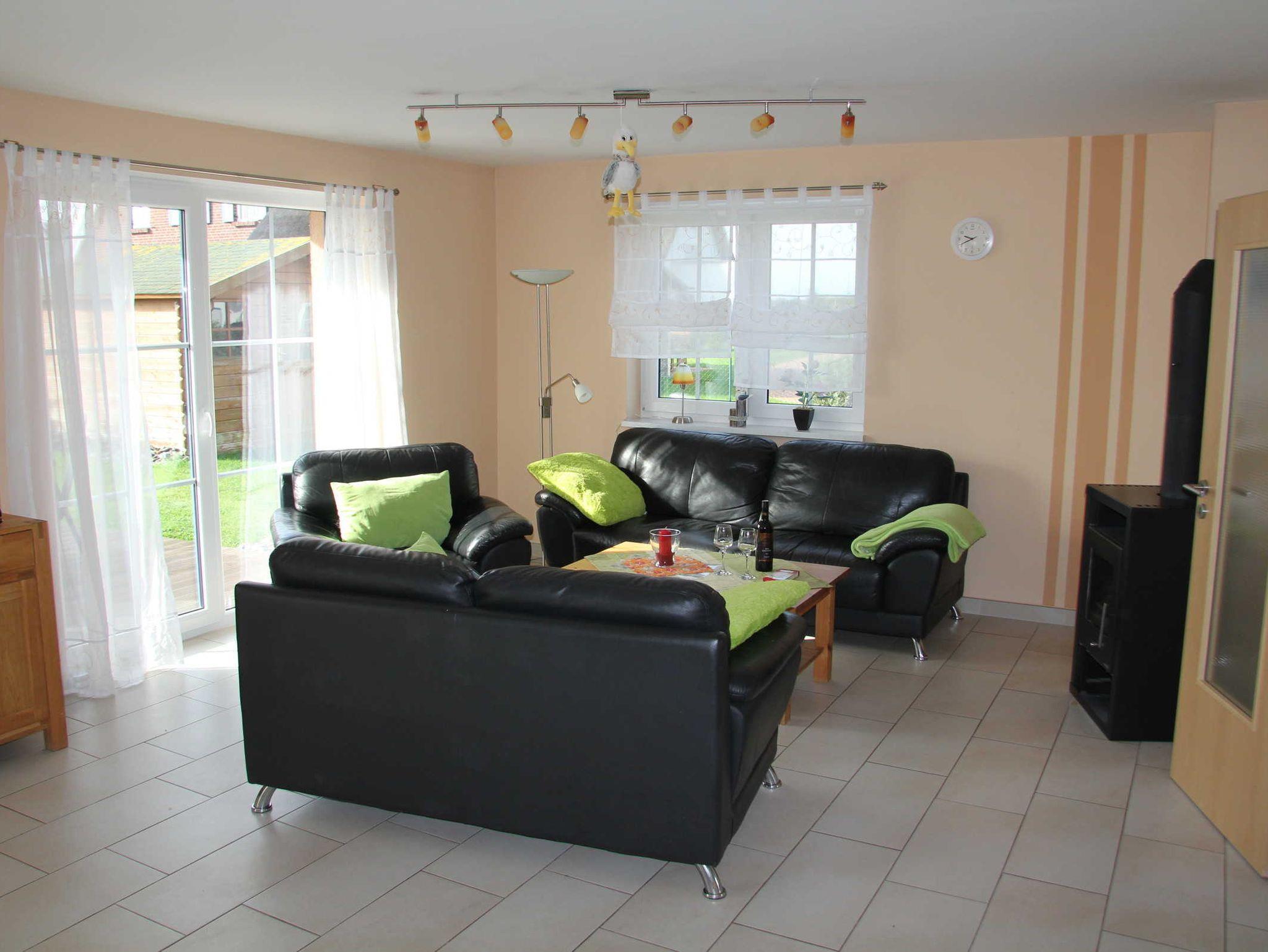 Im Erdgeschoss des Ferienhauses befindet sich ein großzügiger Wohn- und Essraum mit gemütlicher Sitzecke und Kaminofen, Sat-TV, Radio/CD und DVD. Die großen französischen Fenster bieten viel Tageslicht und gleichzeitig den Ausgang zur großen Terrasse am Haus.