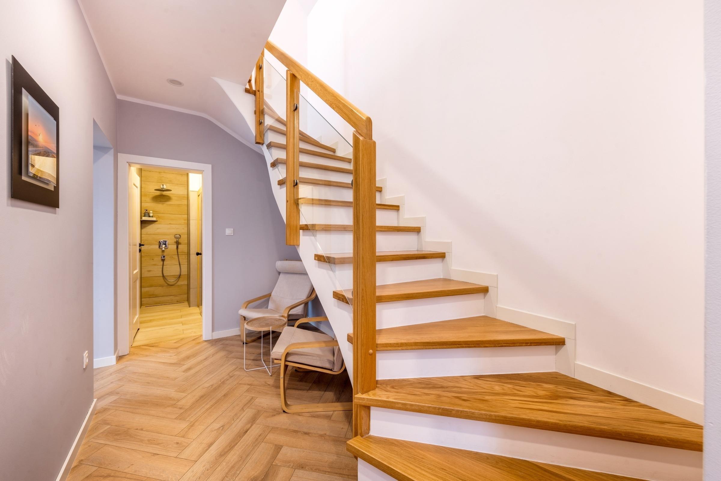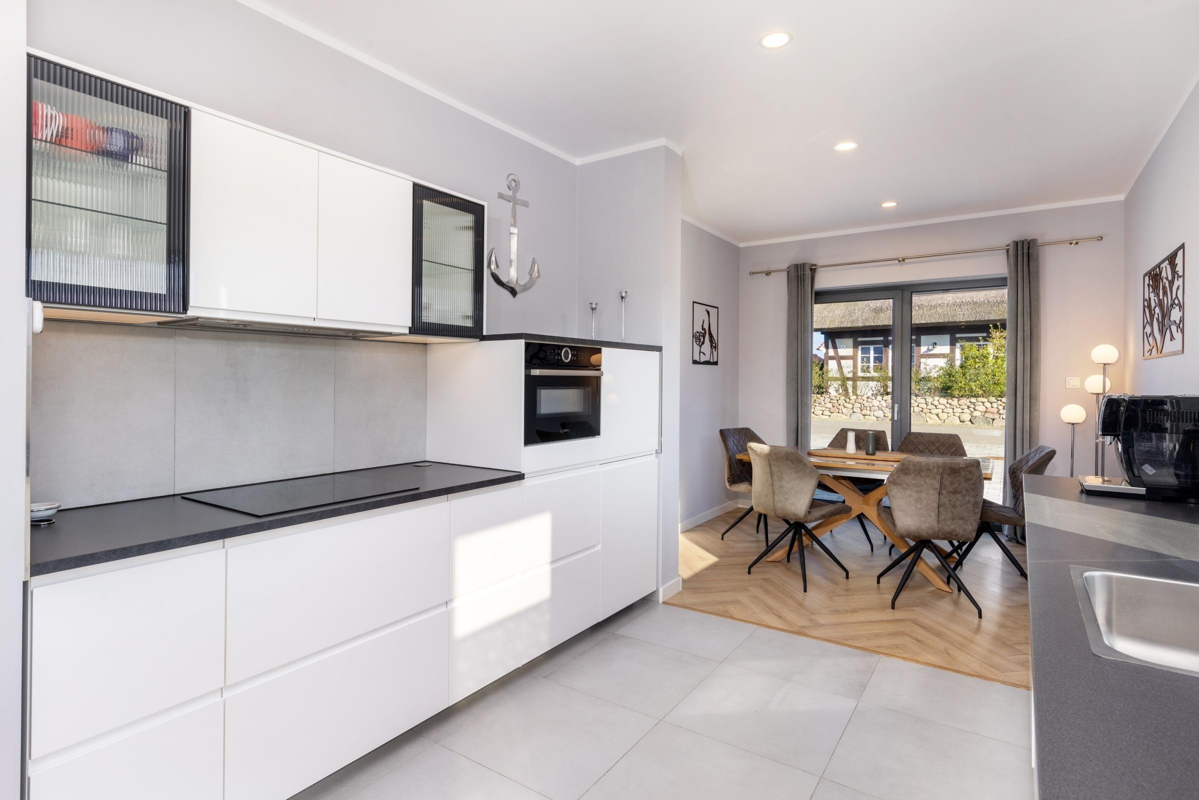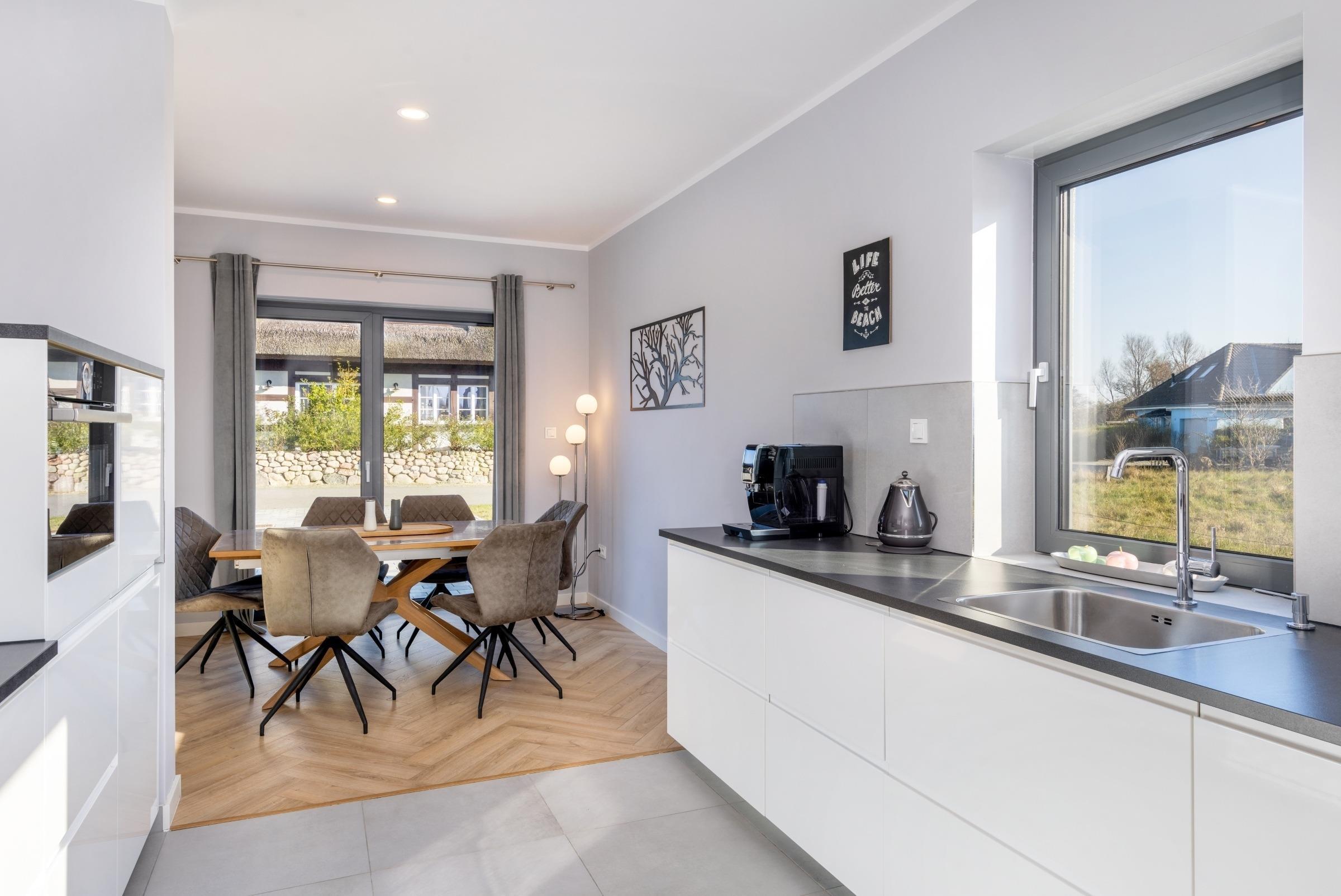Die offene, moderne Küche bietet Ihnen alles, was Sie in Ihrem Urlaub zum Kochen benötigen. Die gemütliche Atmosphäre im Wohnbereich ist ideal für Familie und Freunde und ist mit einem großen Smart-TV ausgestattet. An kalten Tagen und Abenden sorgt der Kamin für kuschelige Wohlfühlatmosphäre. Die Sauna mit Dusche erreichen Sie direkt vom Flur aus.