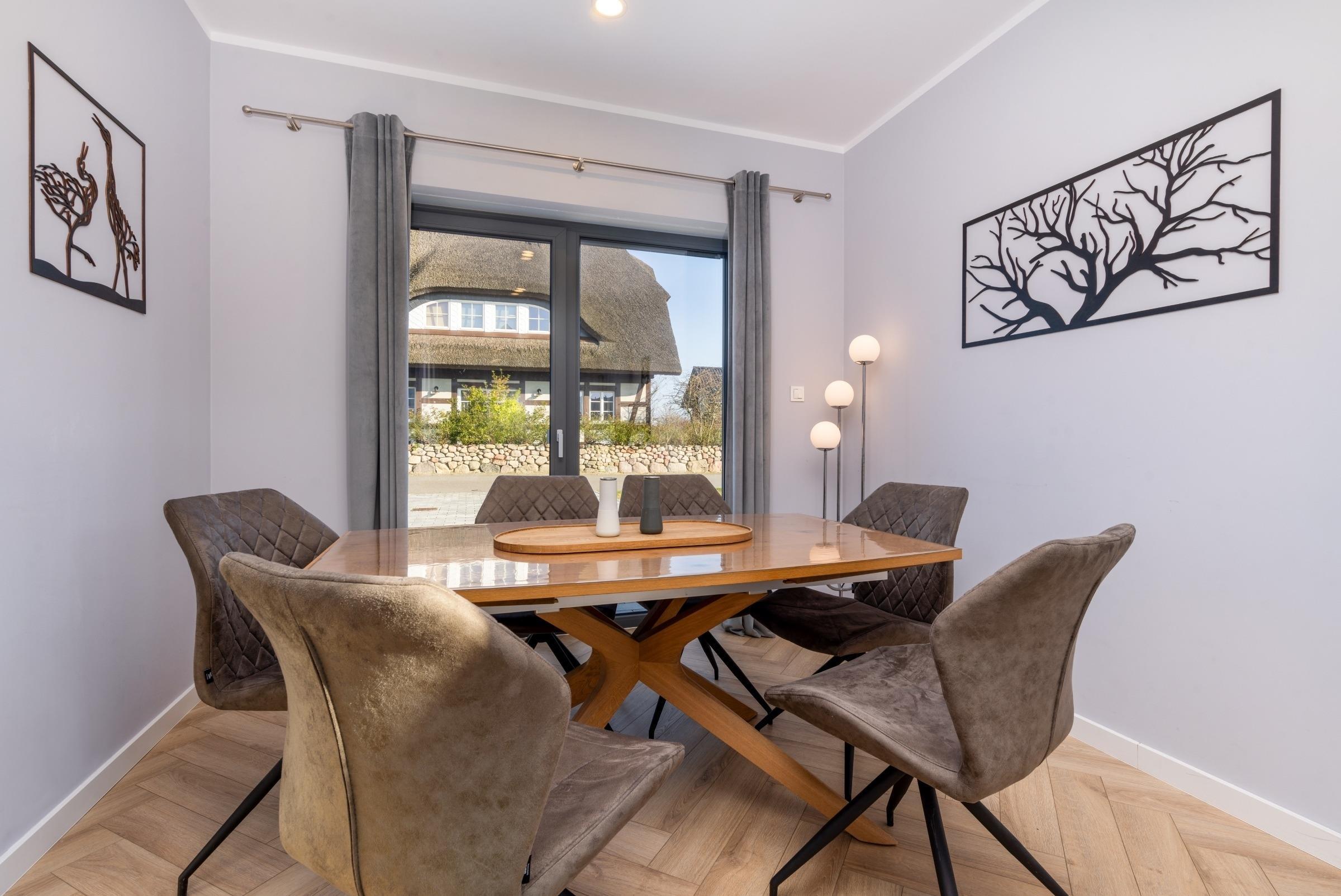 Sie finden auf 2 Ebenen alles, was für einen gelungenen Urlaub notwendig ist. Die Wohnfläche beträgt ca. 110 m². Betreten wird das Ferienhaus über den Eingang im Erdgeschoss. Von dort aus gelangen Sie in die Küche, Gäste-WC, sowie auch in den besonders lichtdurchfluteten Ess- und Wohnbereich, mit einer gemütlichen Couch. Im Erdgeschoss finden Sie Ihre ganz private Sauna, eine moderne und vollausgestattete Küche sowie ein gemütliche Wohn-/Essbereich mit Panoramakamin, für gemütliche Stunden in der kühleren Jahreszeit. Ebenso einen großen Esstisch, der auch gern zu Spieleabenden einlädt. Genießen Sie die gemeinsame Zeit am großen Esstisch für 6 Personen.