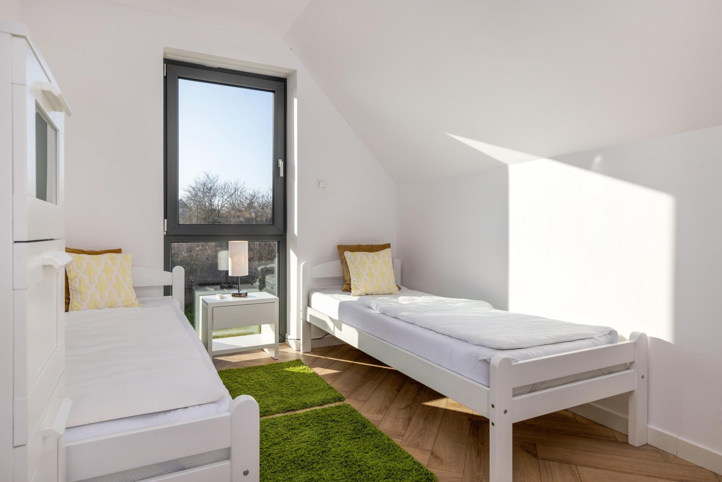 Im Obergeschoss befinden sich insgesamt drei Räume, die als Schlaf- und Aufenthaltsräume für Eltern und Kinder ausgestattet sind, sowie ein großes Badezimmer mit Wanne, ebenerdige Dusche, Doppelwaschtisch und WC.
