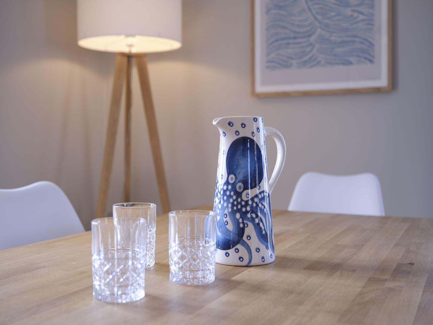 Freuen Sie sich in dieser luxuriösen Villa auf ein Frühstück auf der privaten Terrasse, einen gemütlichen Kaminabend und einen entspannten Saunabesuch in der hauseigenen Sauna mit Duschbad. Ein großzügiger Wohnraum kombiniert das Wohnzimmer mit Kamin, LCD-Flachbildschirm, DVD-Player und Stereo-Anlage mit dem Essbereich und einer Qualitätsküche. Diese ist voll eingerichtet und bietet einen Geschirrspüler, einen Backofen, ein Kochfeld, eine Mikrowelle, einen Kaffeevollautomat, einen Wasserkocher und einen Toaster. Drei Schlafzimmer, eines mit großem Doppelbett, die anderen mit je einem 160cm Doppelbett, verfügen zusätzlich über genügend Verstaumöglichkeiten. Das Vollbad überzeugt mit einer Badewanne, einer geräumigen Dusche, einem Waschbecken, einem WC und einem großen Spiegel. Zusätzlich gibt es ein Gäste-WC und eine Waschmaschine sowie einen Trockner.