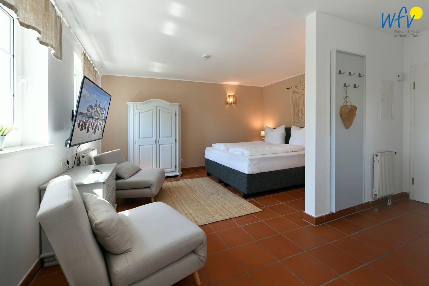 Die Ferienanlage umfasst 23 Ferienwohnungen. In unserem 31 m² großen Appartement "Sandglöckchen" im 1. Obergeschoss erwartet Sie ein Wohnraum mit Sitzgelegenheiten, Doppelbett (180 cm x 200 cm), kleiner Kochnische und Essplatz sowie ein Duschbad.