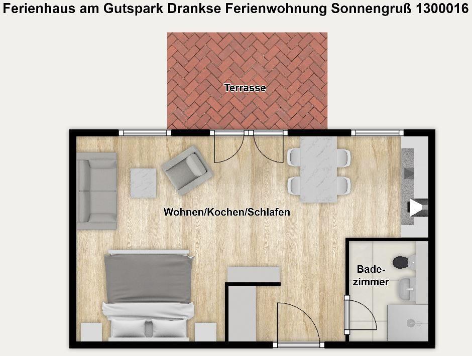 Ferienhaus am Gutspark Dranske: Komfortable Ferienwohnung Sonnengruß mit Terrasse