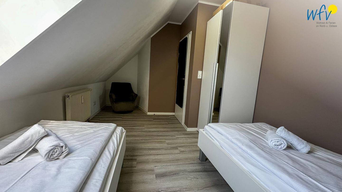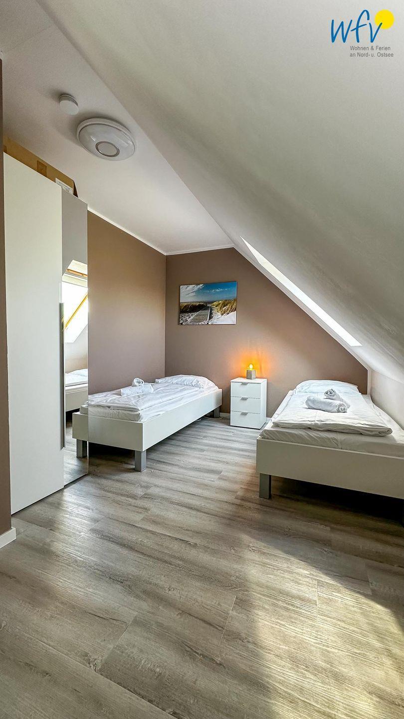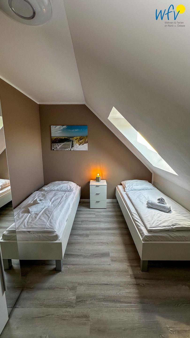 Wenn auf Rügen die Sonne untergeht, können Sie sich auf der zweiten Etage in die zwei separaten Schlafzimmer zurückziehen. Eines der Zimmer ist mit einem Doppelbett ausgestattet, das andere mit zwei Einzelbetten (je 90 x 200 cm). Zwei weitere Personen finden auf dem Sofa im Wohnraum Platz, das sich schnell und einfach zu einer komfortablen Schlafcouch umwandeln lässt.