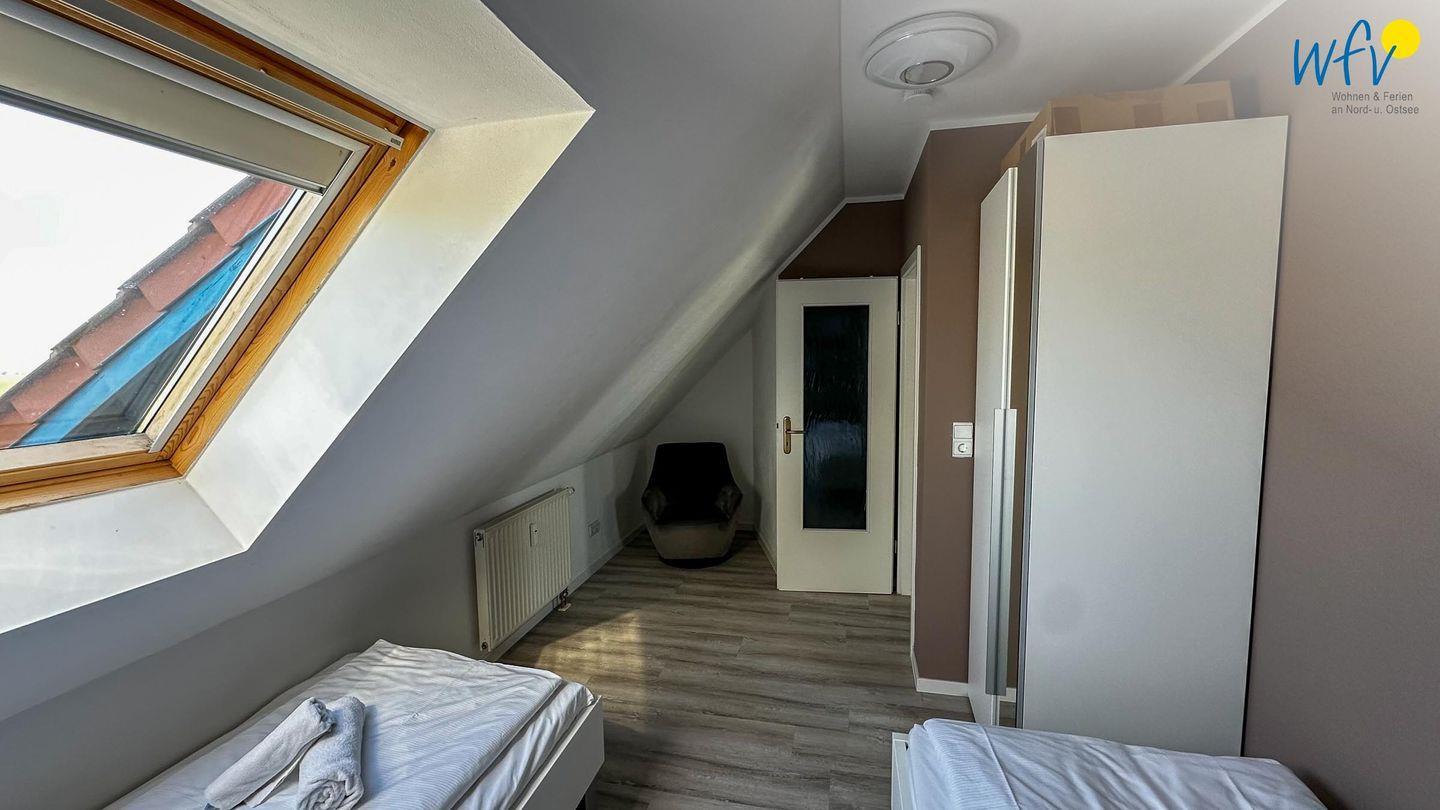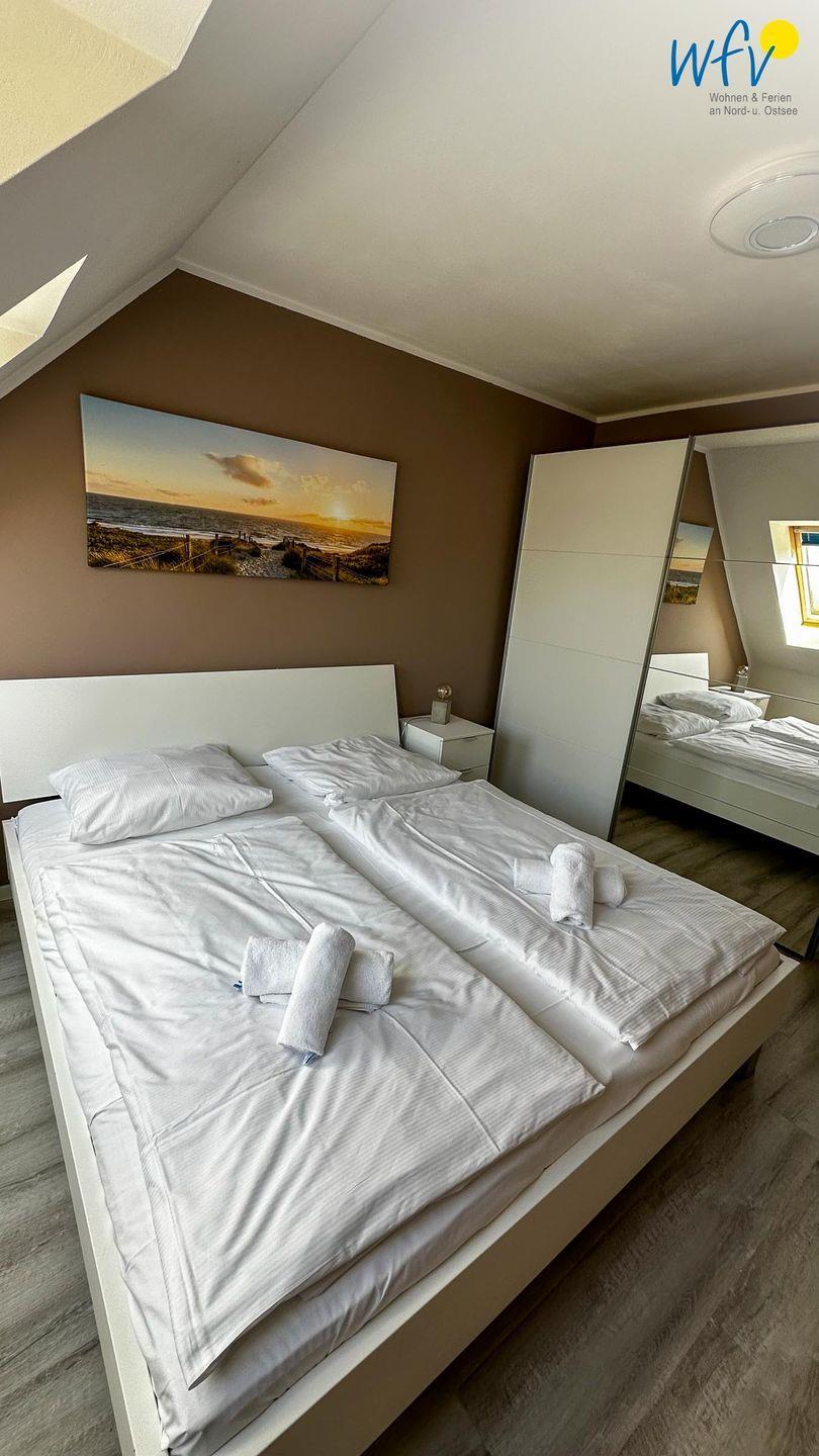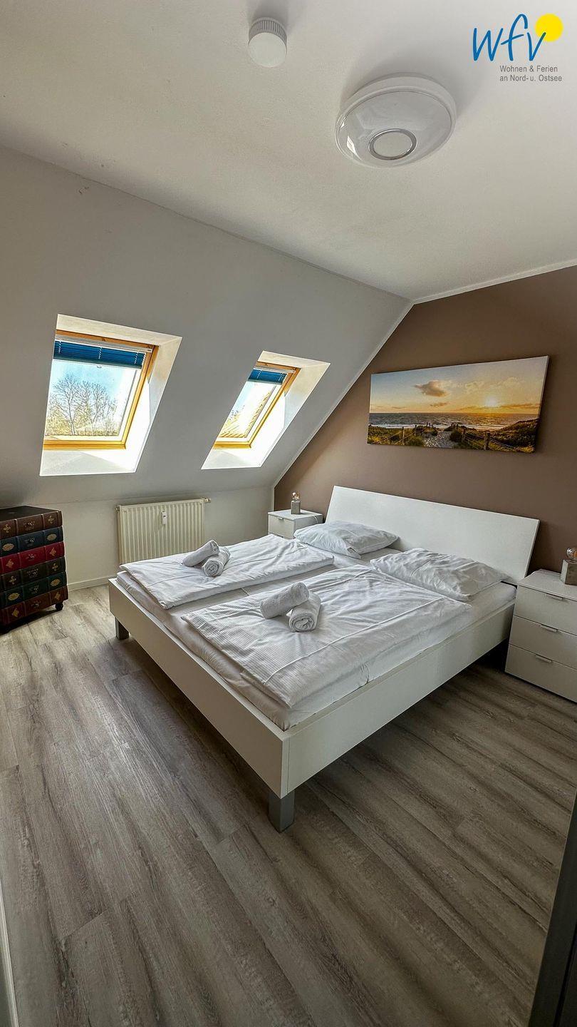 Wenn auf Rügen die Sonne untergeht, können Sie sich auf der zweiten Etage in die zwei separaten Schlafzimmer zurückziehen. Eines der Zimmer ist mit einem Doppelbett ausgestattet, das andere mit zwei Einzelbetten (je 90 x 200 cm). Zwei weitere Personen finden auf dem Sofa im Wohnraum Platz, das sich schnell und einfach zu einer komfortablen Schlafcouch umwandeln lässt.