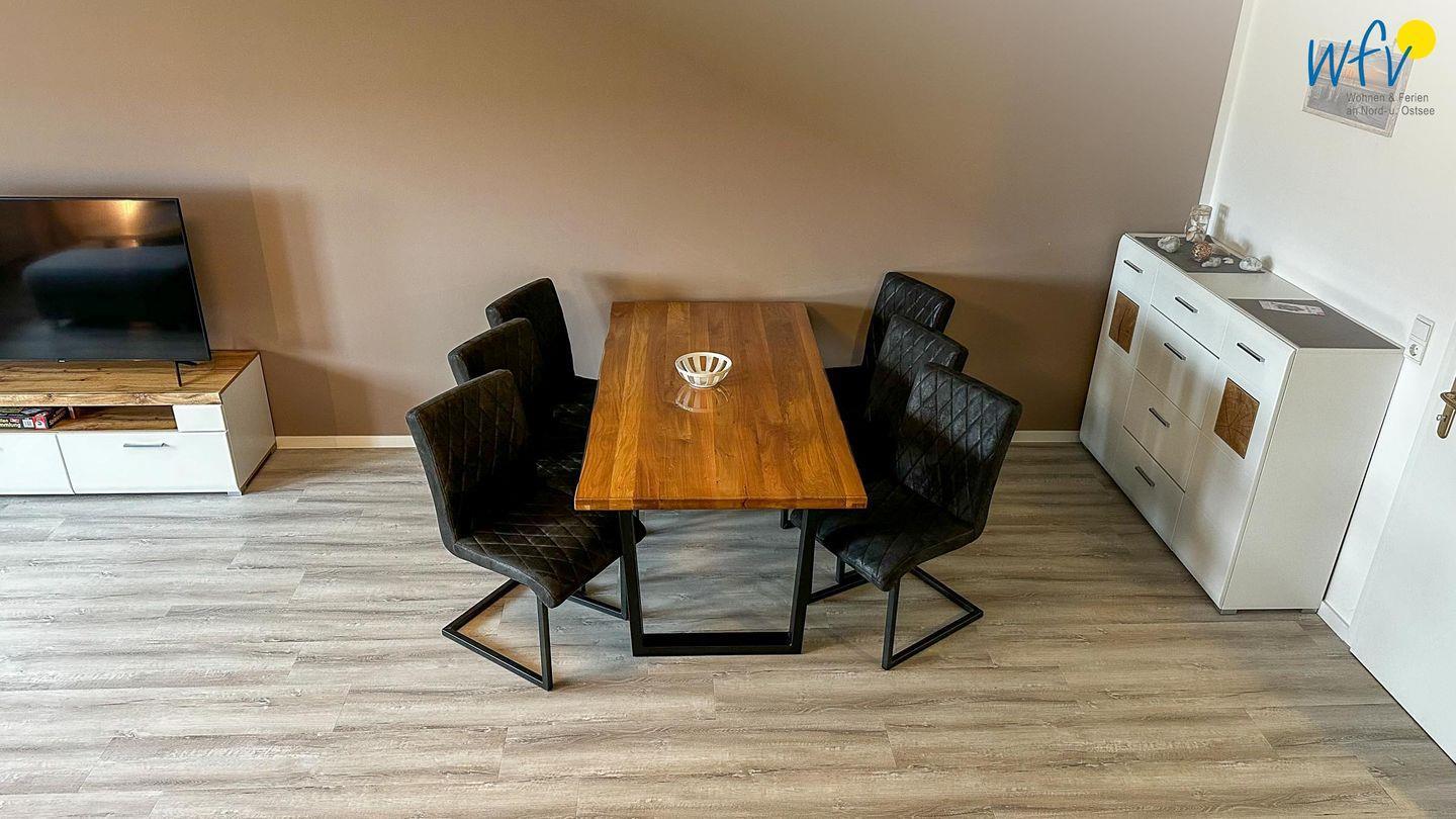 Die offene, modern eingerichtete Küche ermöglicht Ihnen eine bequeme Selbstverpflegung. Mit Cerankochfeld und Backofen lassen sich hier Ihre Lieblingsgerichte zubereiten, den Abwasch übernimmt die Spülmaschine. Der Essbereich mit großem Esstisch lädt dazu ein, gemeinsame Mahlzeiten mit der Familie oder mit Freunden zu genießen.