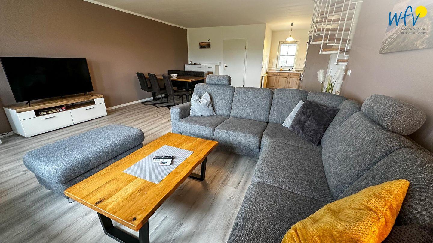 Genießen Sie in der Maisonette-Ferienwohnung modernes Wohnen über zwei Etagen. In der ersten Etage empfängt Sie ein Ensemble aus offenem Wohnraum mit Sofaecke, Essbereich und integrierter Küche, das sich harmonisch miteinander verbindet und für ein weites Raumgefühl sorgt. Hier können Sie sich nach einem erlebnisreichen Tag zurücklehnen, entspannen und gemeinsame Zeit verbringen. Zudem bietet die Sofaecke ausreichend Raum und Gemütlichkeit, um die Abende angenehm ausklingen zu lassen. Ein modernes TV und ein Radio sind vorhanden, zudem empfangen Sie kostenlos freies WLAN.