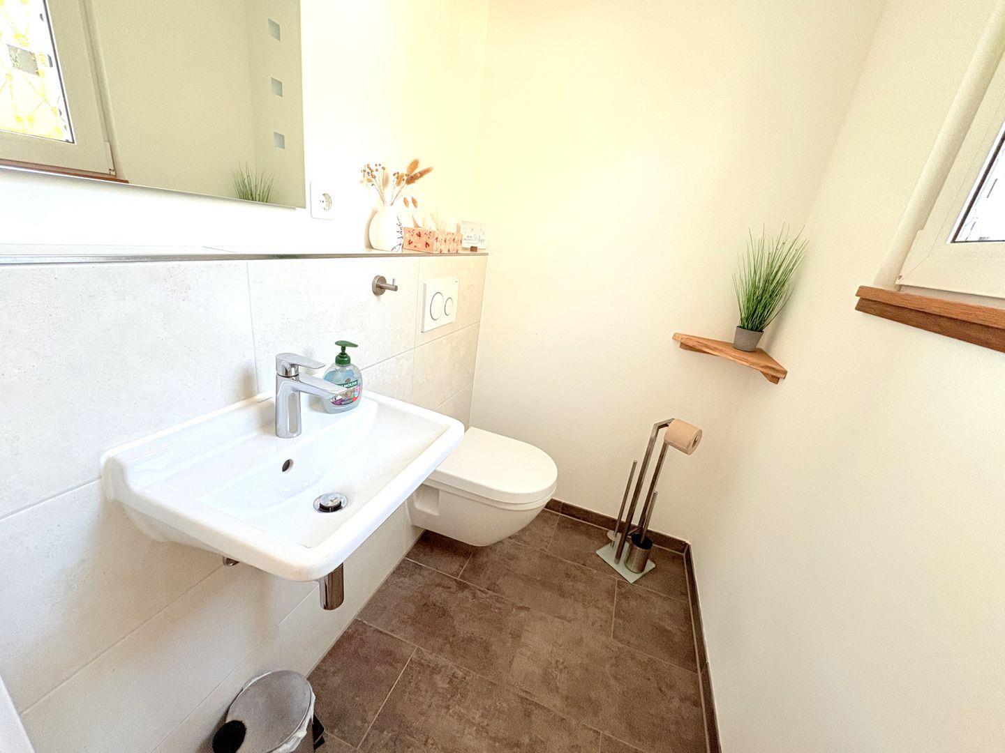 Im Erdgeschoss befindet sich ein Wohnraum mit offener Küche und Esszimmer sowie ein Gäste-WC.