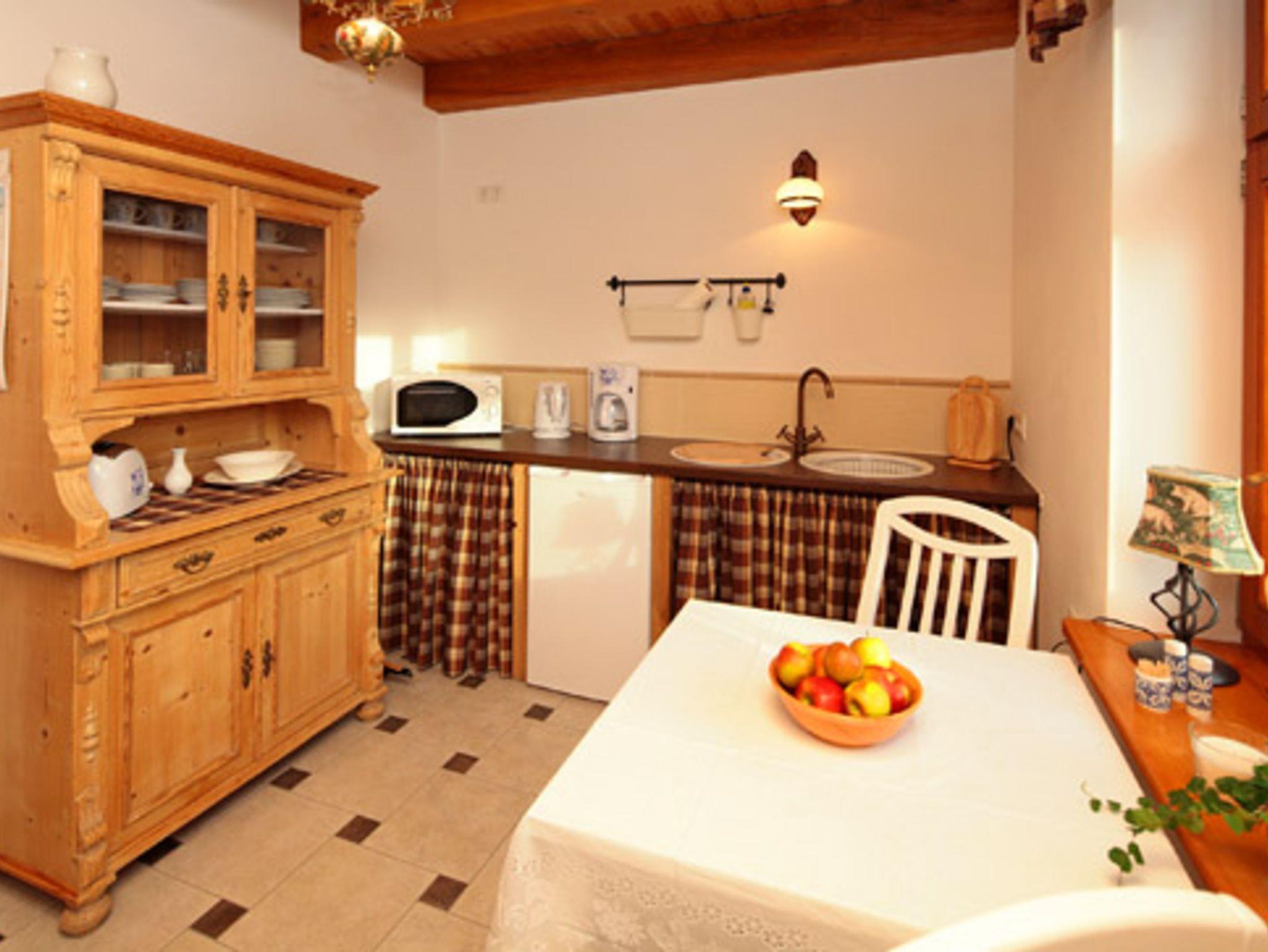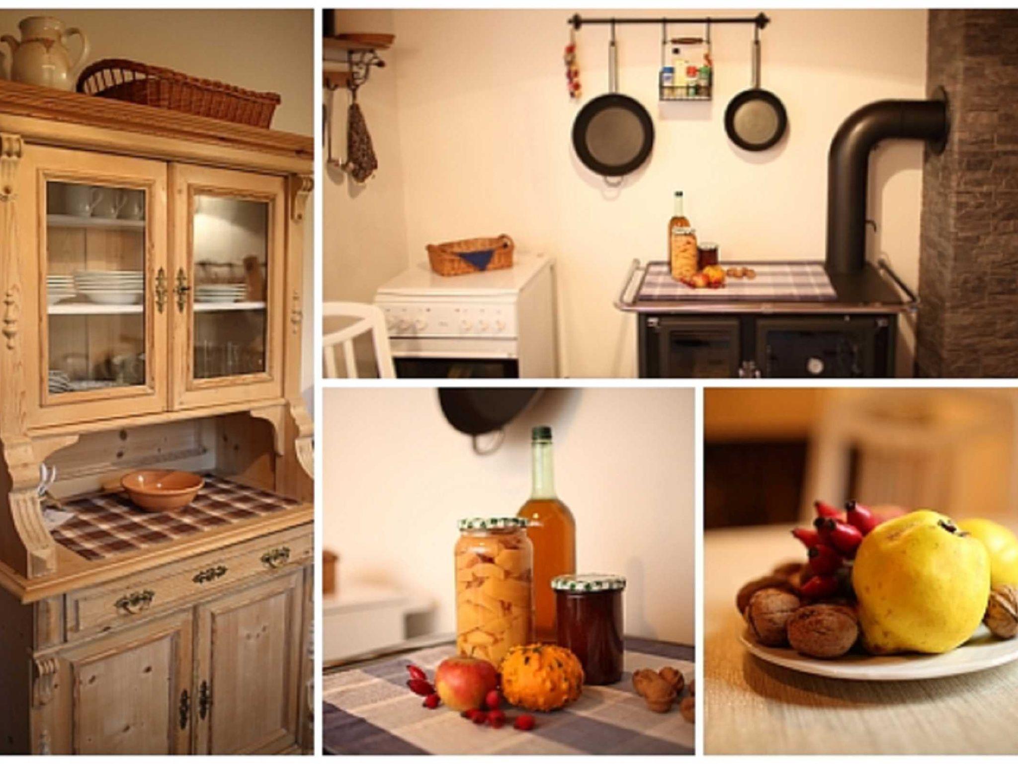 In der komplett eingerichteten Wohnküche finden Sie alles, was man benötigt. Alle wichtigen Elektrogeräte, wie E-Herd, Wasserkocher, Kaffeemaschine, Kühlschrank, Mikrowelle und Toaster, Töpfe, Besteck und Geschirr sind vorhanden.