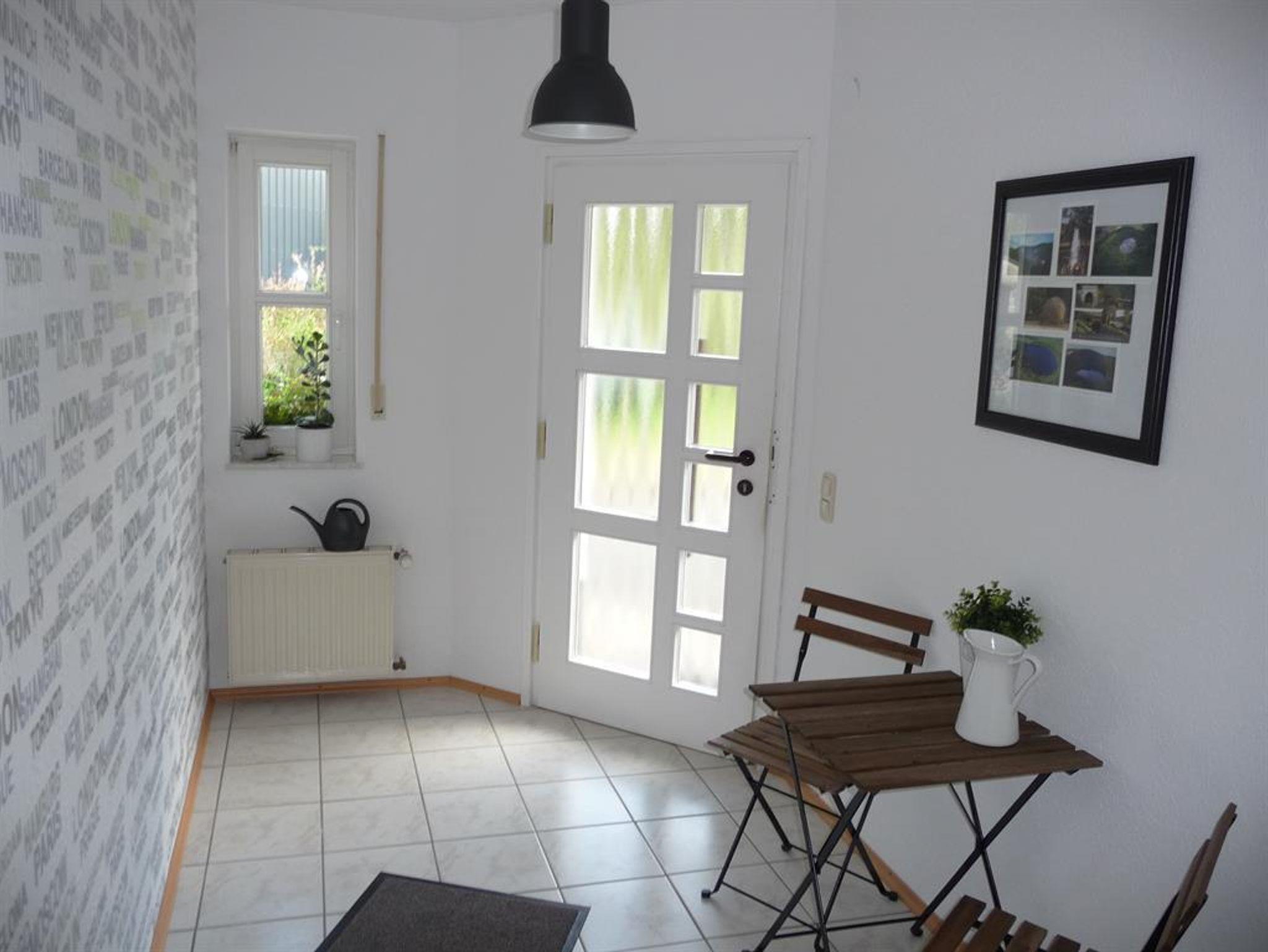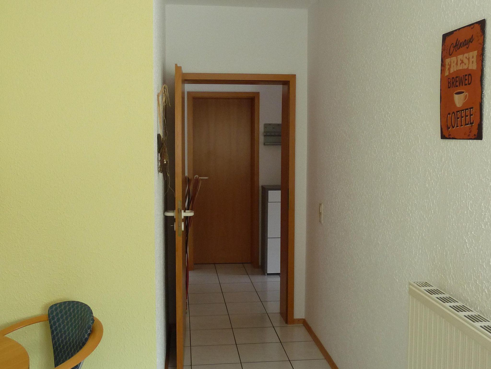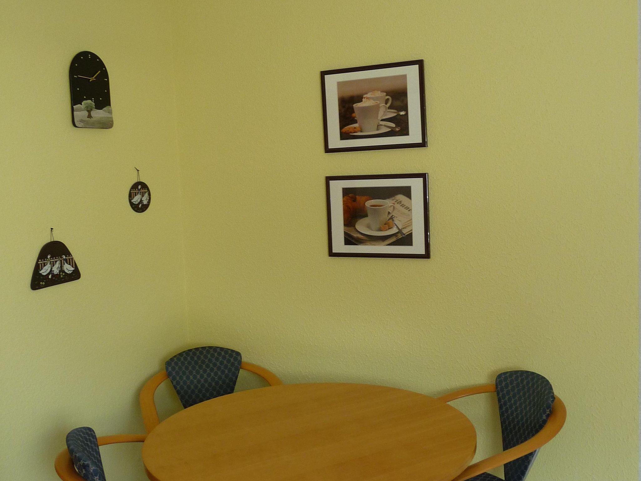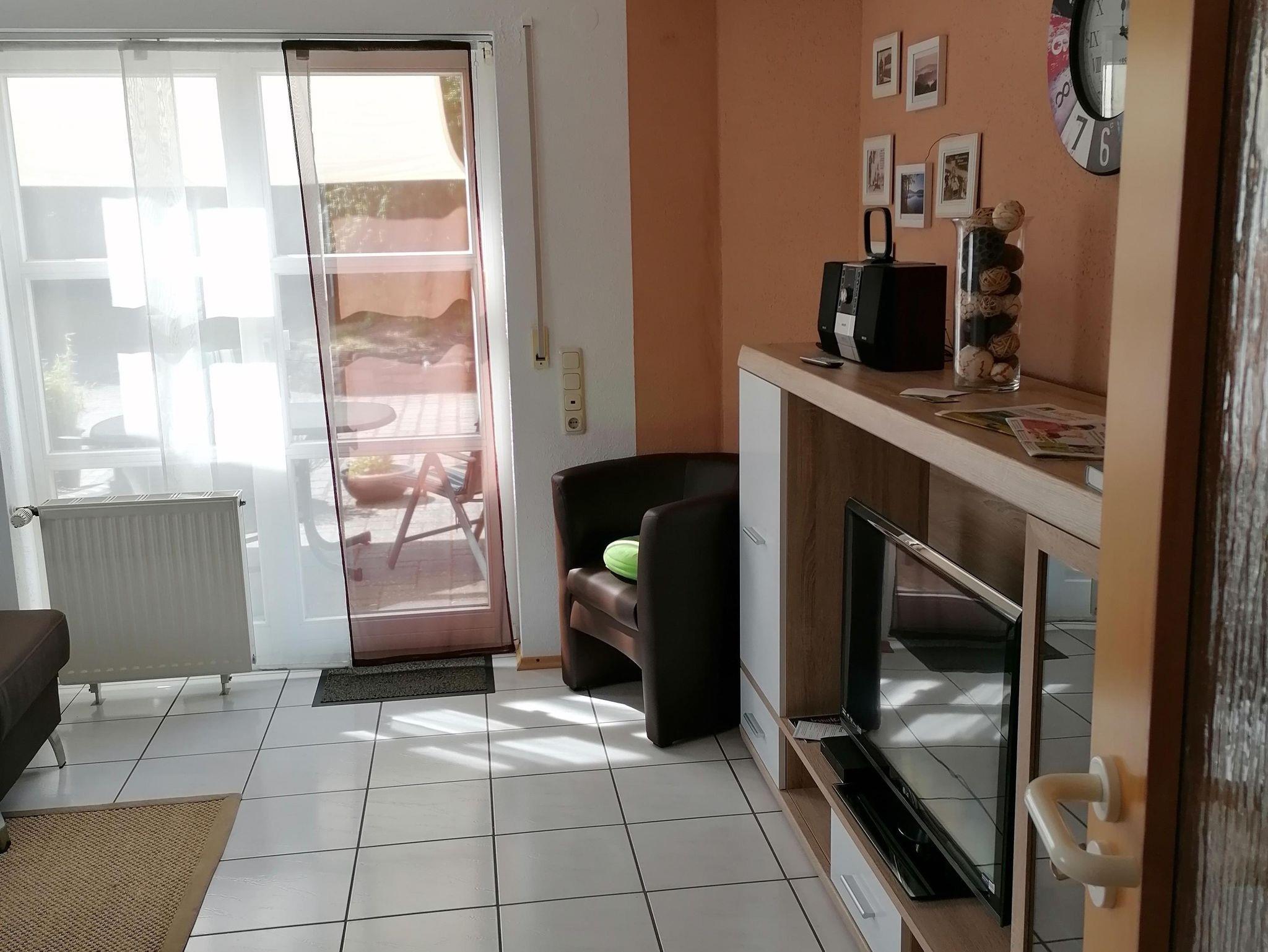 Die Wohnung im Erdgeschoss verfügt neben der Eingangsdiele über ein Schlafzimmer, eine Essküche mit separatem Spind, ein geräumiges behindertengerechtes Badezimmer sowie ein Wohnzimmer mit Zugang zur Terrasse. Im Schlafzimmer befindet sich ein Doppelbett. Im Wohnzimmer, das mit Flachbildschirm, Stereoanlage und Internetzugang ( Telekom Hotspot ) ausgestattet ist, können 2 Personen auf einer Schlafcouch übernachten. So haben in der Wohnung max. 4 Personen Platz.