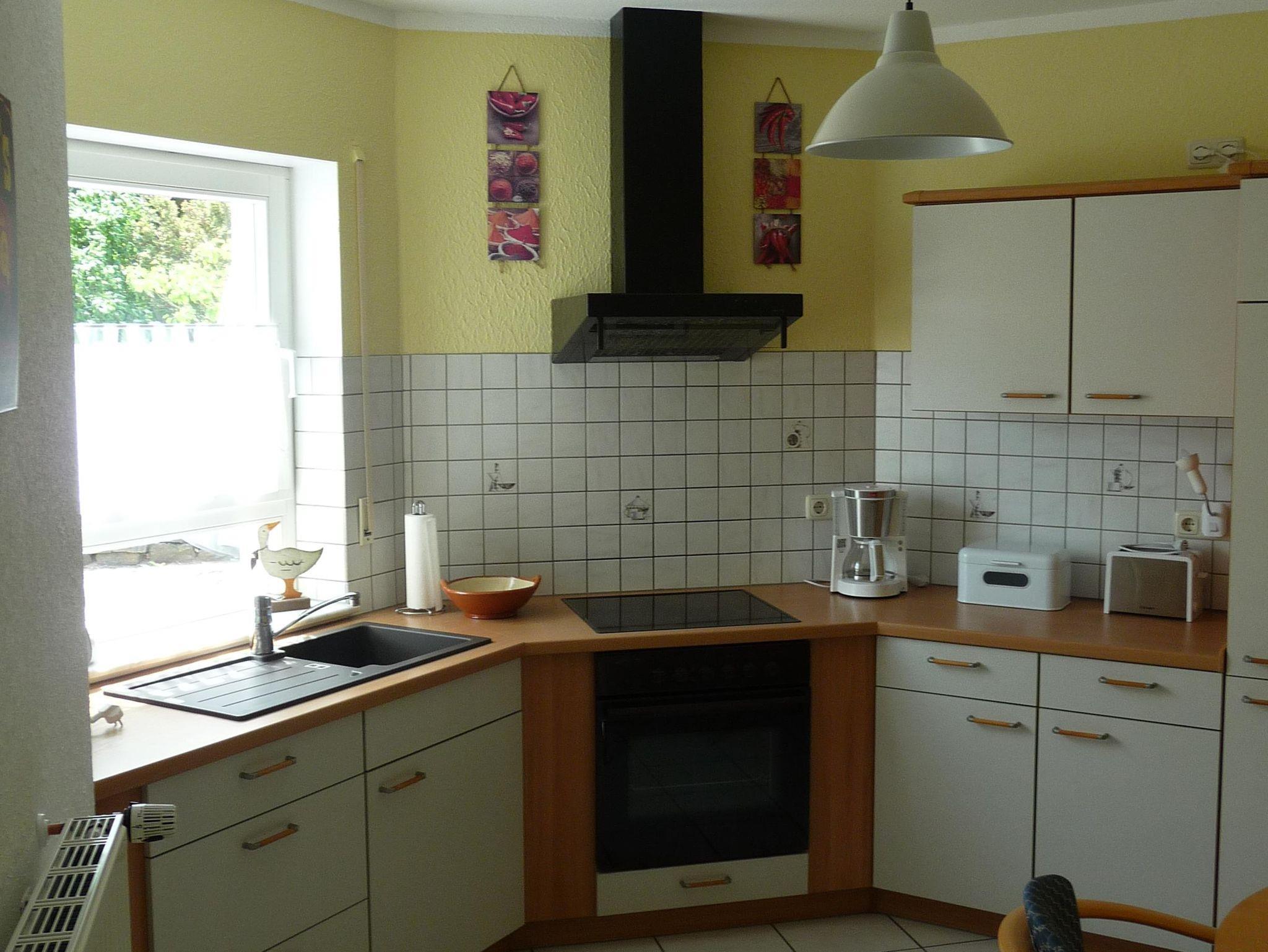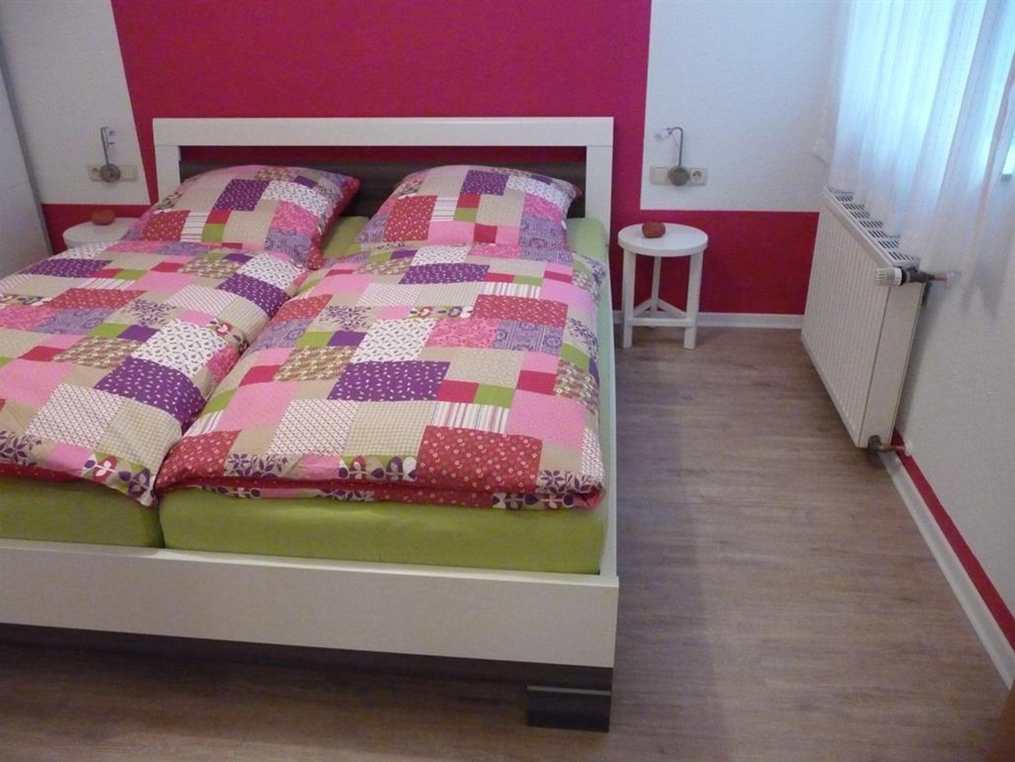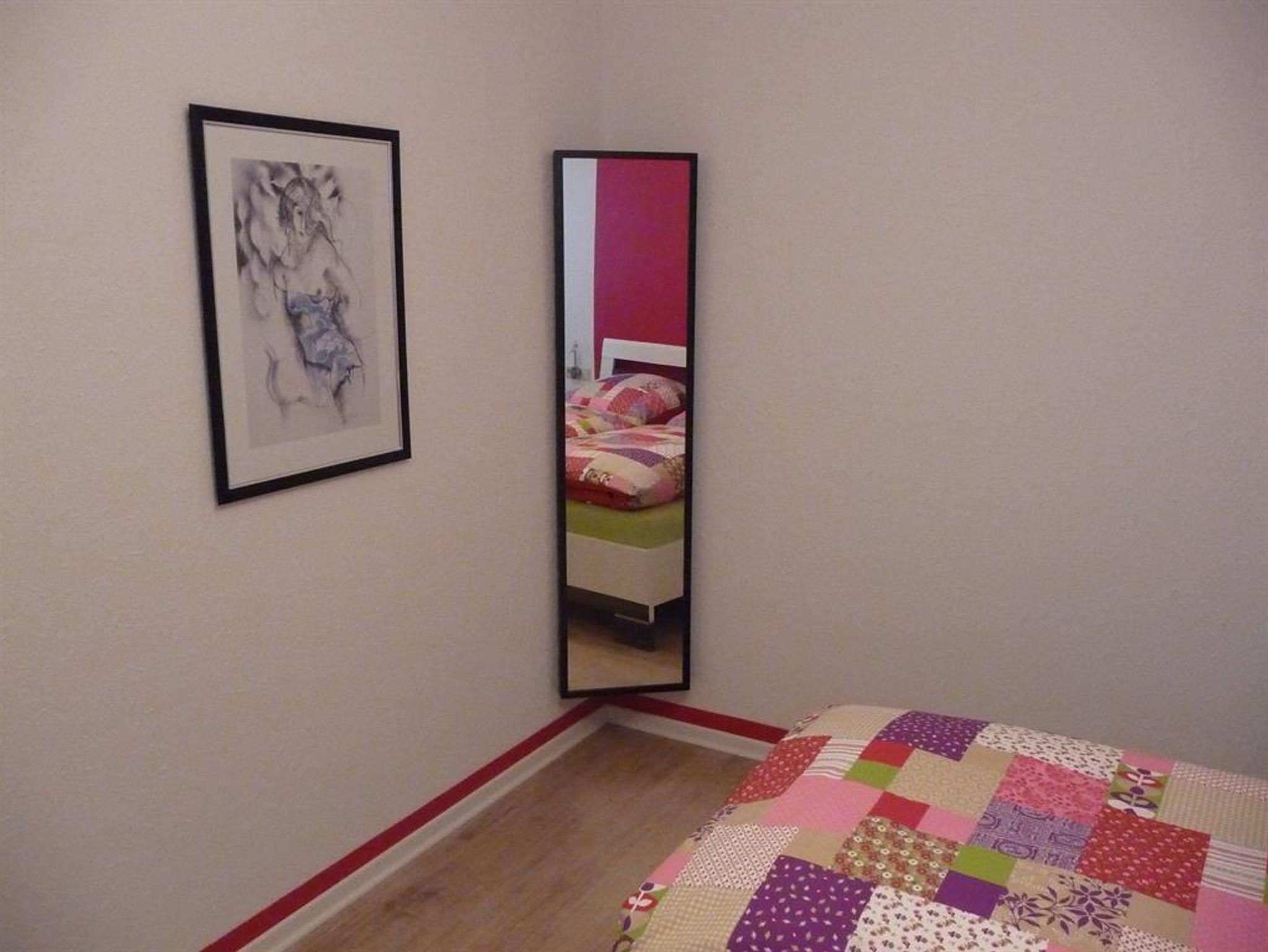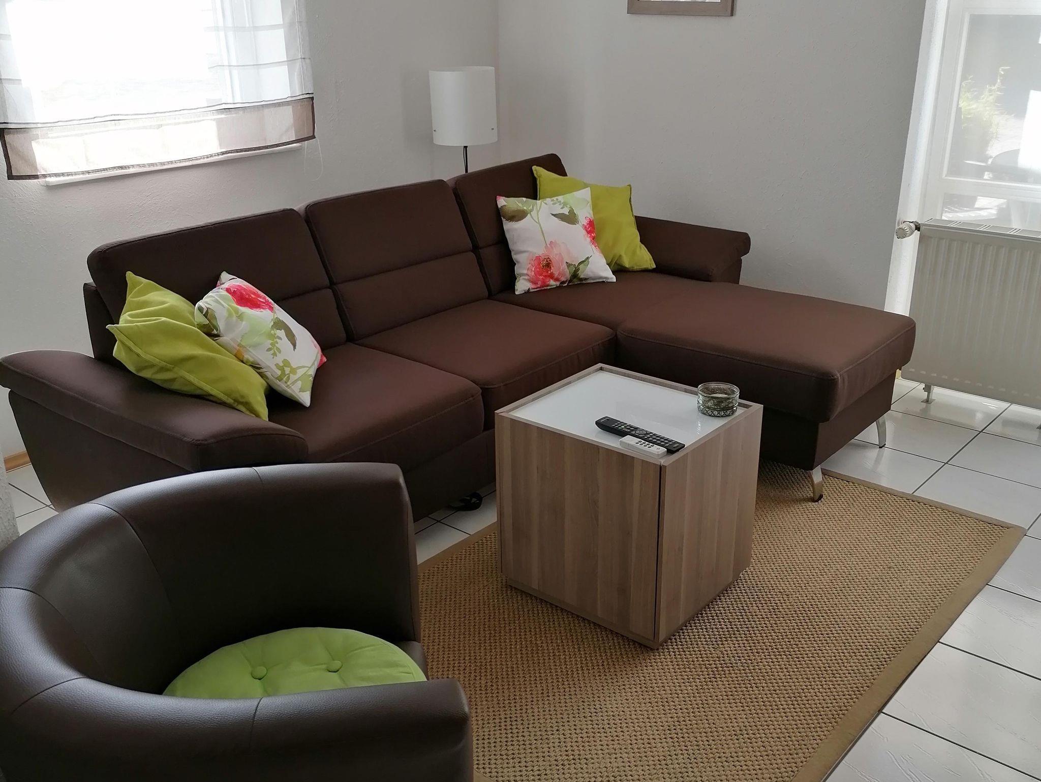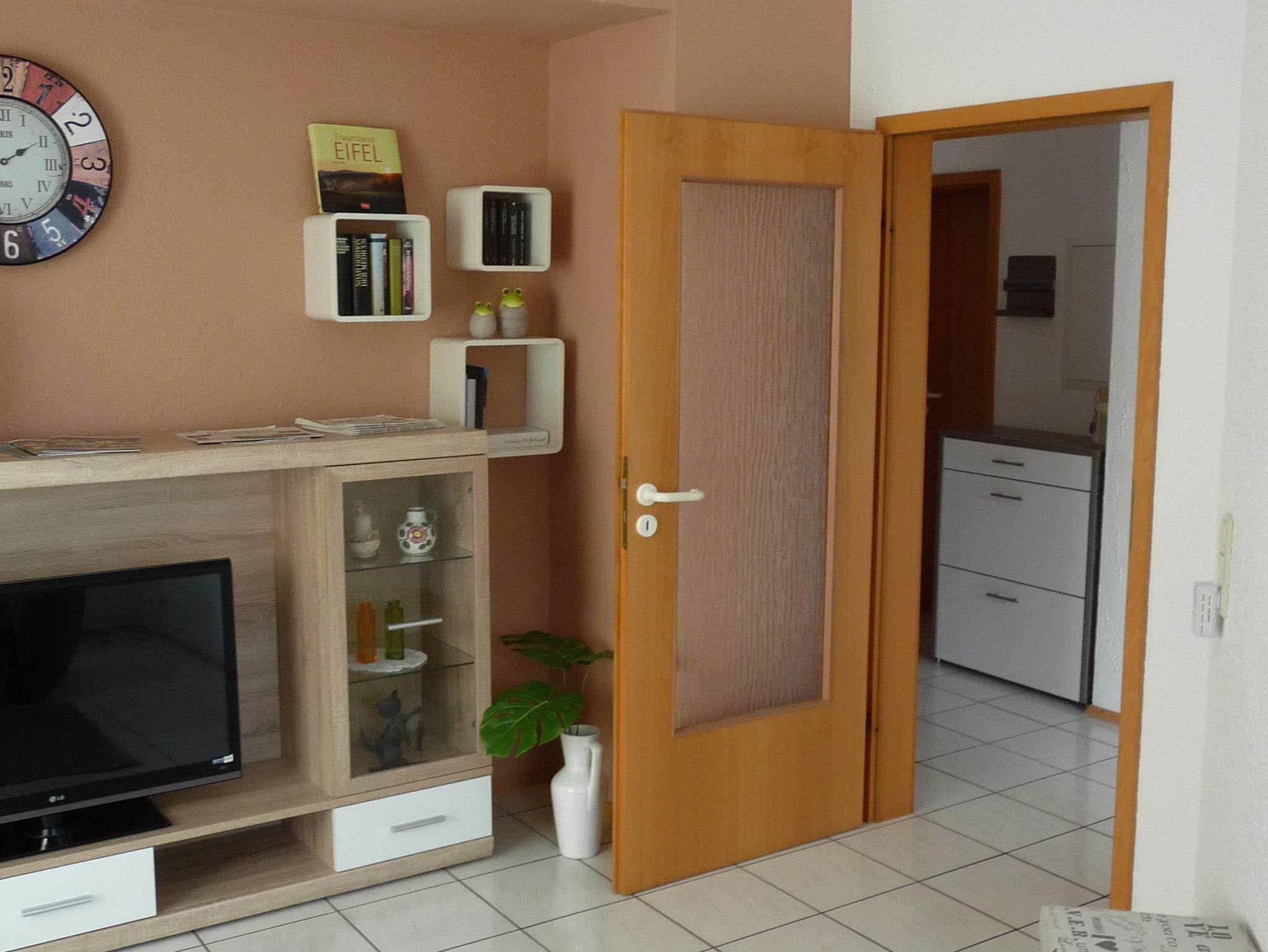 Die Wohnung im Erdgeschoss verfügt neben der Eingangsdiele über ein Schlafzimmer, eine Essküche mit separatem Spind, ein geräumiges behindertengerechtes Badezimmer sowie ein Wohnzimmer mit Zugang zur Terrasse. Im Schlafzimmer befindet sich ein Doppelbett. Im Wohnzimmer, das mit Flachbildschirm, Stereoanlage und Internetzugang ( Telekom Hotspot ) ausgestattet ist, können 2 Personen auf einer Schlafcouch übernachten. So haben in der Wohnung max. 4 Personen Platz.