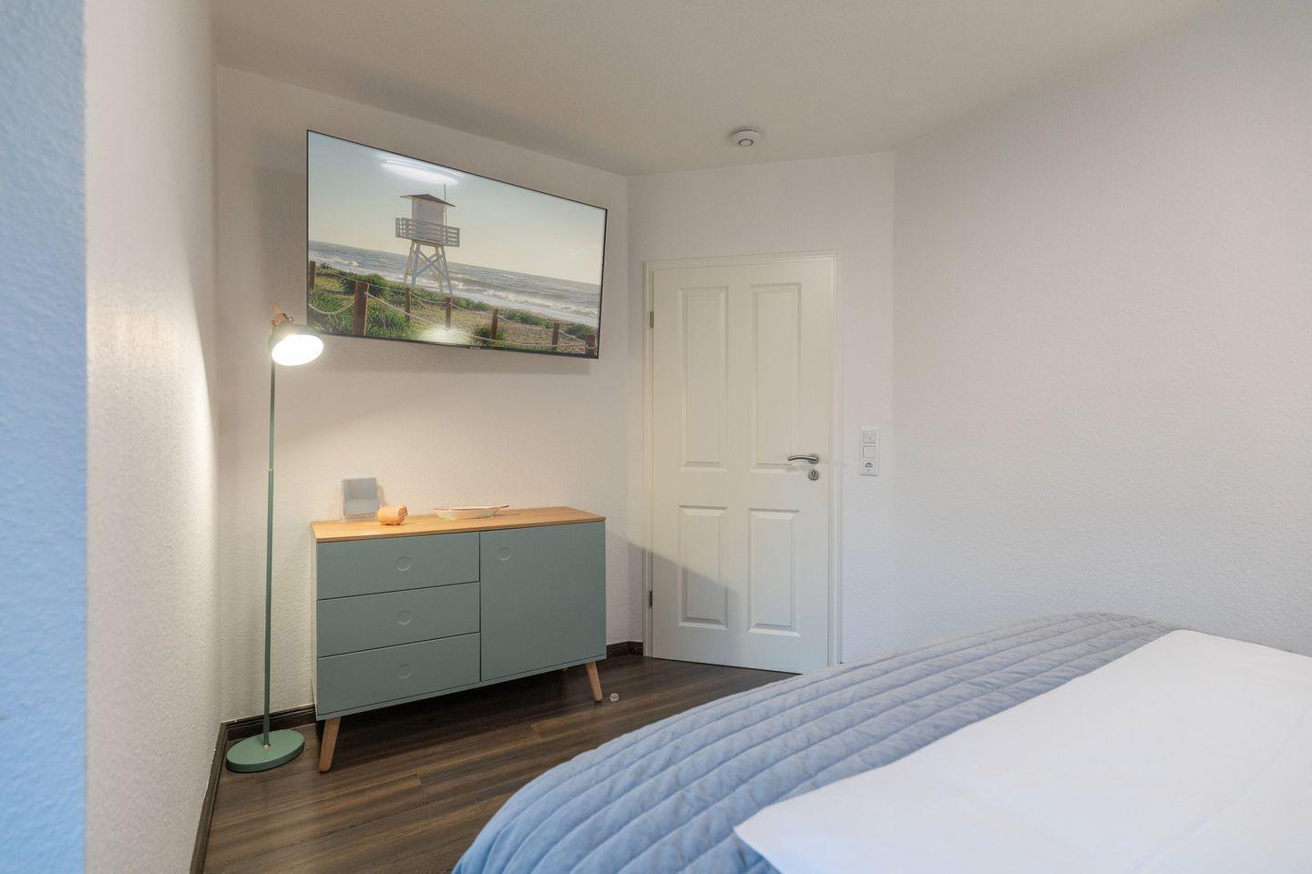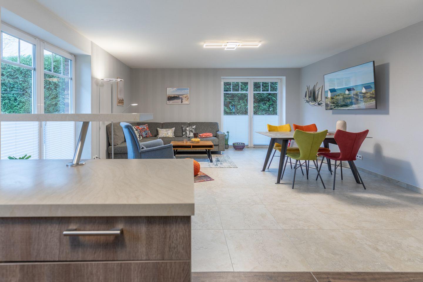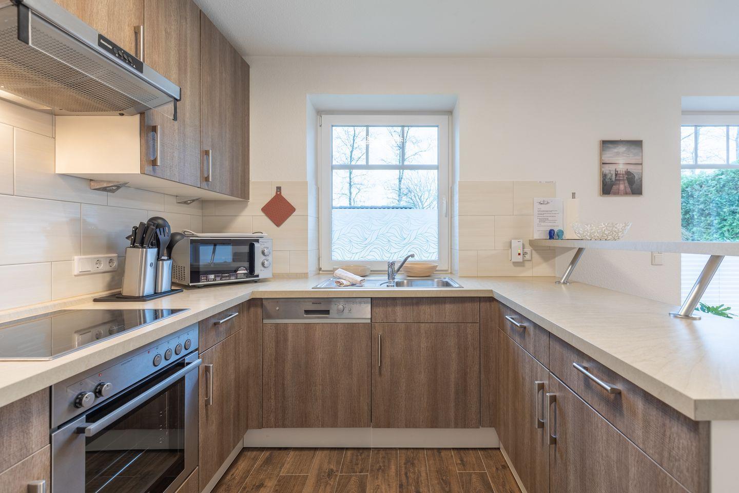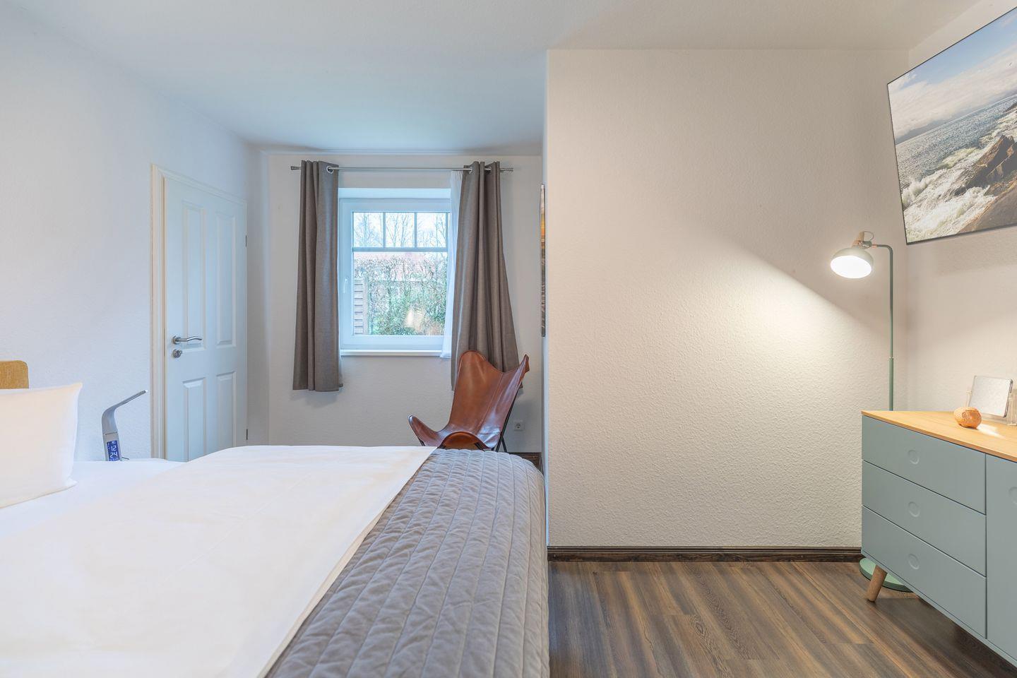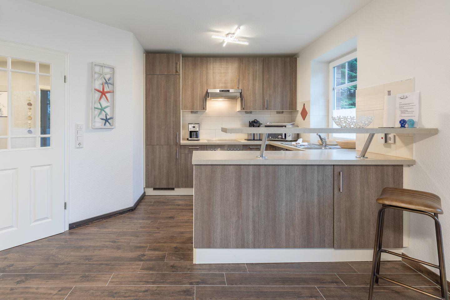 Die Ferienwohnung ist geschmackvoll eingerichtet und bietet mit zwei Schlafzimmern (1 Doppelbett 180 x 200 m und 2 Einzelbetten) Platz für bis zu 4 Personen. Die offene Küche verfügt über einen Herd mit Cerankochfeldern, einen Backofen, einen Kühlschrank, Filterkaffeemaschine (Filtergröße 4), Wasserkocher und Toaster.