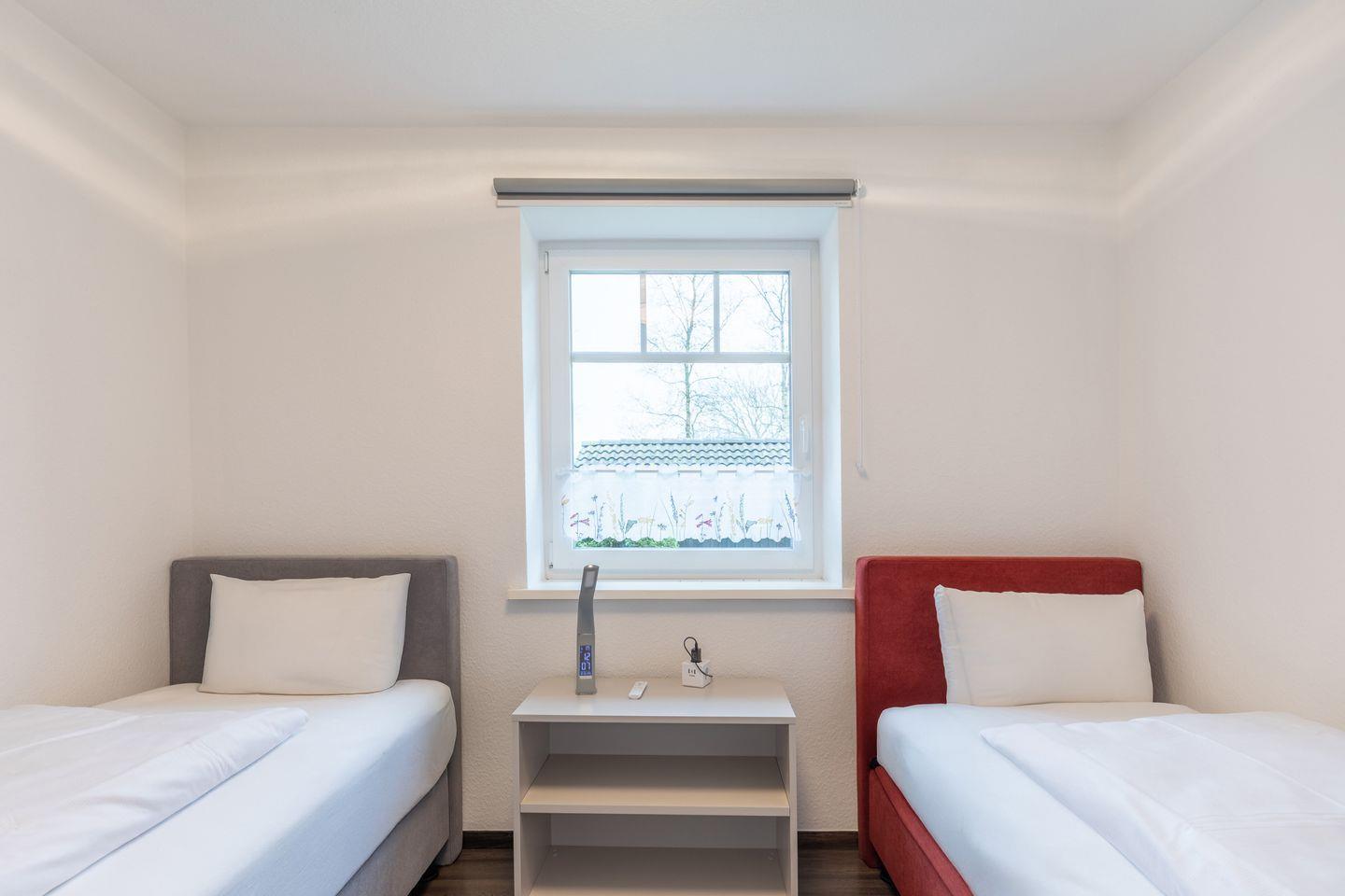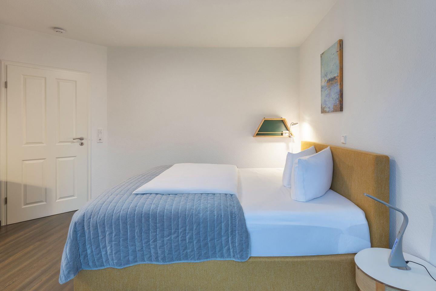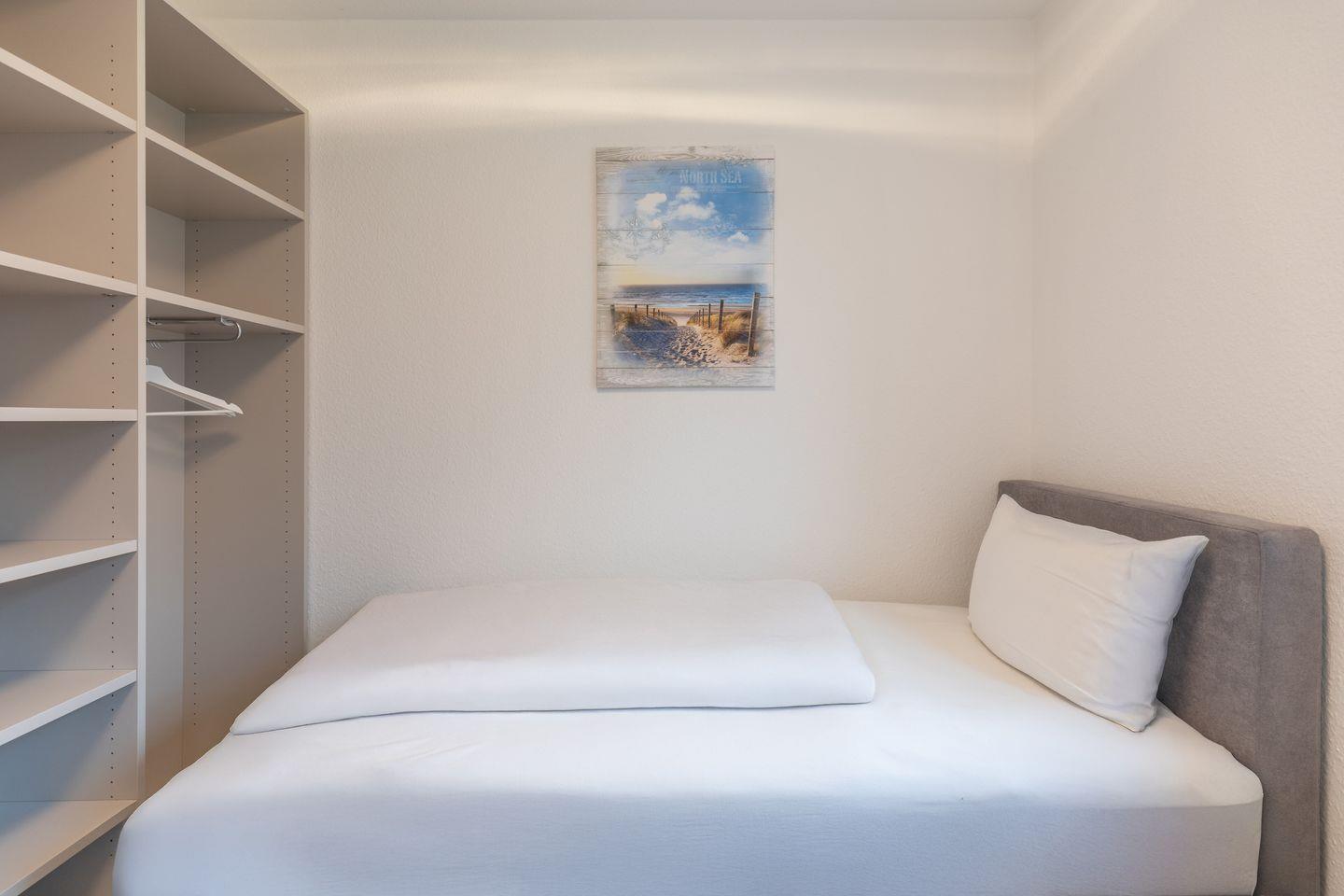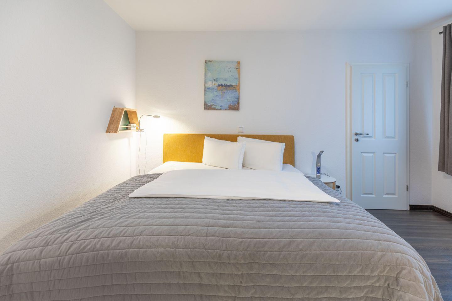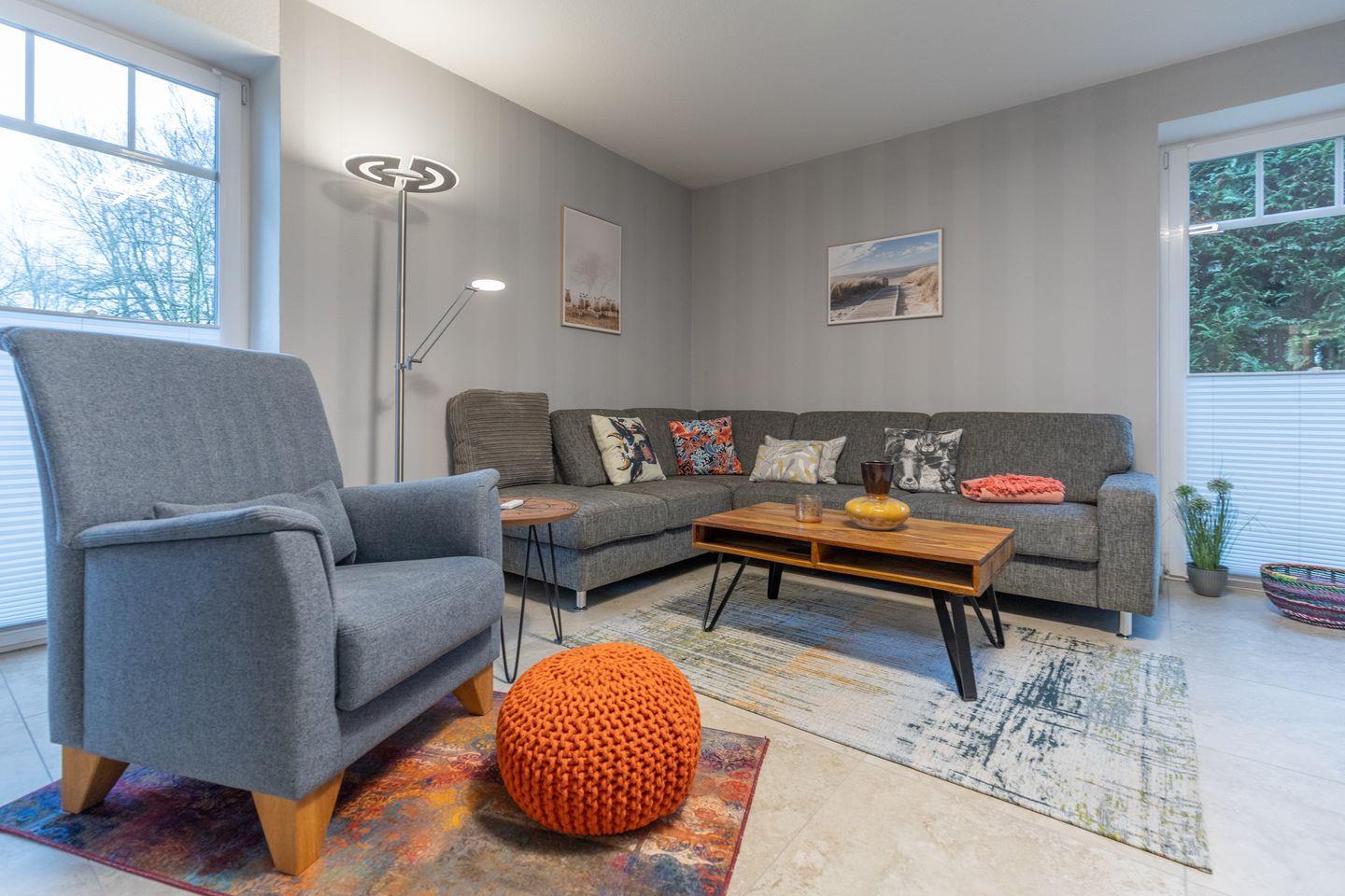 Die Ferienwohnung ist geschmackvoll eingerichtet und bietet mit zwei Schlafzimmern (1 Doppelbett 180 x 200 m und 2 Einzelbetten) Platz für bis zu 4 Personen. Die offene Küche verfügt über einen Herd mit Cerankochfeldern, einen Backofen, einen Kühlschrank, Filterkaffeemaschine (Filtergröße 4), Wasserkocher und Toaster.