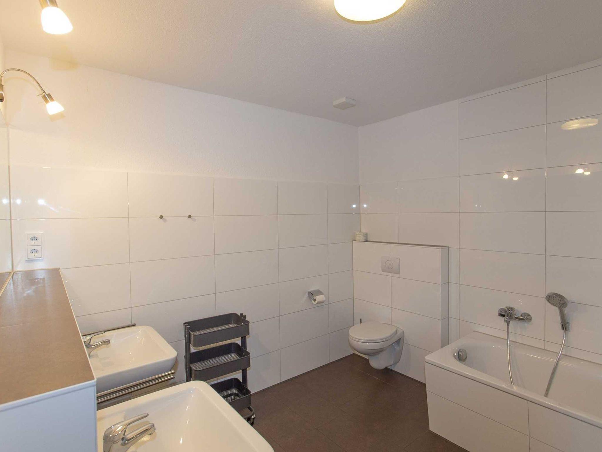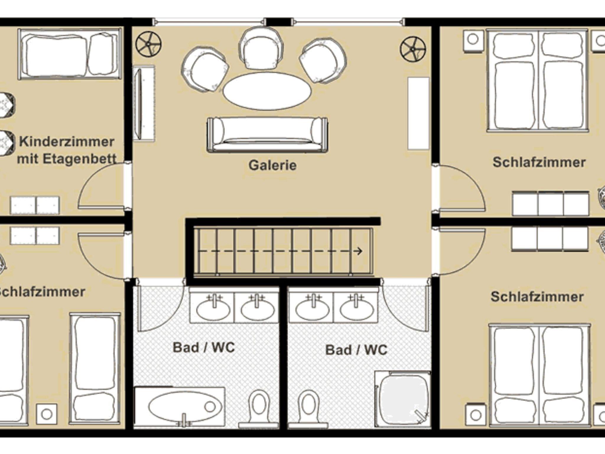 Des Weitern befindet sich hier die Gallerie mit einer Sitzgruppe und TV sowie 2 Bäder mit Dusch bzw. Badewanne und je 2 Waschbecken.