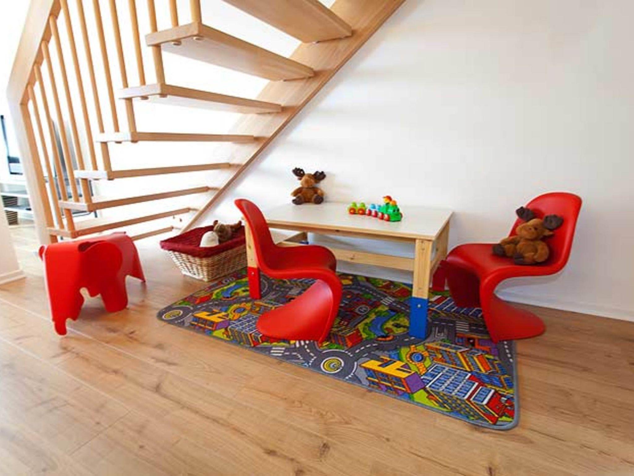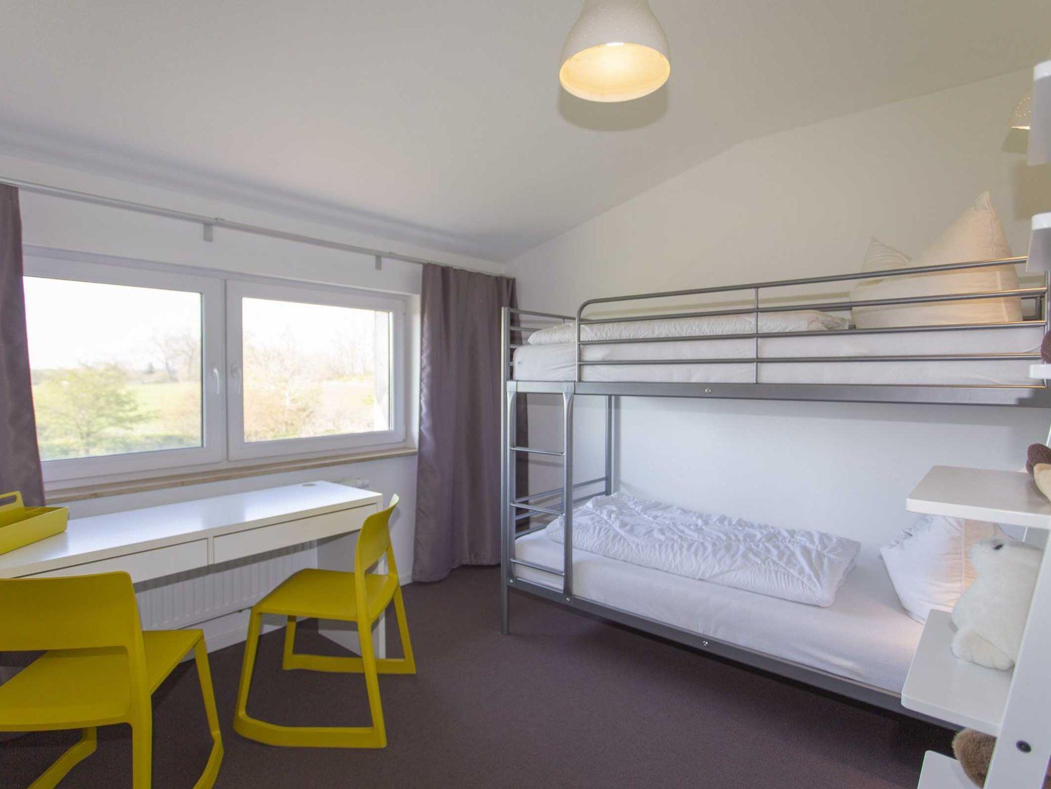 In der oberen Etage finden Sie 2 Schlafzimmer mit Doppelbetten, 1 Schlafzimmer mit Einzelbetten (die auch zusammen gestellt werden können) und 1 Kinderzimmer mit einem Etagenbett.