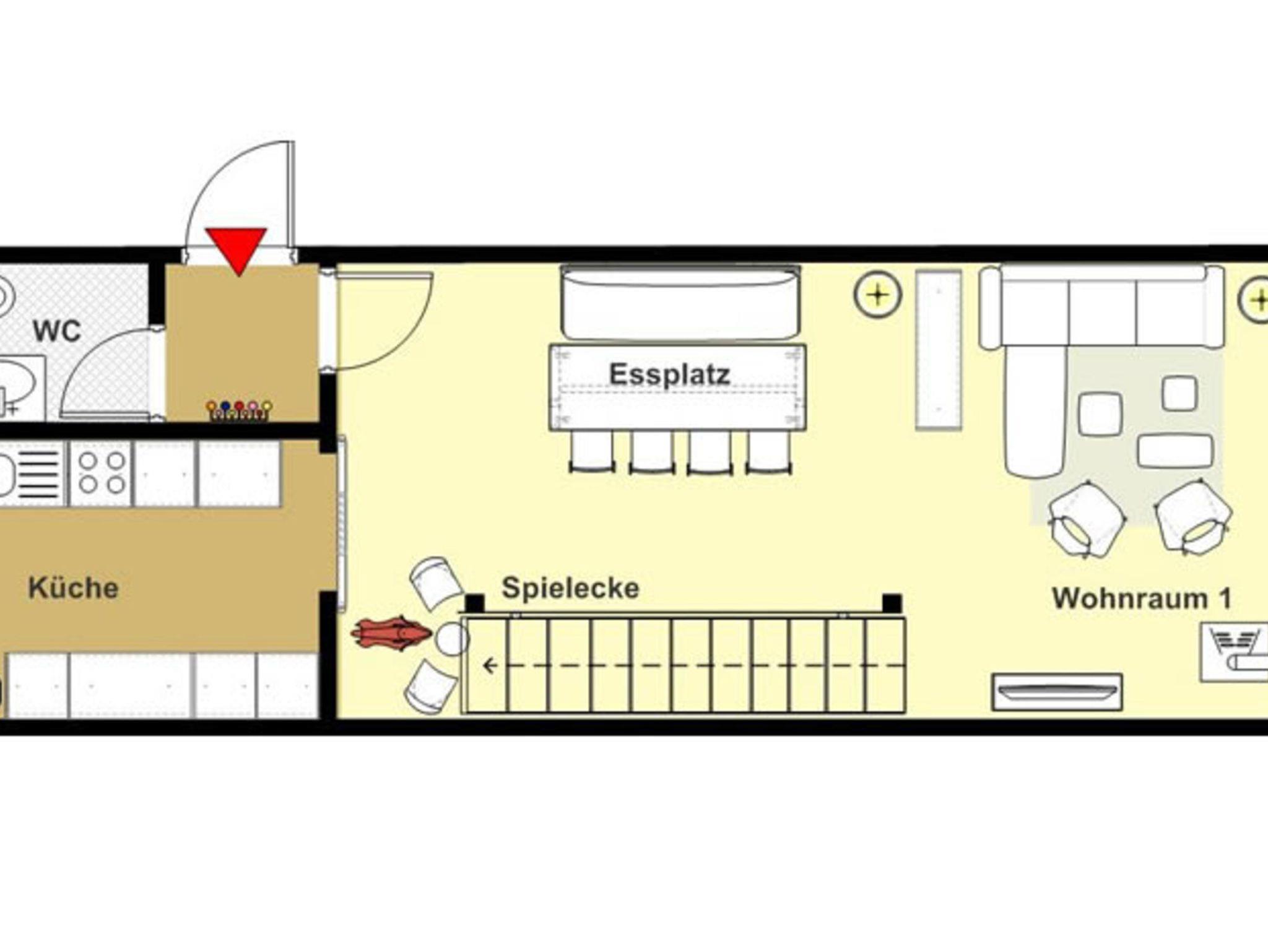 Die Ferienwohnung verfügt in der unteren Etage über ein geraümiges Wohnzimmer mit TV und dem großem Esstisch, der separaten Küche sowie dem Gäste WC.