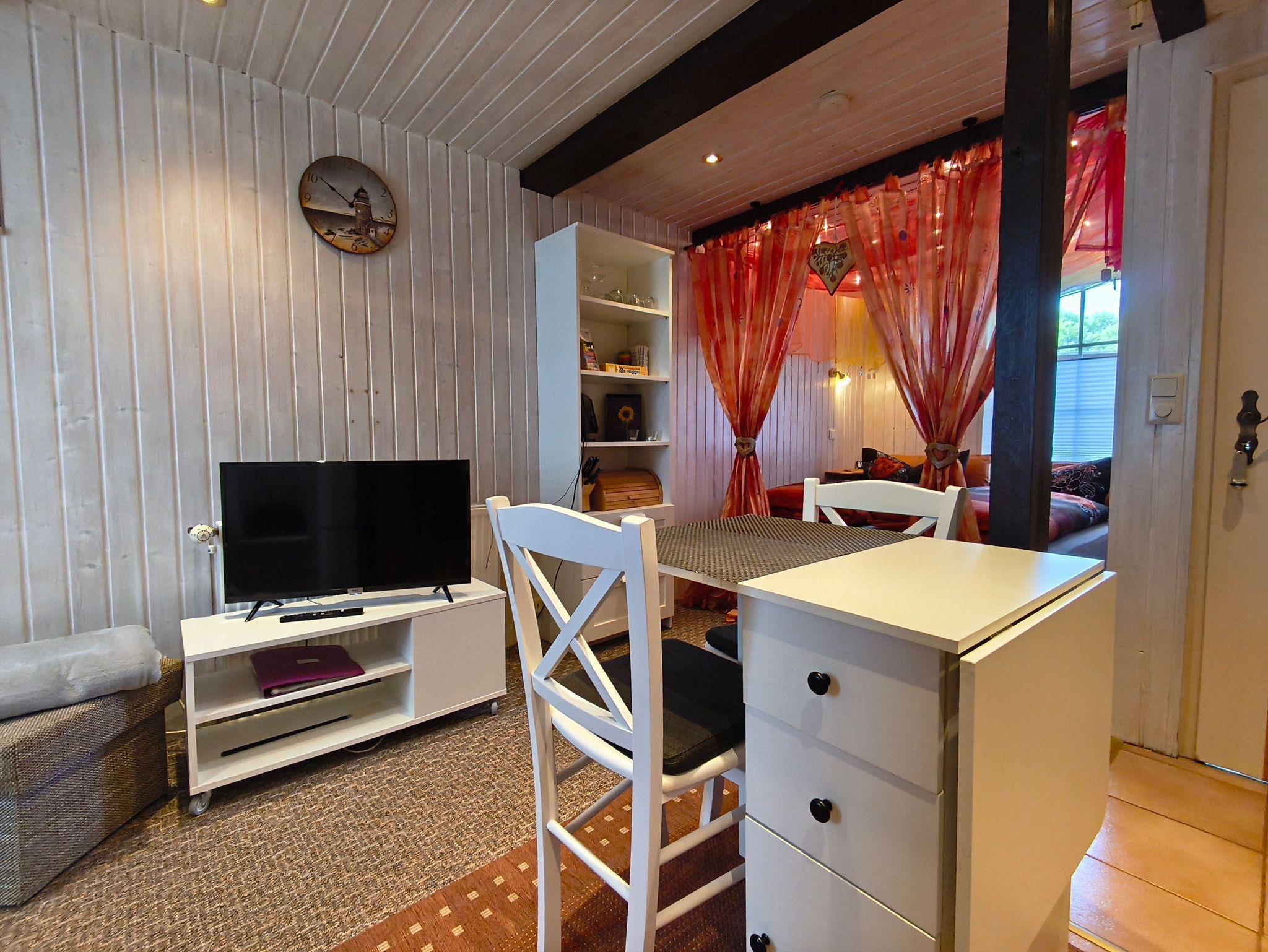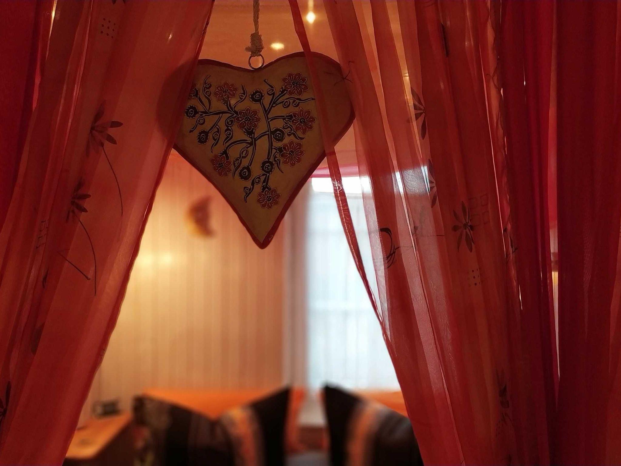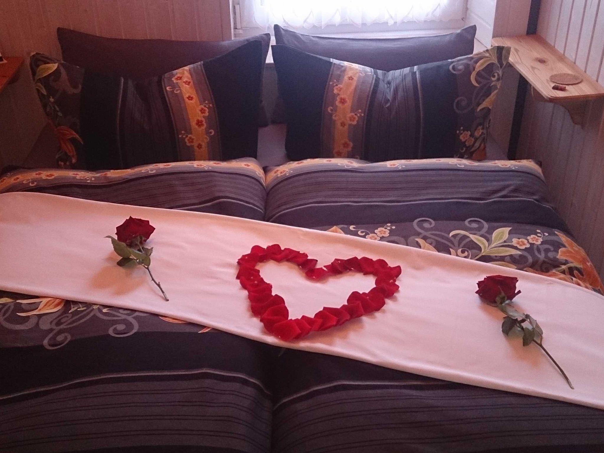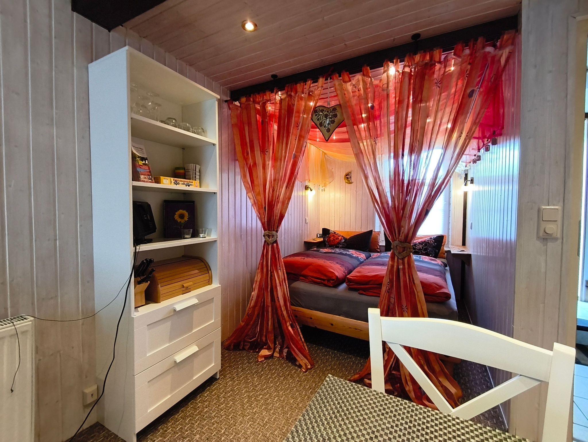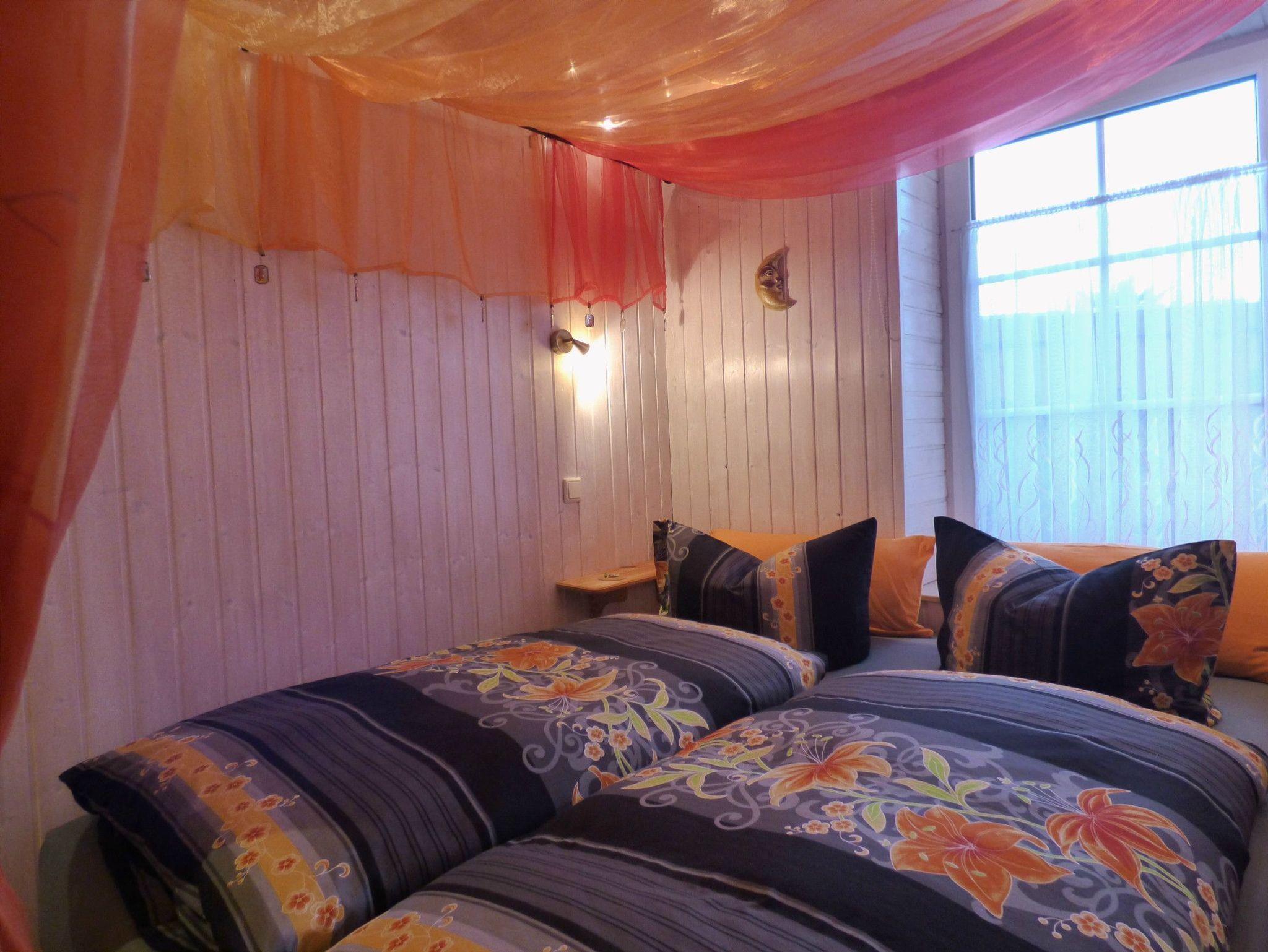 Das Doppelzimmer Honeymoon besticht durch sehr viel Romantik, Gemütlichkeit und eine fröhlich- farbige Innenausstattung. Ein Himmelbett mit dimmbarem Sternchenhimmel lädt zum Träumen ein. Das Sofa sorgt für eine angenehme Atmosphäre. Eine voll eingerichtete Miniküche steht zur Verfügung. Im Bad mit Fenster gibt es sowohl einen Fön und einen Kosmetikspiegel als auch diverse Kosmetikprodukte, falls Sie Ihre eigenen vergessen haben. Angeboten werden ofenfrische Brötchen in Varianten ab 9 Uhr an die Tür gehängt. Oder ein Tellerfrühstück ab 9 Uhr. Bei Gelegenheit gibt es einen Grillabend, einen Fischabend oder ab und an selbstgebackenen Kuchen. Alles ist auf Bequemlichkeit und Freundlichkeit ausgerichtet - der Gast möge sich von Anfang an zu Hause fühlen.