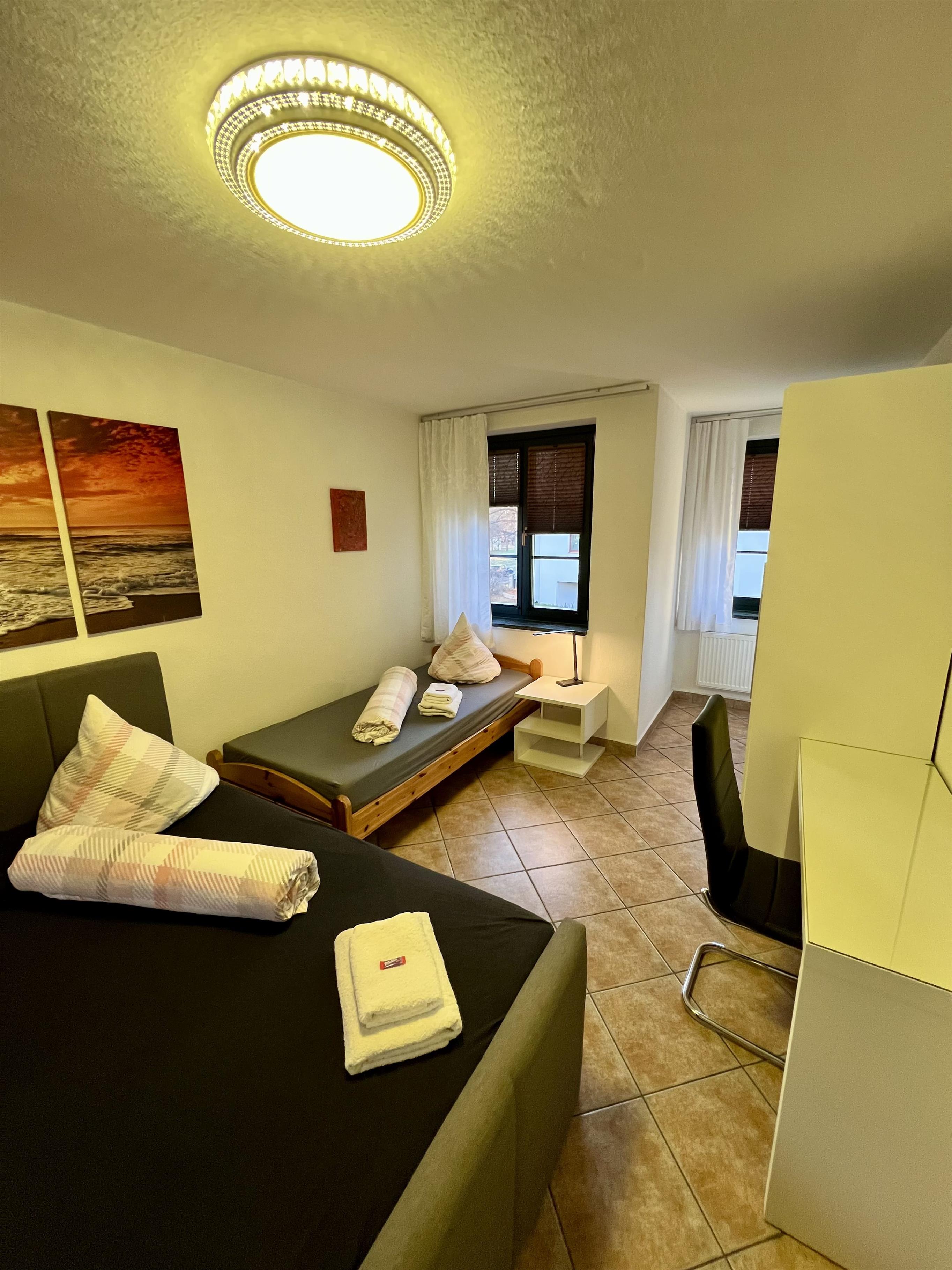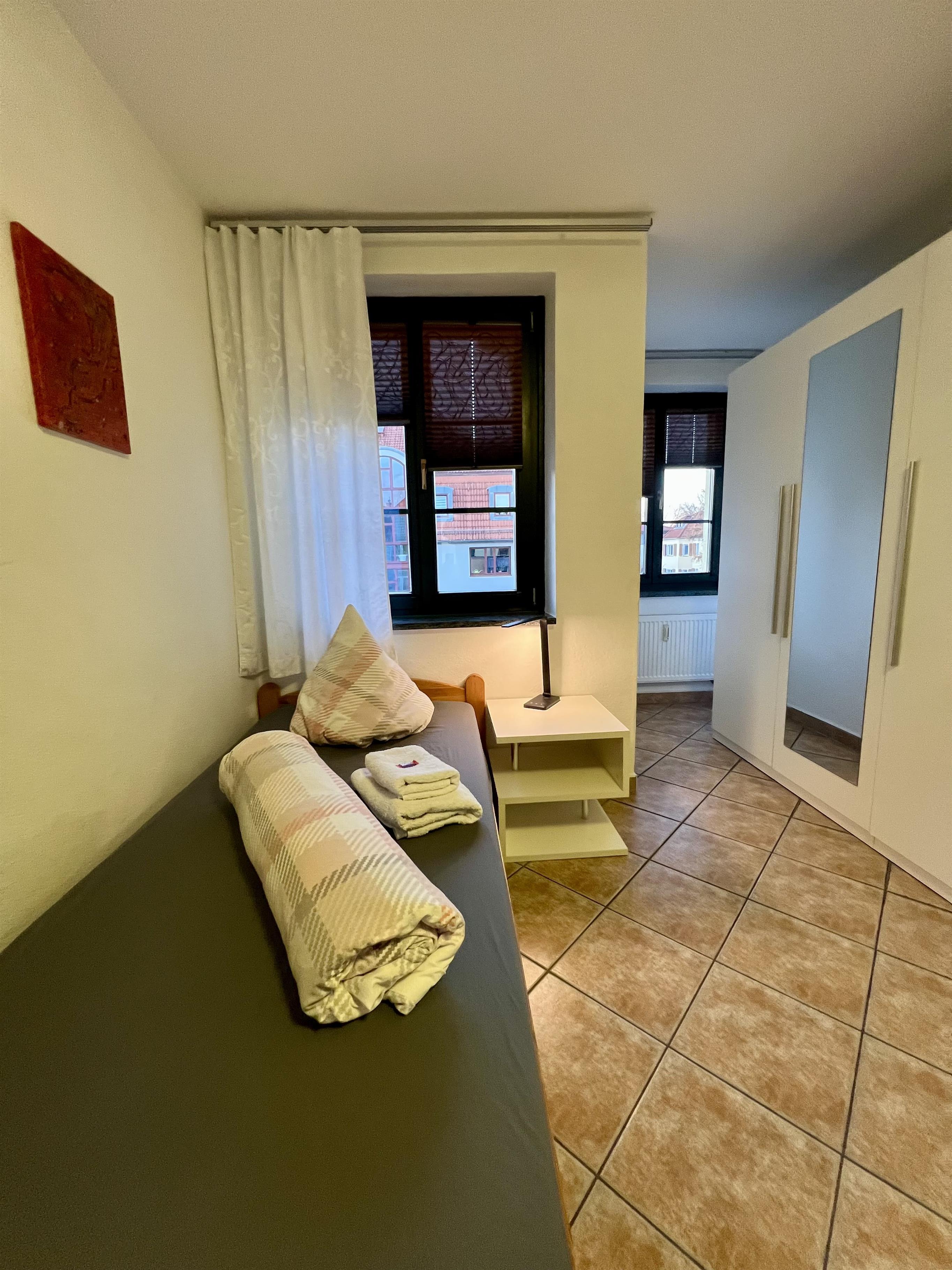 Apartment 3 features a brightly designed living room with two single beds, a fully equipped kitchen, and a bathroom with a shower. This apartment is perfect for one to two guests who want to experience Dresden in a quiet and pleasant atmosphere.