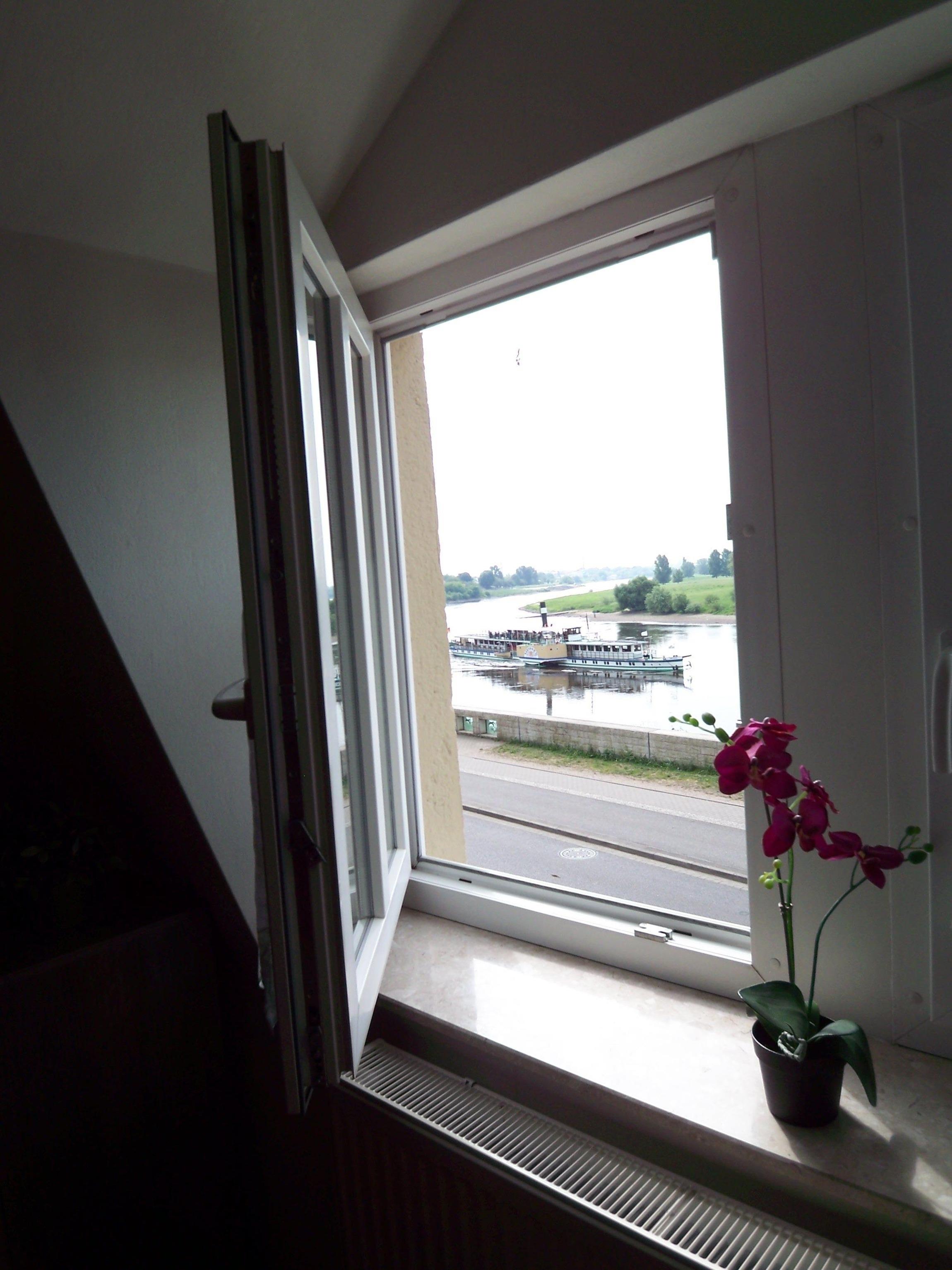 Gemütliche Ferienwohnung im 1. OG des Ferienhauses Ambiente an der Elbe, direkt an Elbe und Elbradweg gelegen mit Blick auf die Elbe und die Altstadt und guter Anbindung an die Autobahn, die Dresdner Altstadt und Messe.