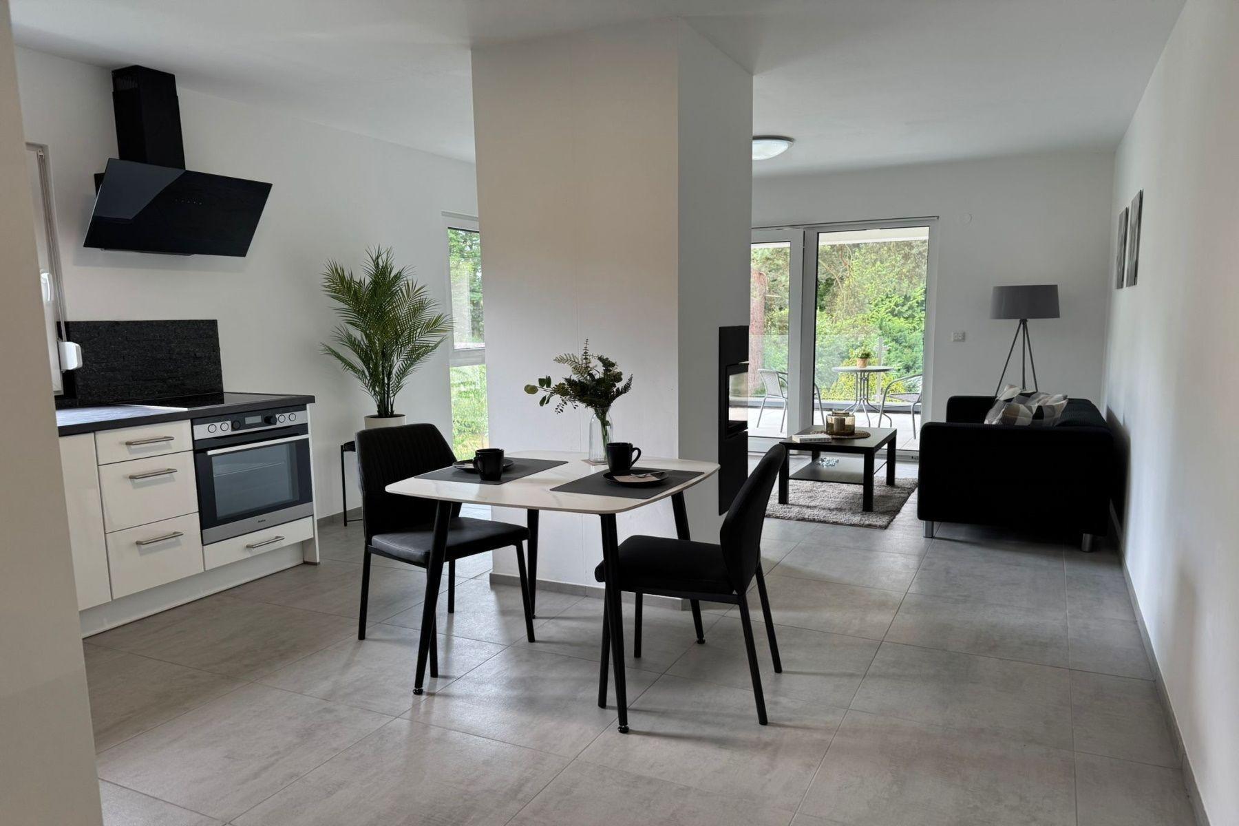 Ein stilvoller Essbereich, eine komfortable Schlafcouch mit TV sowie ein Echtholzkamin schaffen eine behagliche Atmosphäre und machen die Wohnung zum perfekten Rückzugsort – auch in den kühleren Monaten.