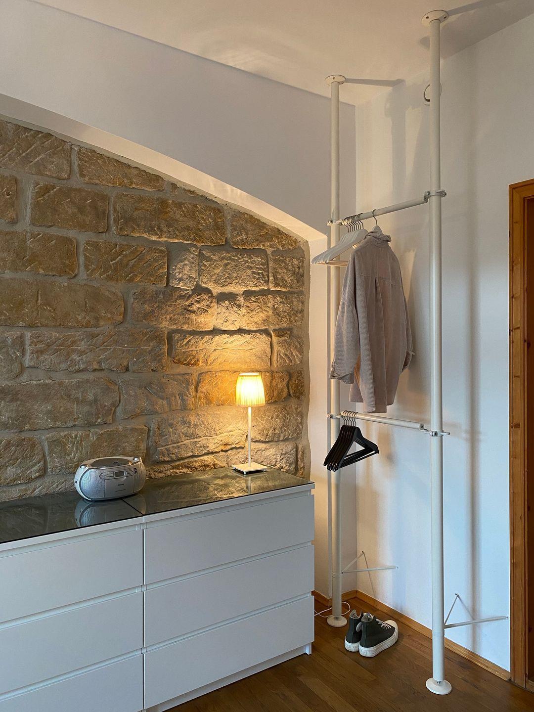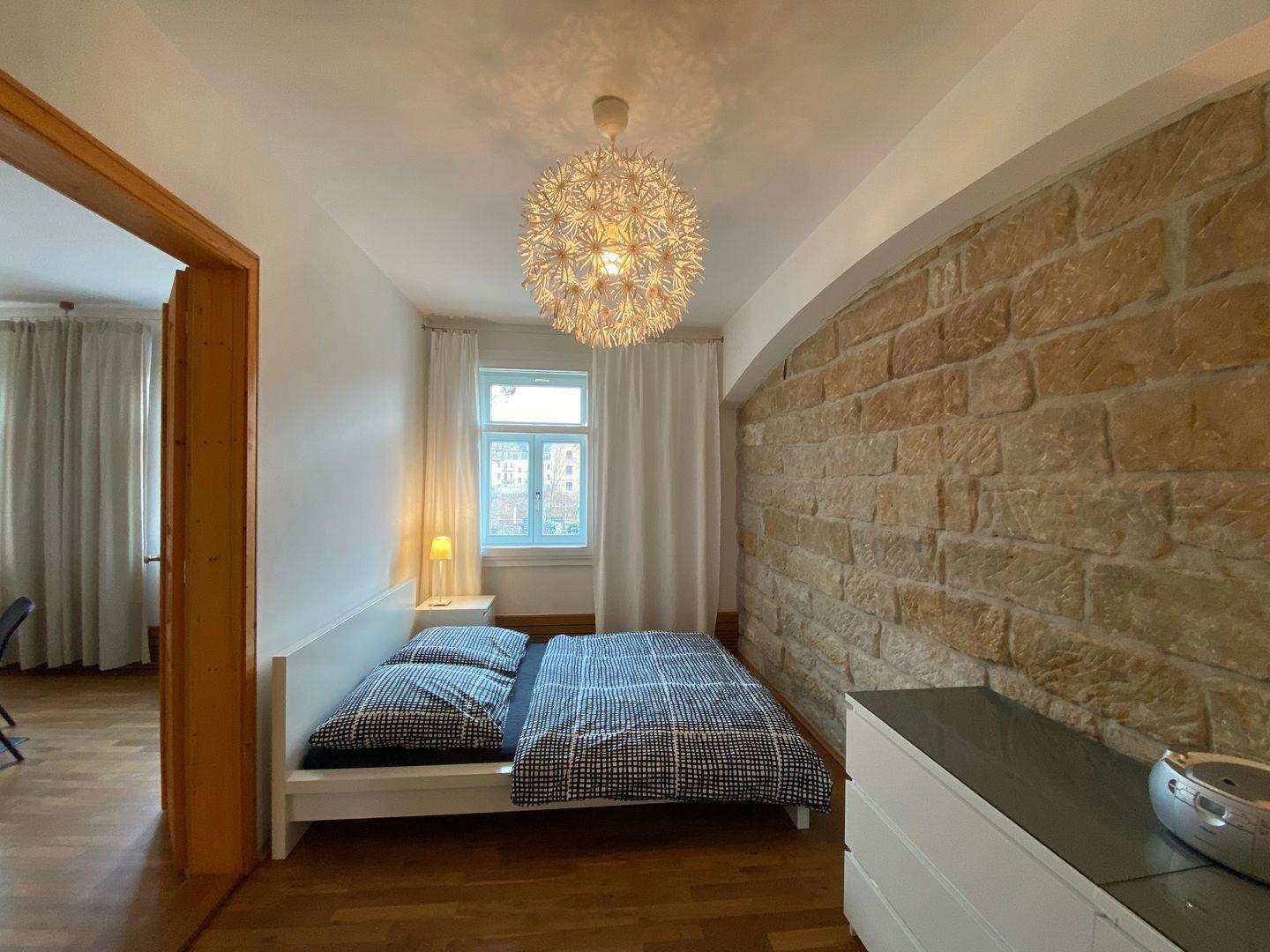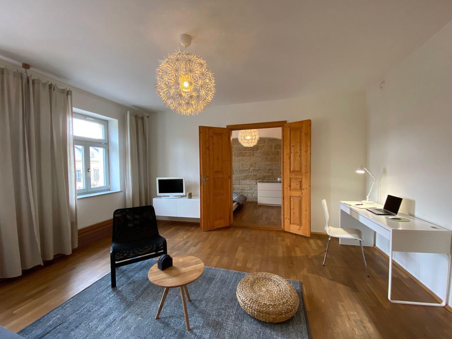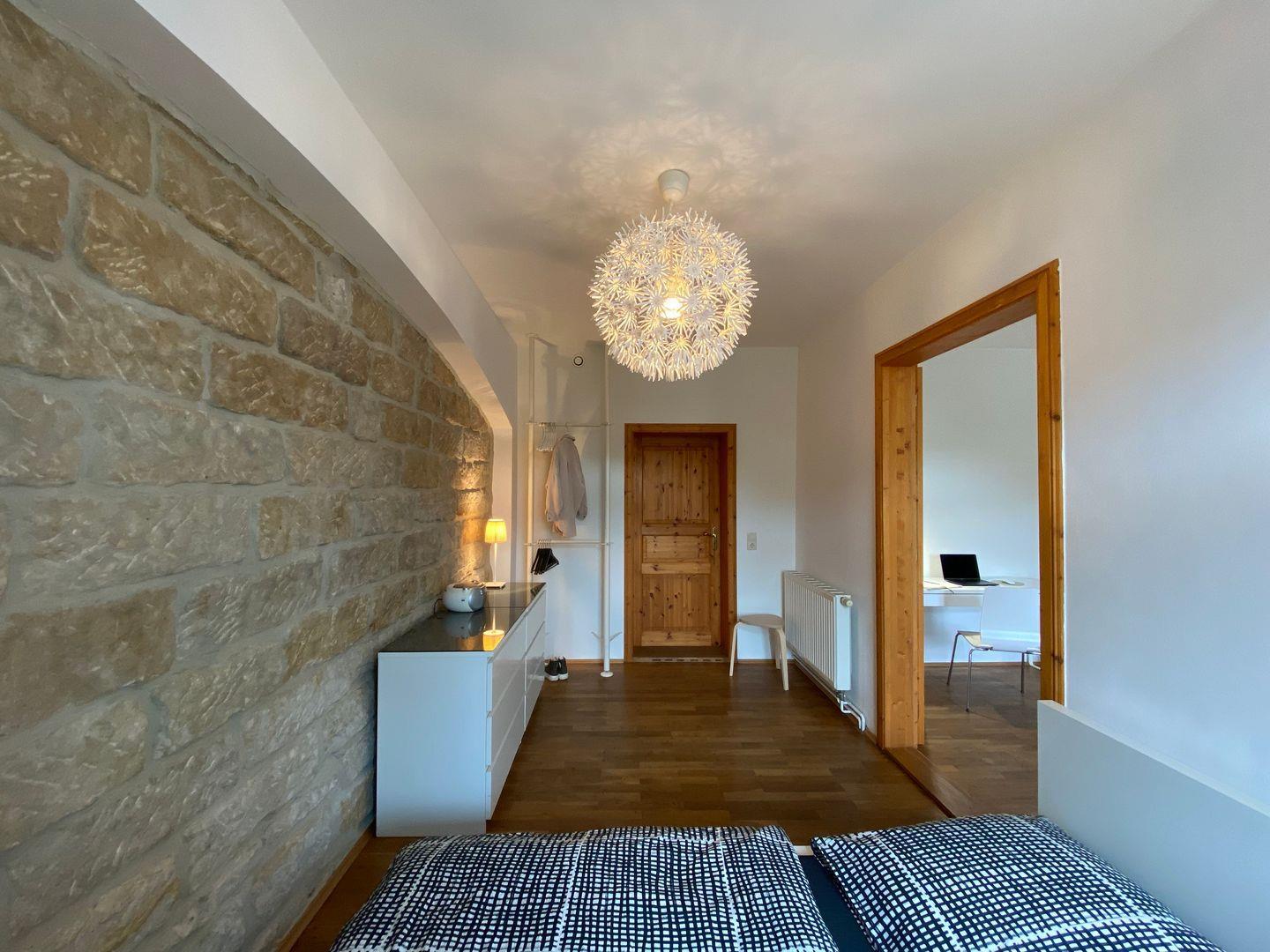 Zur Wohnung gehört ein geräumiges Wohnzimmer mit TV und Schlafcouch für 1 Person. Zum Arbeiten steht außerdem ein Schreibtisch bereit. Vom Wohnzimmer gelangt man durch die hübsche Flügeltür in das Schlafzimmer mit Sandsteinmauer und Doppelbett.