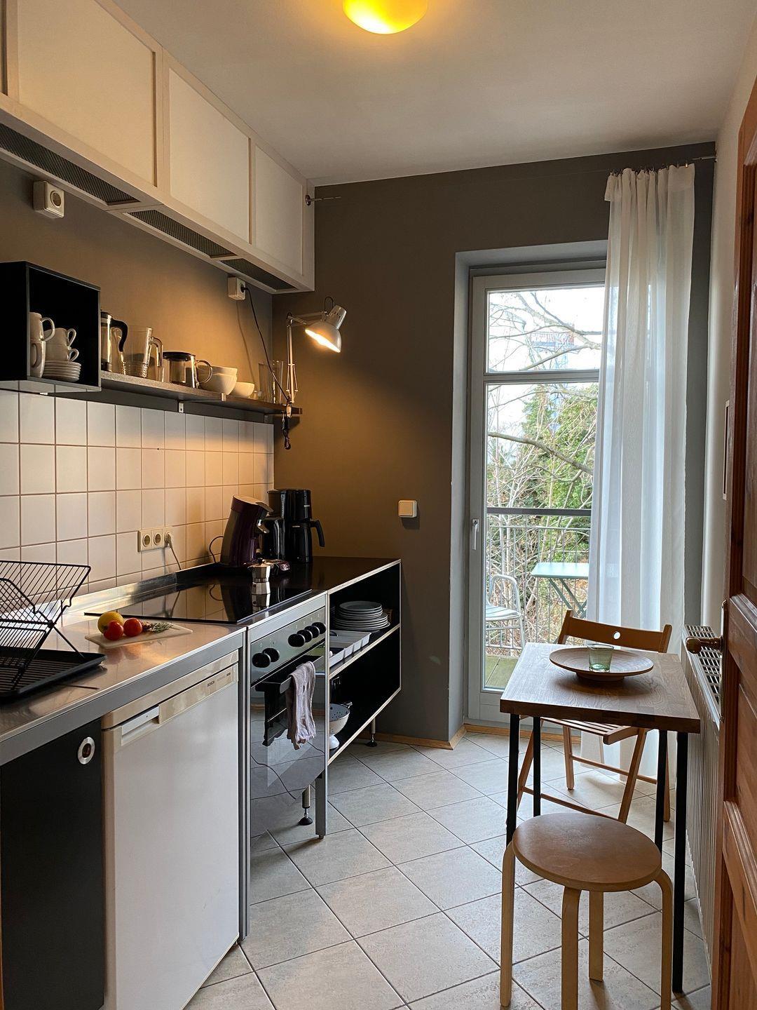 Küche und Bad sind zum grünen Hinterhof gelegen. An die voll ausgestattete Küche grenzt der Balkon mit Blick ins Grüne. Hier lassen sich Abende ausklingen und ein Frühstück genießen.