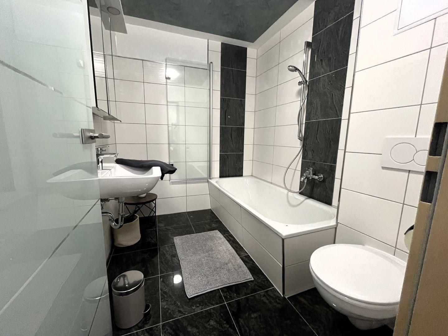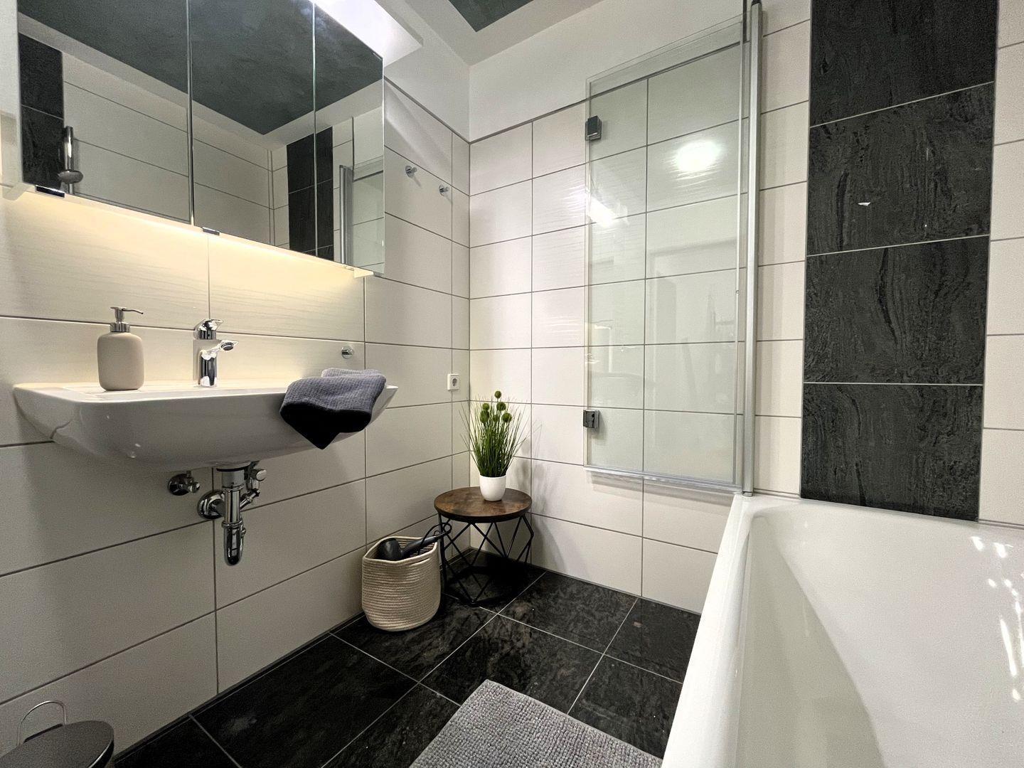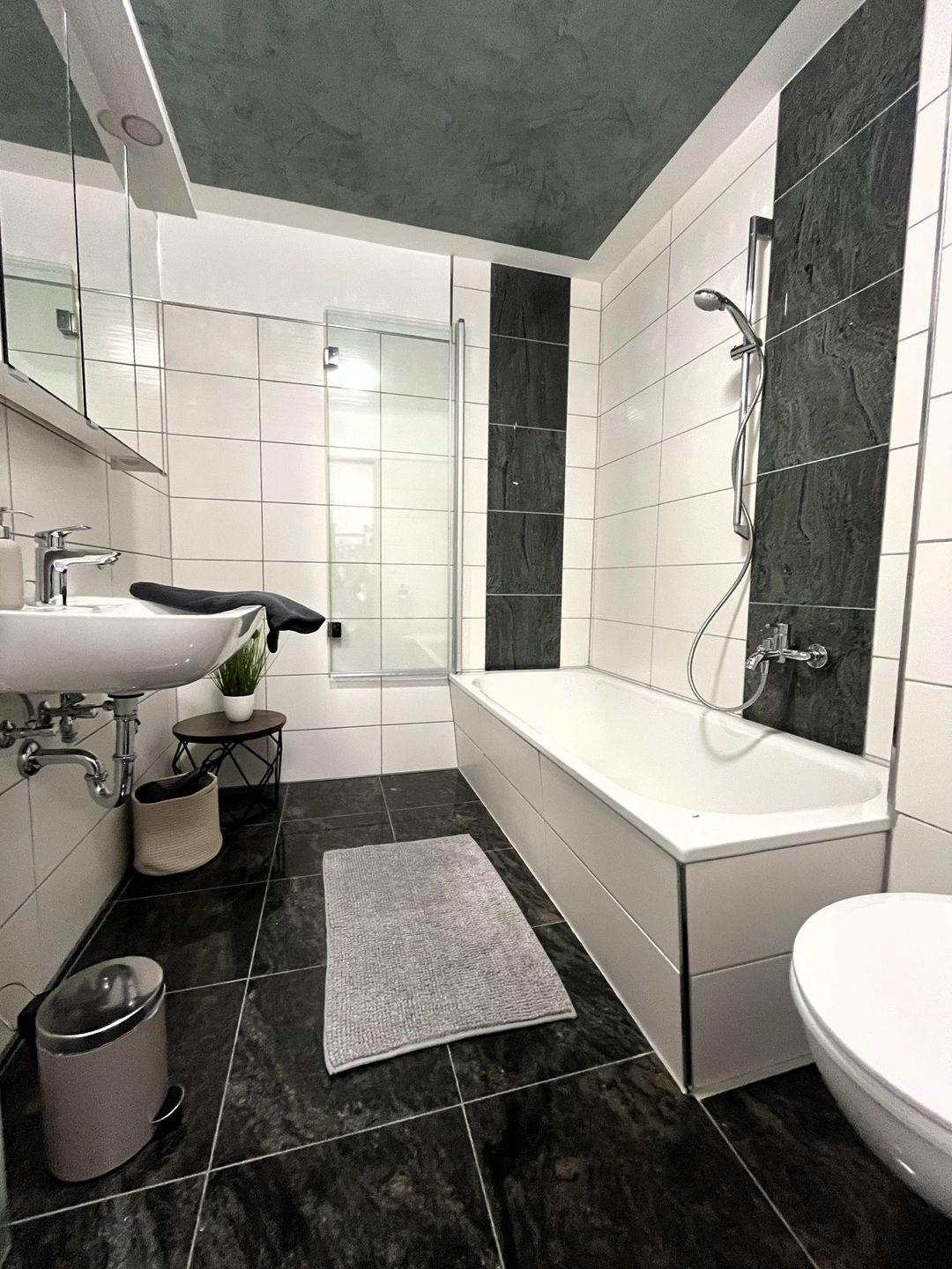 Das Badezimmer ist großzügig gestaltet und verfügt über eine Badewanne mit integrierter Dusche, ein Waschbecken, ein WC sowie einen Spiegel. Hier können Sie nach einem aufregenden Tag in der Stadt entspannen und neue Energie tanken.