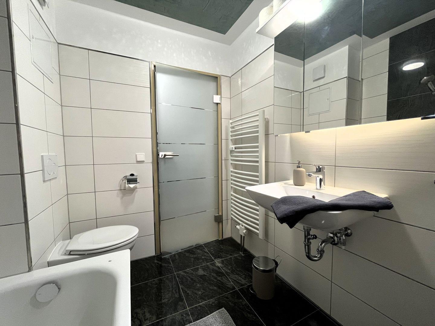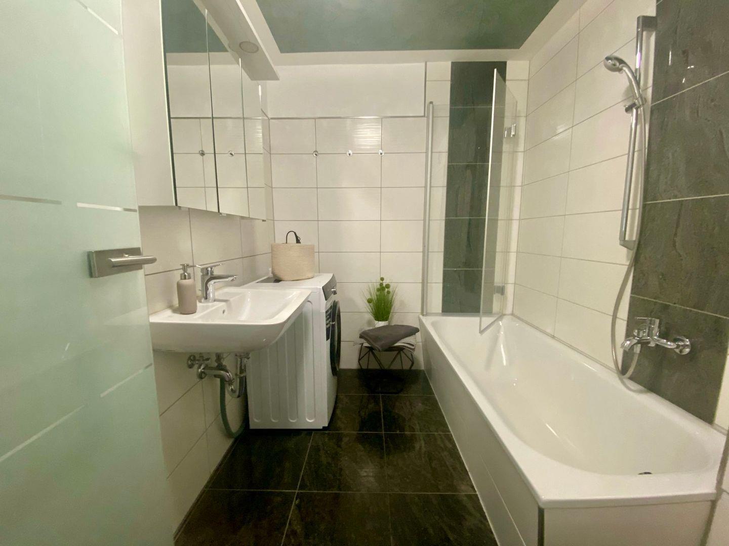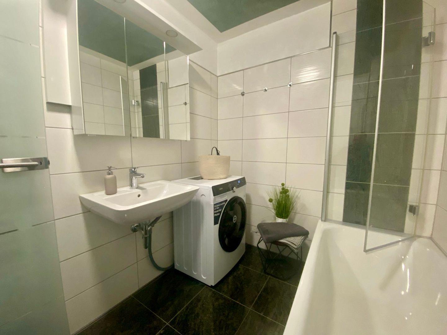 Das Badezimmer ist großzügig gestaltet und verfügt über eine Badewanne mit integrierter Dusche, ein Waschbecken, ein WC sowie einen Spiegel. Hier können Sie nach einem aufregenden Tag in der Stadt entspannen und neue Energie tanken.