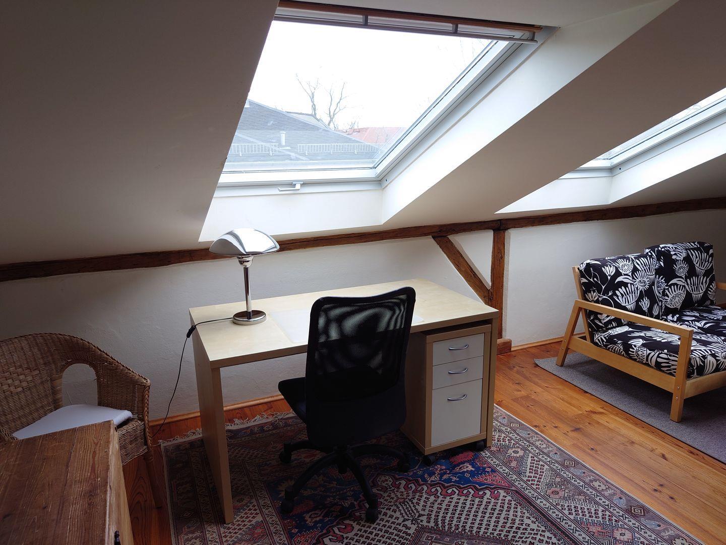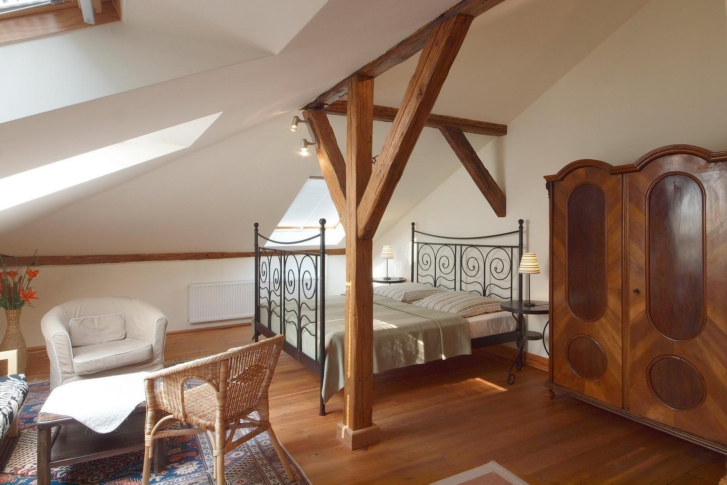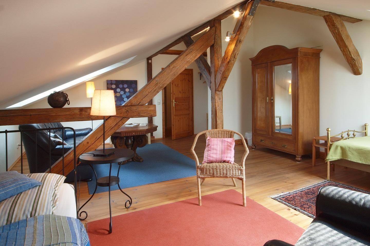 Über das prächtige Marmortreppenhaus betritt man den ehemaligen Speicher. Ganz bewusst ist hier der historische Dachstuhl sichtbar gelassen. Genießen Sie die zentrale Lage, die sonnigen Räume und jede Menge Platz. Liebevoll restauriert und mit moderner Technik ergänzt, lässt es sich in der Villa Haniel gemütlich und komfortabel wohnen.