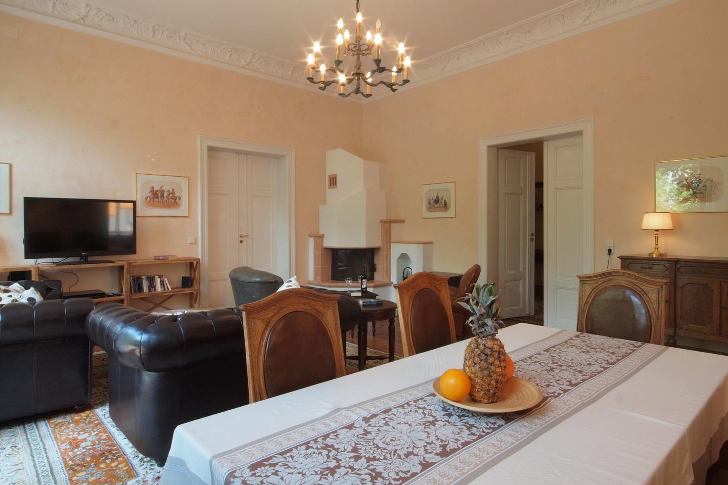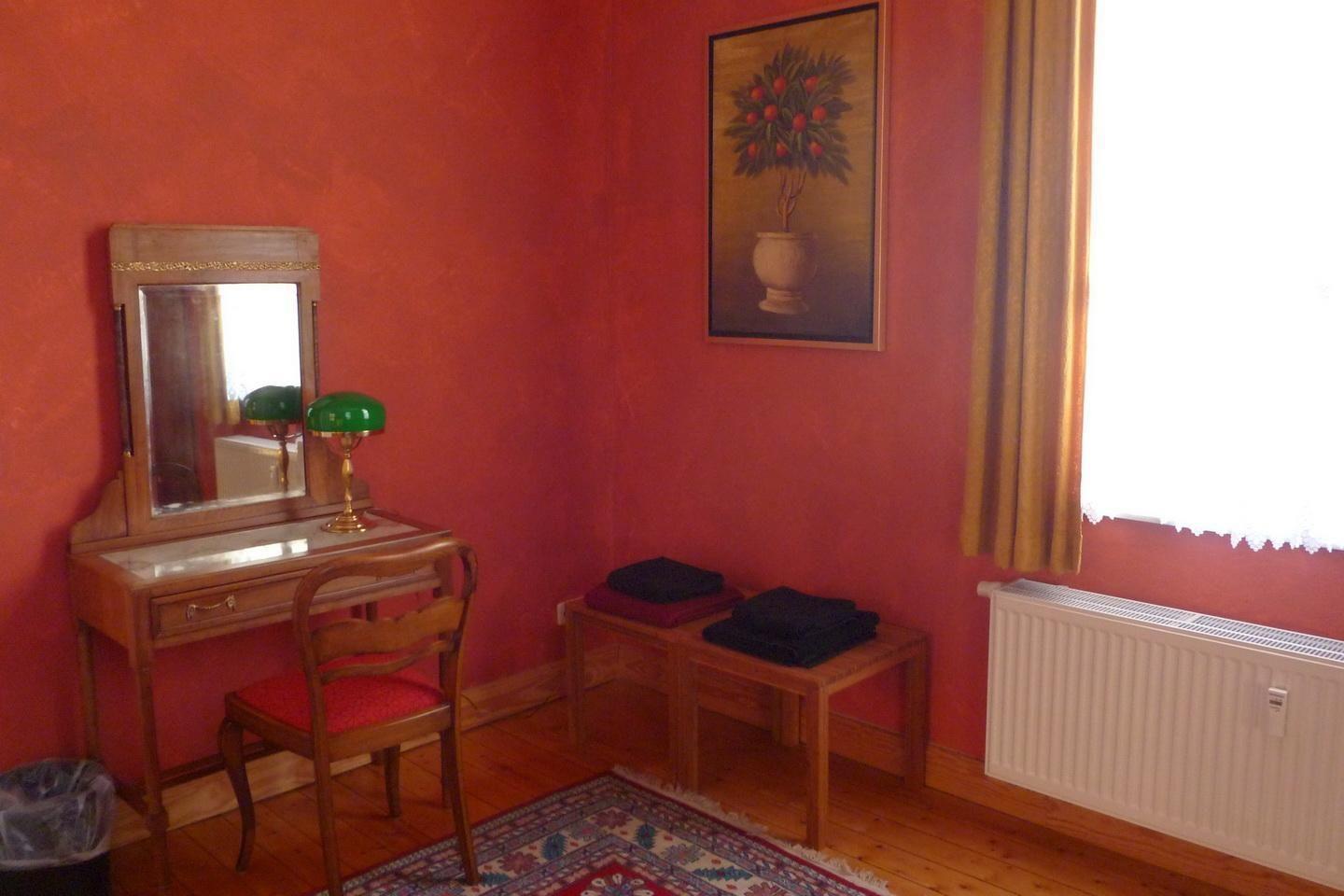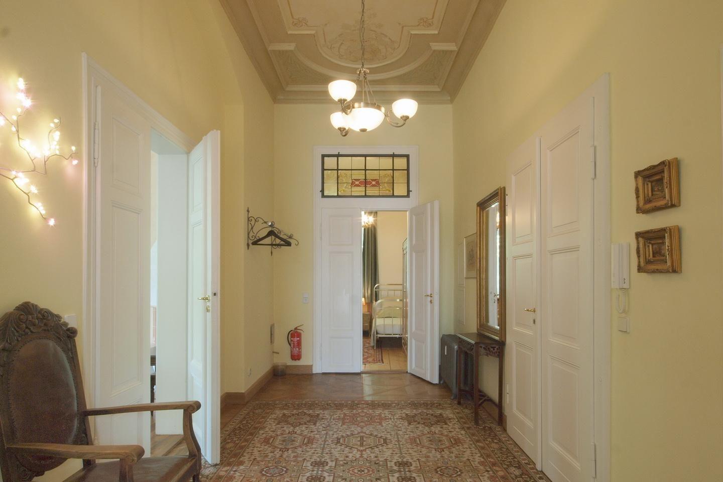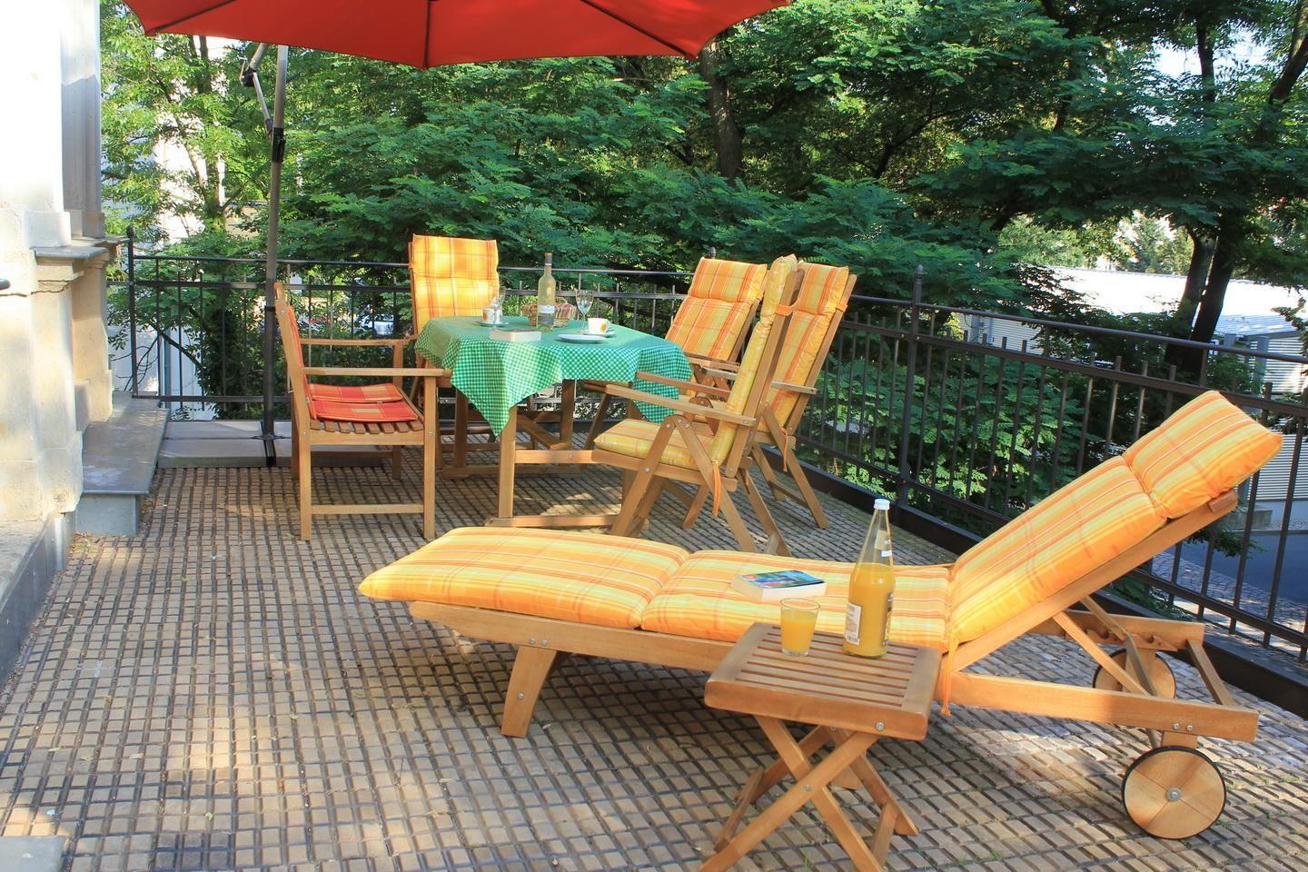 Große helle Räume, Stuck, eine riesige Terrasse nach Südwesten, das besonders prächtige rote Schlafzimmer und ein kleiner Raum mit zauberhafter Ausmalung - einst ein „Römisches Bad“. Die Wohnung Julius ist für sich schon sehenswert. Starten Sie von hier aus zu einem Besuch der Dresdner City. Liebevoll restauriert und mit moderner Technik ergänzt, lässt es sich in der Villa Haniel stilvoll und komfortabel wohnen.