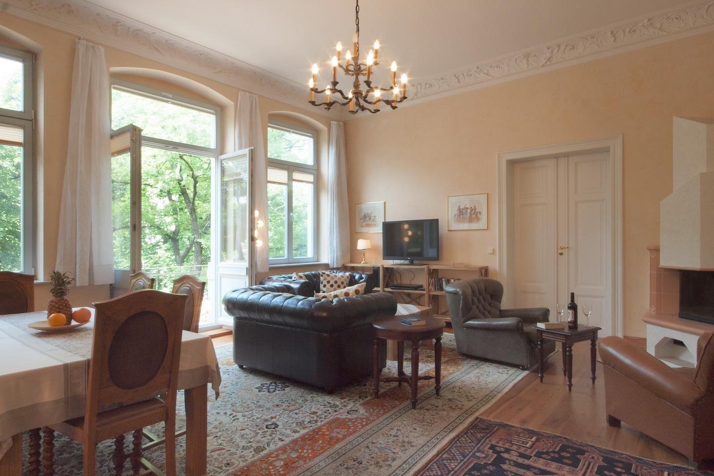 Treten Sie ein in die Belle Étage. Herrschaftliches Wohnen auf 148 qm! 4-Raum Wohnung im Obergeschoss bis 6 Personen, ruhig und zentral nähe Hauptbahnhof gelegen. 2 Schlafzimmer mit Doppelbett, 1 Schlafzimmer mit 2 Einzelbetten. Vorsaal mit Garderobe, großer, heller Wohnraum mit Esstisch, Couchgruppe und einer riesigen, nach Südwesten ausgerichteten Terrasse. Große moderne Küche, 3 Schlafräume (2 x Doppelbett, 1 x 2 Einzelbetten), großes Fensterbad mit Dusche, Wanne, Waschtisch, WC, separates Gäste-WC, TV, WiFi. Parkplätze und/oder Garagen können bei Bedarf gegen Gebühr mitgemietet werden. Zur gemeinschaftlichen Nutzung stehen den Gästen eine Fahrradgarage mit E-Bike-Ladestation, Waschmaschine und Trockenraum zur Verfügung. Auch der Garten lädt zum Verweilen ein.