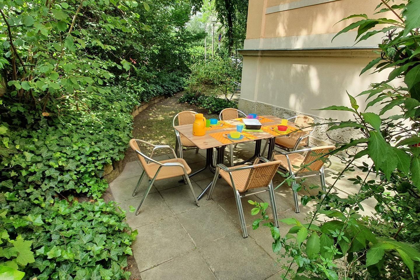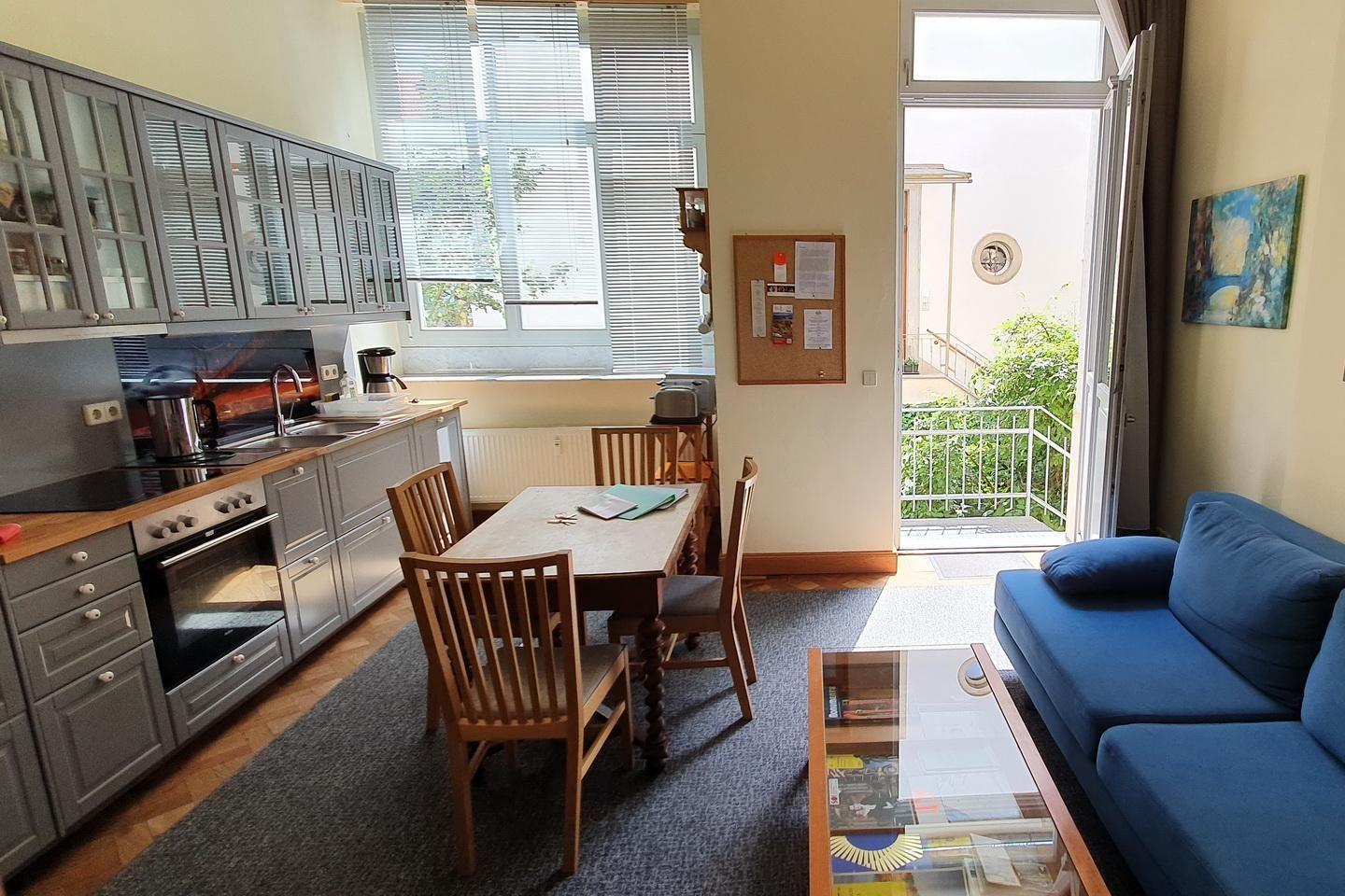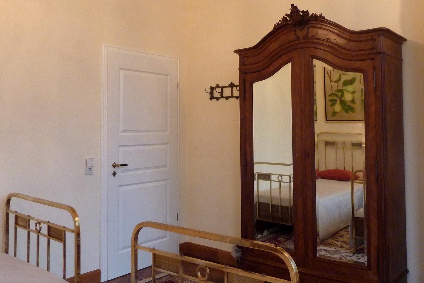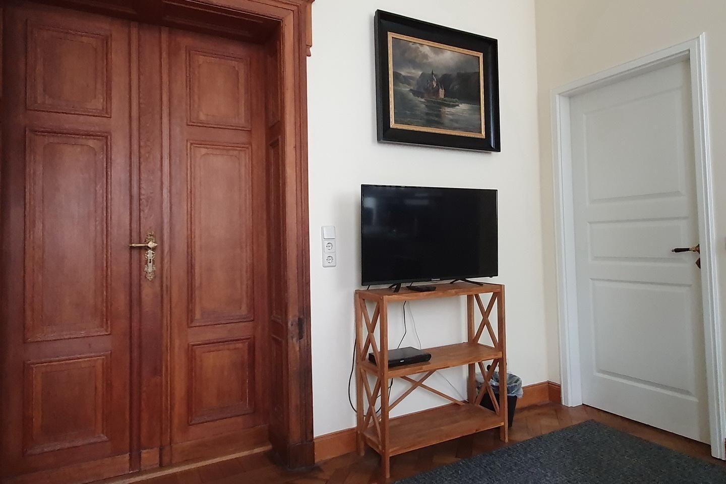Drollige Putti beim Obstpflücken zeigen die Deckengemälde in der Wohnung Carl. 3-Raum Wohnung im Hochparterre bis 6 Personen, ruhig und zentral nähe Hauptbahnhof gelegen. 1 Schlafzimmer mit Doppelbett, 1 Schlafzimmer mit 2 Einzelbetten und 1 Doppelbettcouch im Wohnzimmer. Entrée mit Garderobe, großer Wohnraum mit offener Küche, Essplatz, Couchgruppe und Zugang zum privaten Garten mit Terrasse. 1 Schlafraum mit Doppelbett, 1 Schlafraum mit 2 Einzelbetten und Couchgruppe im Wintergarten, Duschbad, Terrasse, TV, WiFi. Parkplätze und/oder Garagen können bei Bedarf gegen Gebühr mitgemietet werden. Zur gemeinschaftlichen Nutzung stehen den Gästen eine Fahrradgarage mit E-Bike-Ladestation, Waschmaschine und Trockenraum zur Verfügung. Auch der Garten lädt zum Verweilen ein.