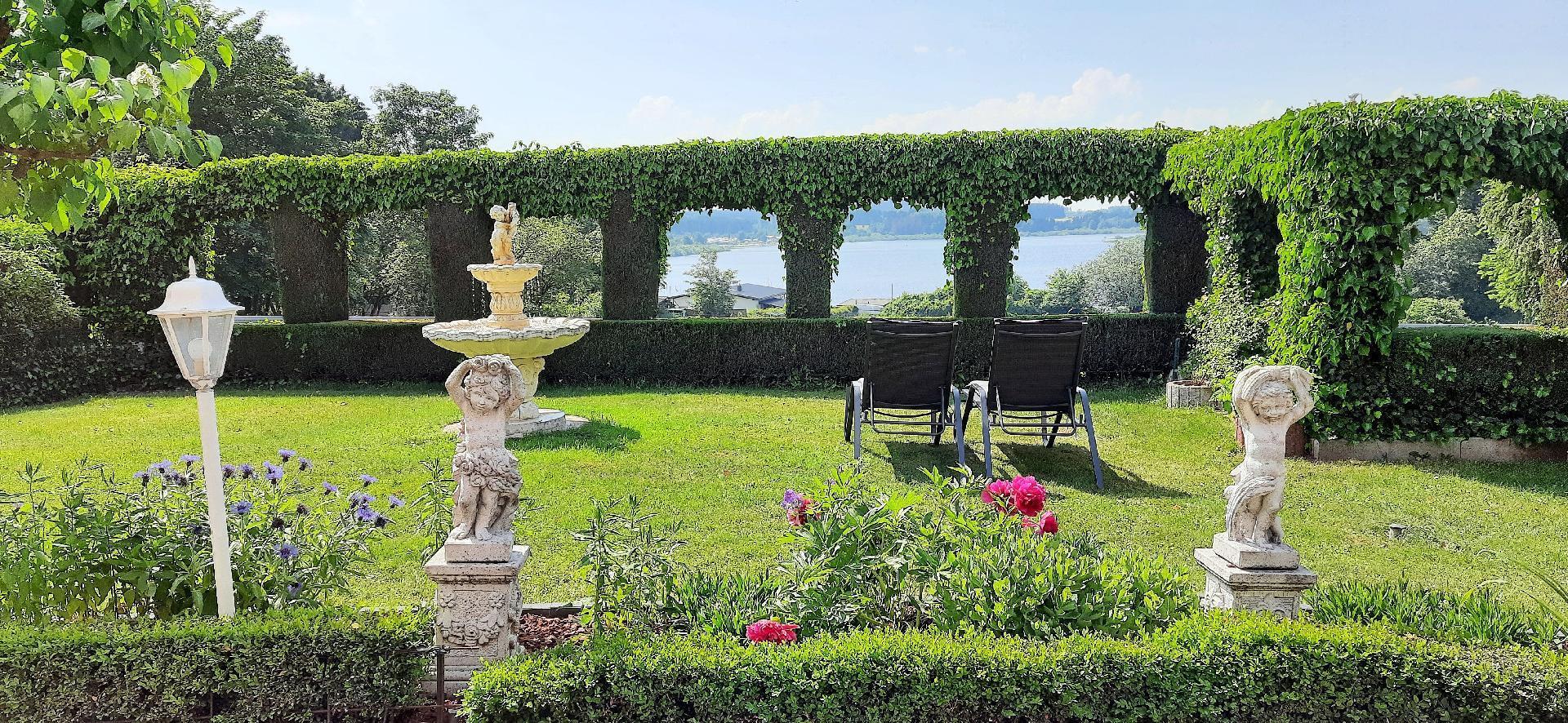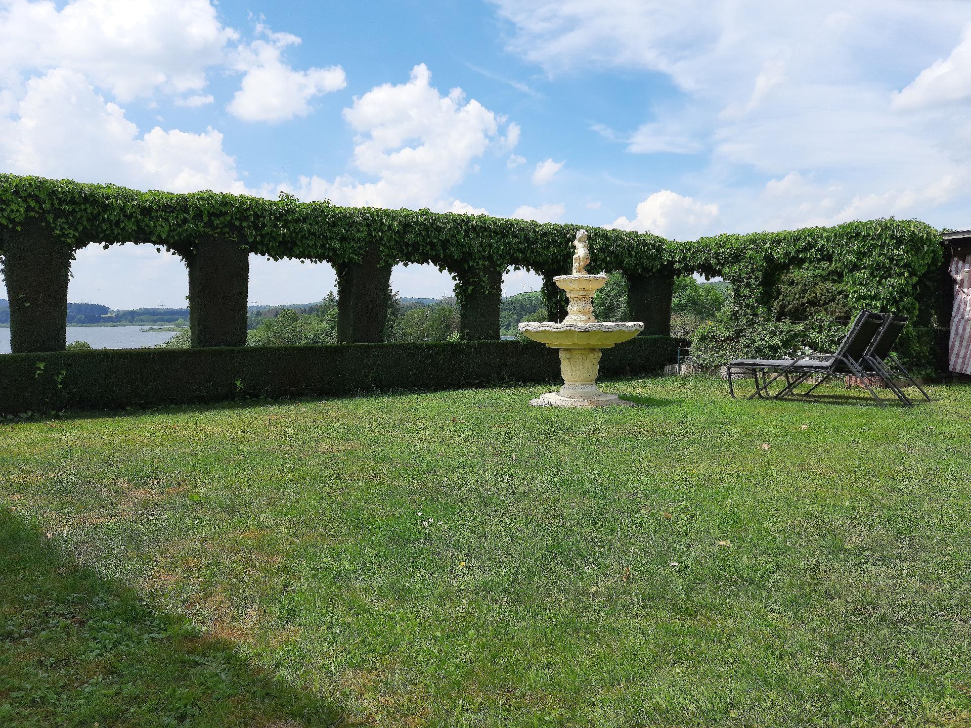 The outdoor area includes a well-kept, fenced garden with a fountain and sun loungers, a terrace with a spacious seating area, parasol and gas barbecue, as well as a charging station for electric cars (11kW wallbox (0.39€/kW)).