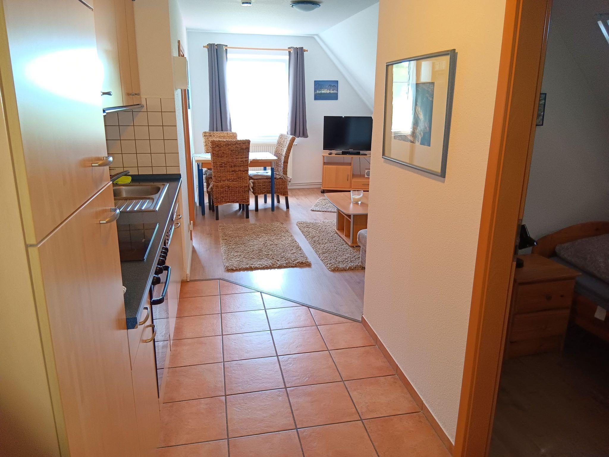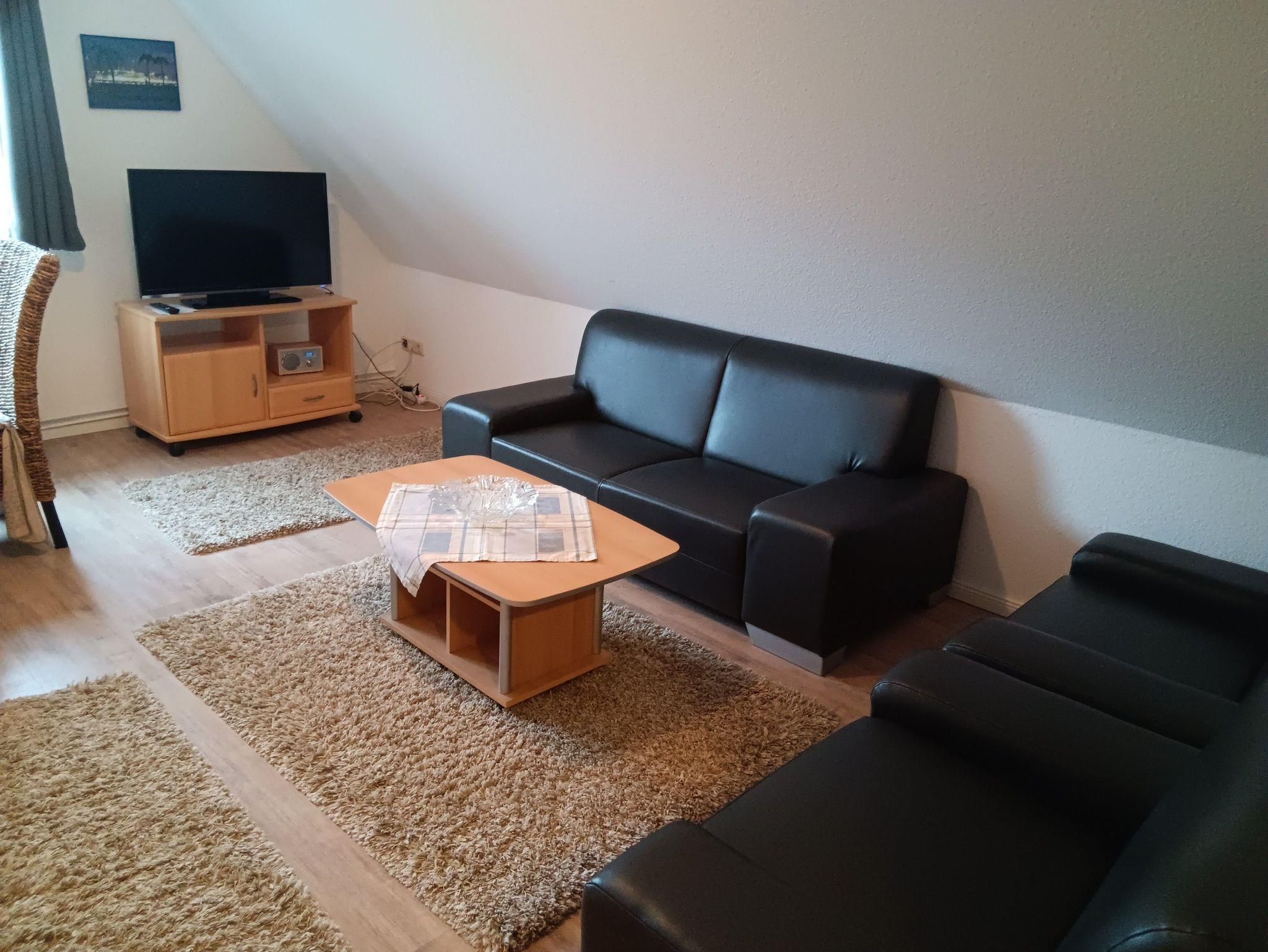 Diese gemütliche Ferienwohnung ( 46 m2 ) finden Sie im Dachgeschoss. (1 Wohnzimmer mit kompletter Küchenzeile. Esstisch mit 4 Stühlen, gemütliche Couchgarnitur, 2 Schlafzimmer ( 1 Schlafzimmer mit Doppelbett und ein kleines Schlafzimmer mit 1 Einzelbett, Badezimmer mit Dusche, WC und Handtuchwärmer).