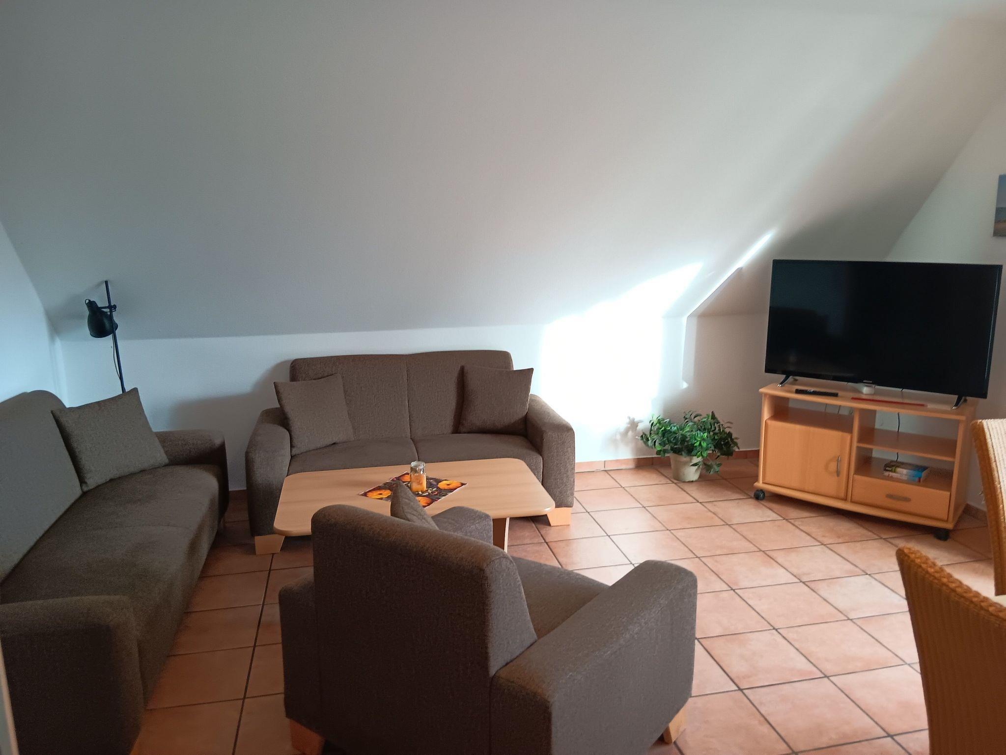 Diese Ferienwohnung ist 55 m2 groß. ( 1 Wohnzimmer mit kompletter Küchenzeile, Esstisch für 5 Personen und gemütlicher Couchgarnitur, 2 Schlafzimmer ( 1 Doppelbett und 1 x 2 Einzelbetten ), Badezimmer mit Dusche und WC , regulierbare Fußbodenerwärmung im Bad, Flur und Wohnzimmer)