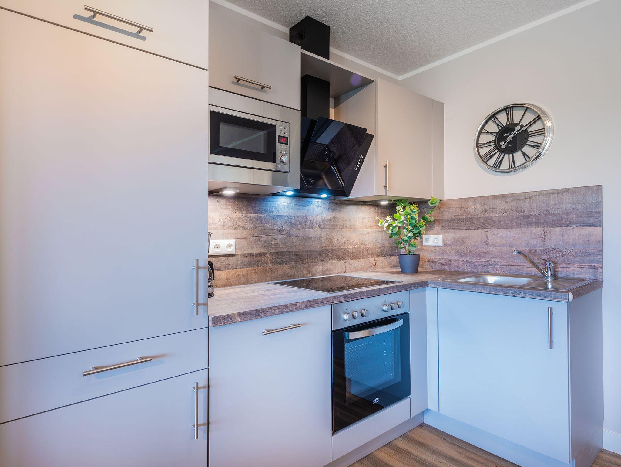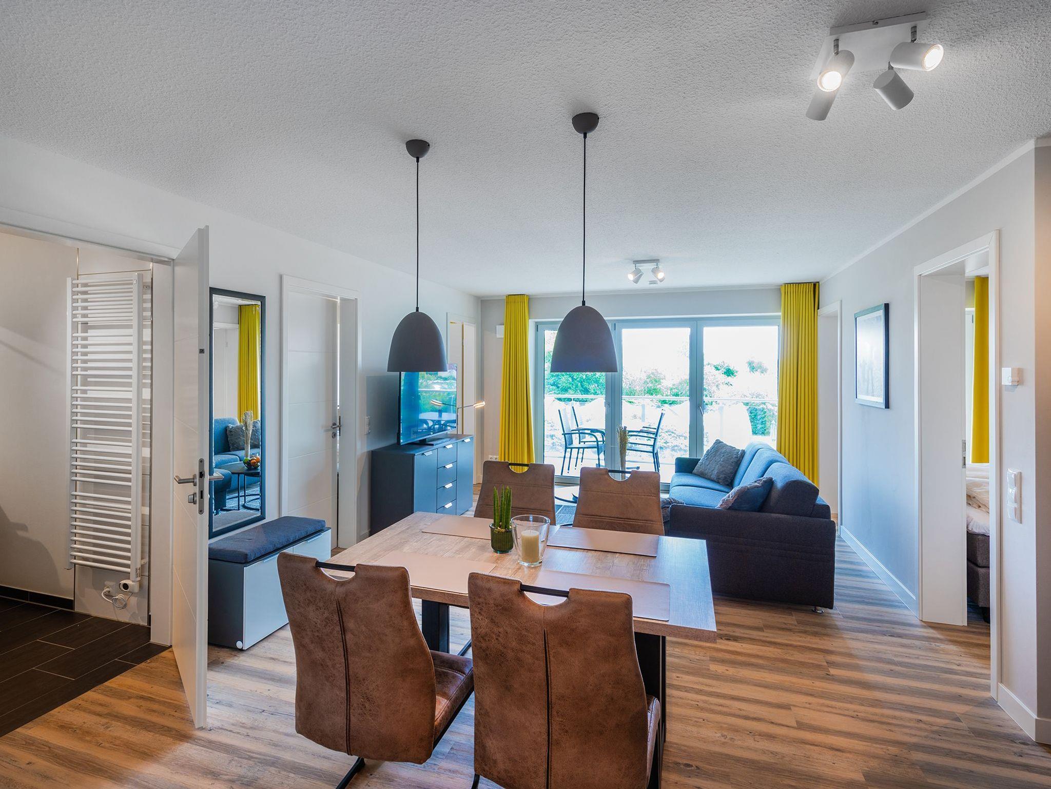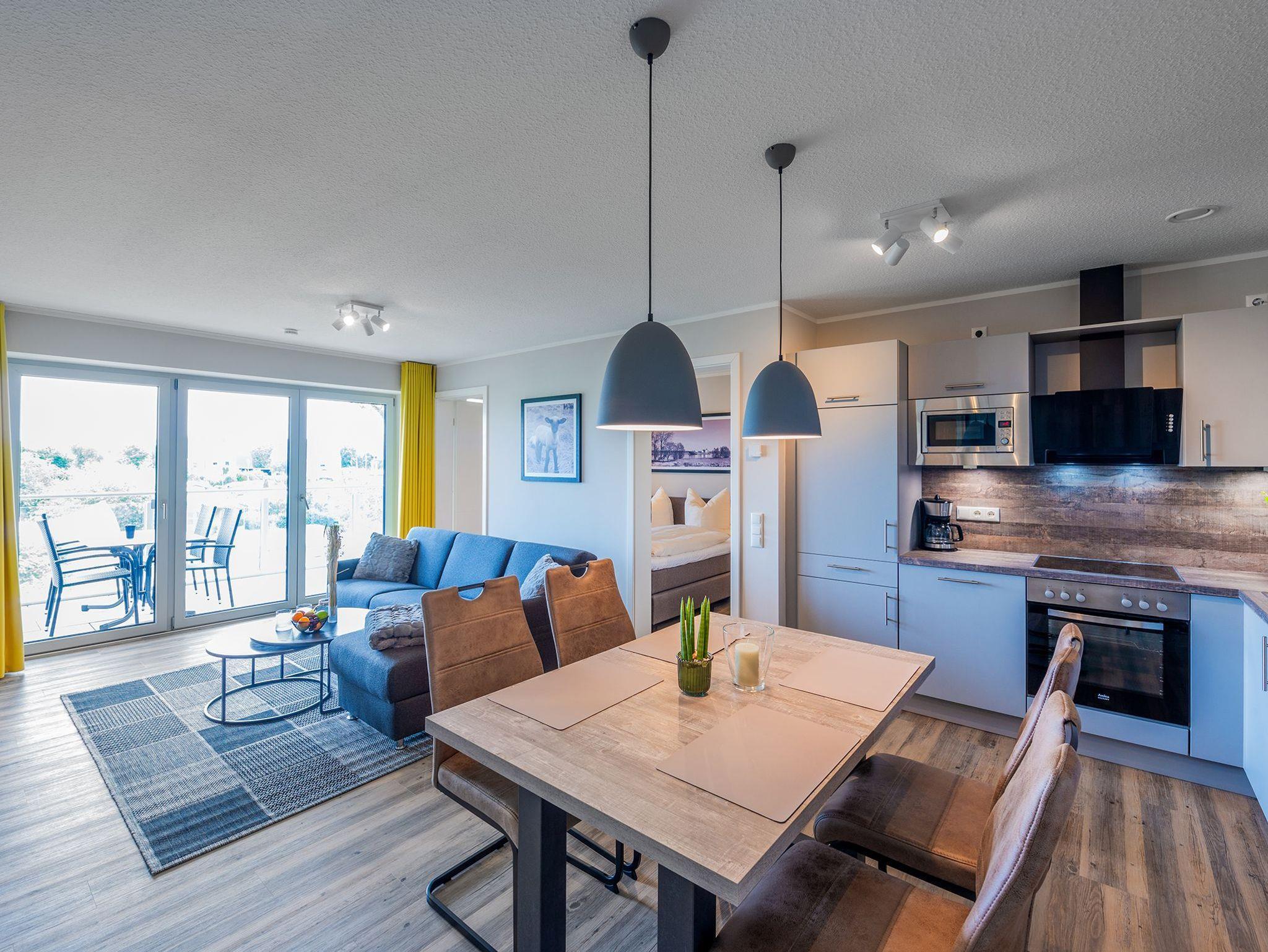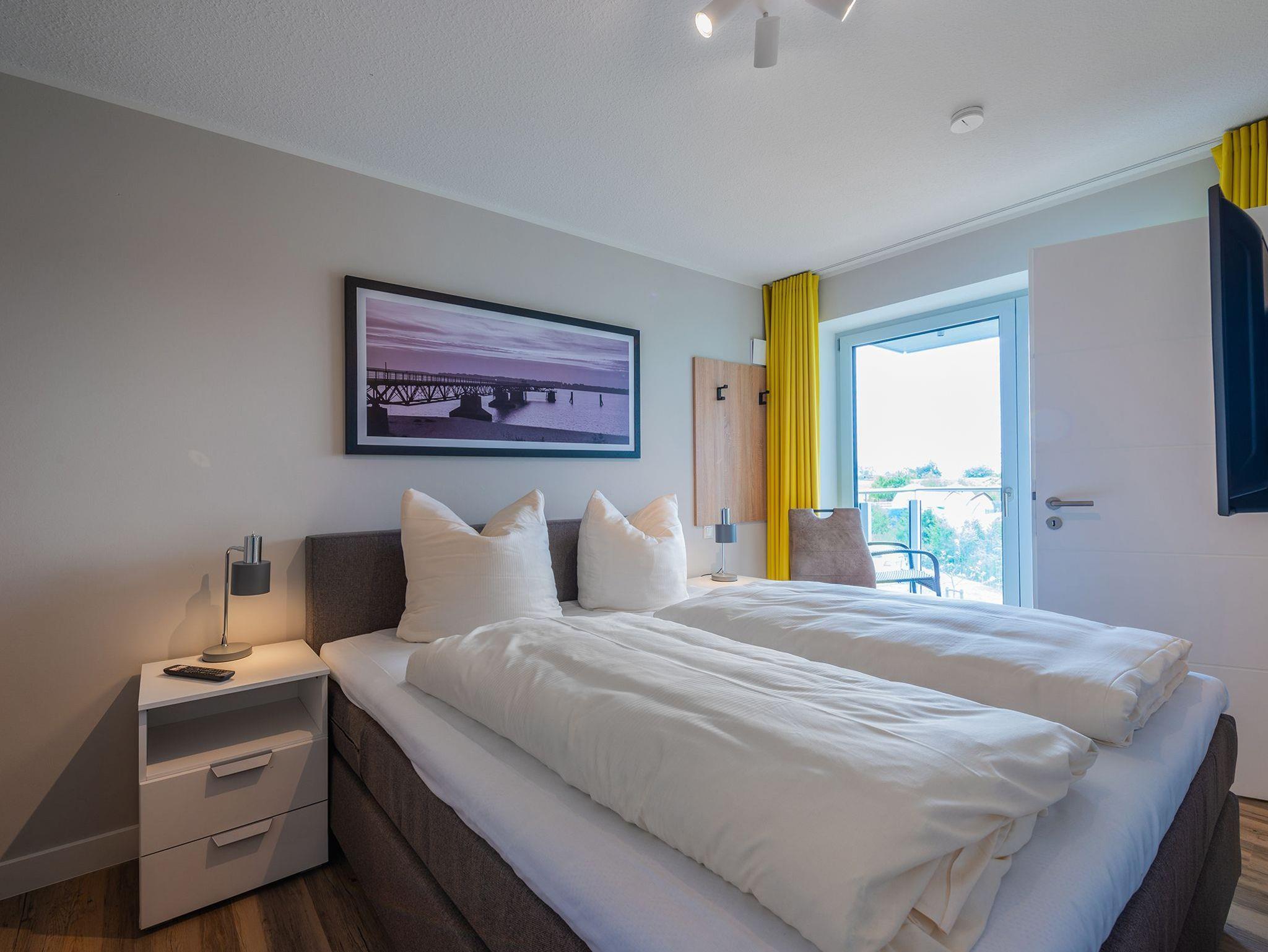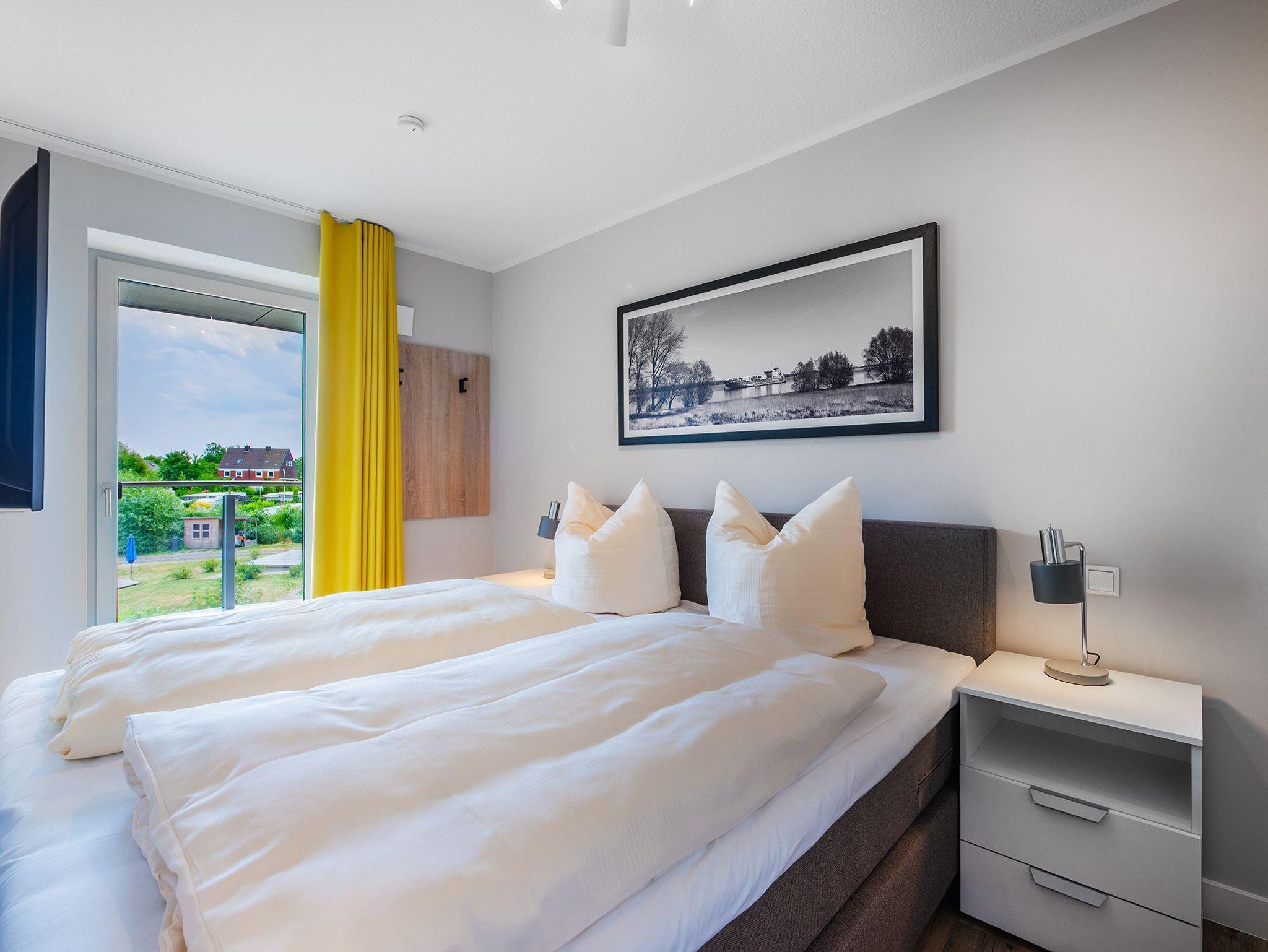DIe Appartements der Kategorie D4 R3 in unserem Ferienhaus Elbbrise bieten Ihnen eine komfortable Ferienwohnung mit zwei separaten Schlafzimmern, einem offenen Wohn-, Koch- und Essbereich und einem Balkon mit Blick auf die Elbe.