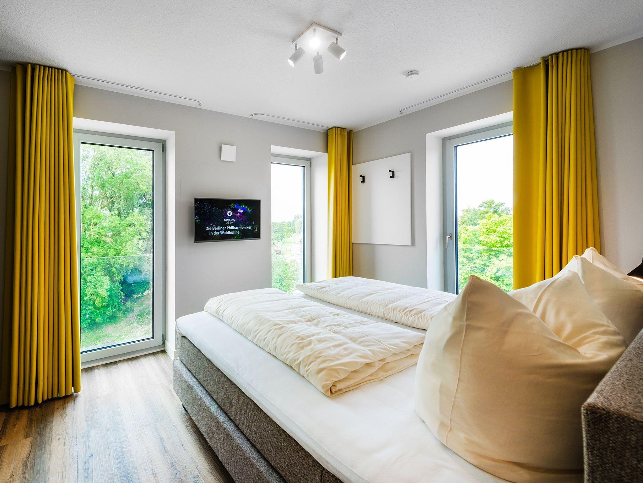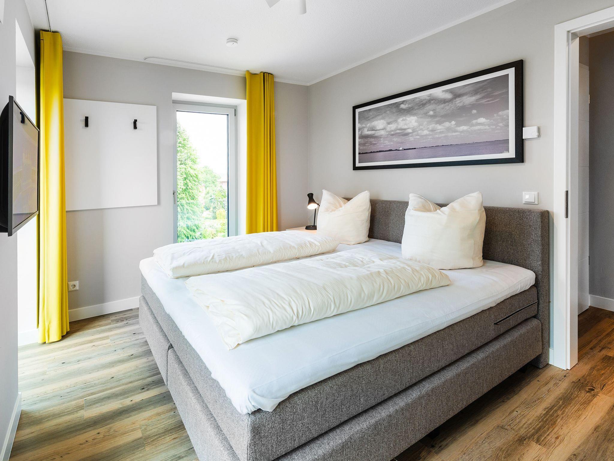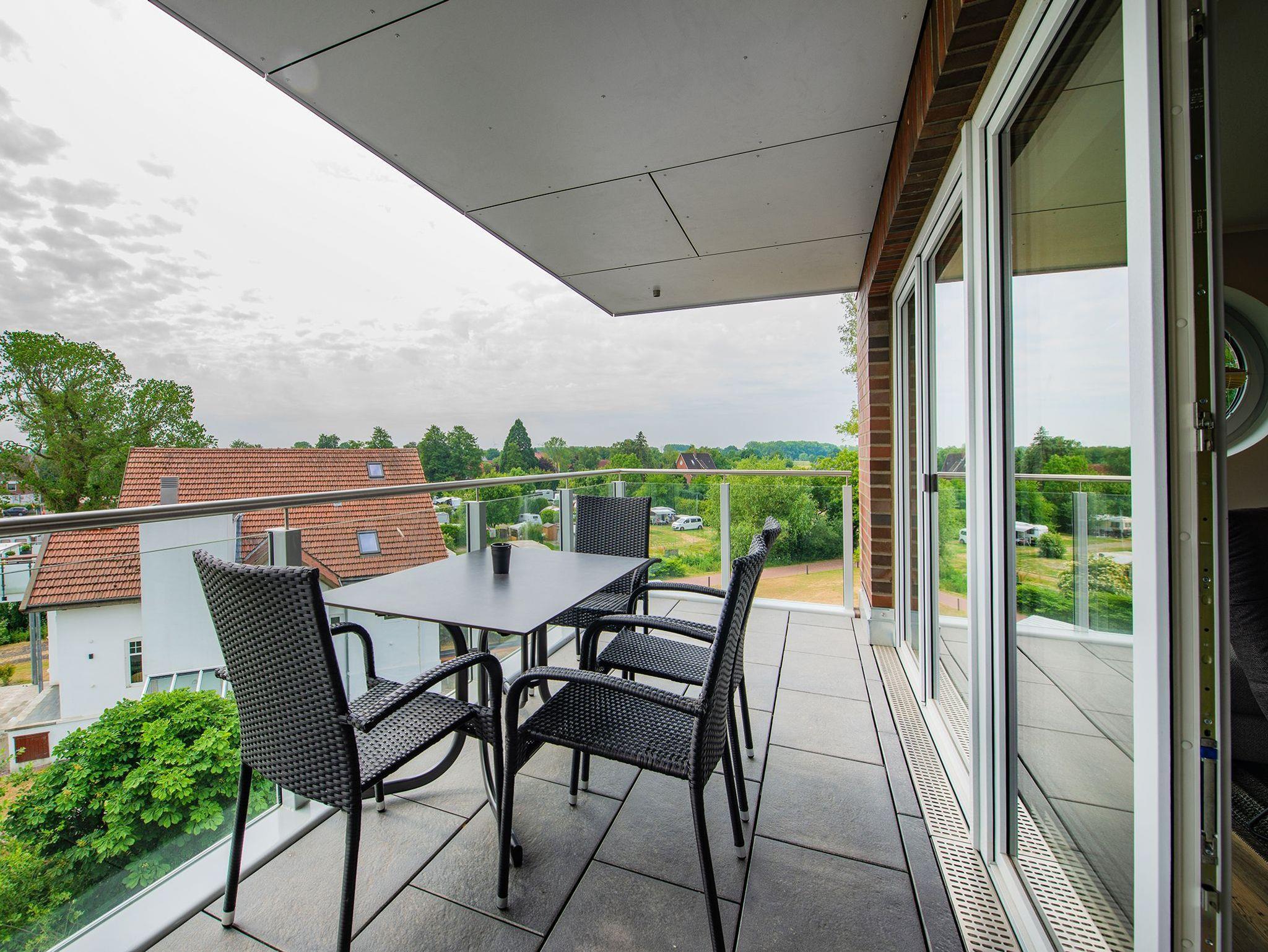 DIe Appartements der Kategorie D5 R3 in unserem Ferienhaus Elbbrise bieten Ihnen eine komfortable Ferienwohnung mit zwei separaten Schlafzimmern, einem offenen Wohn-, Koch- und Essbereich und einem Balkon mit Blick auf die Elbe.