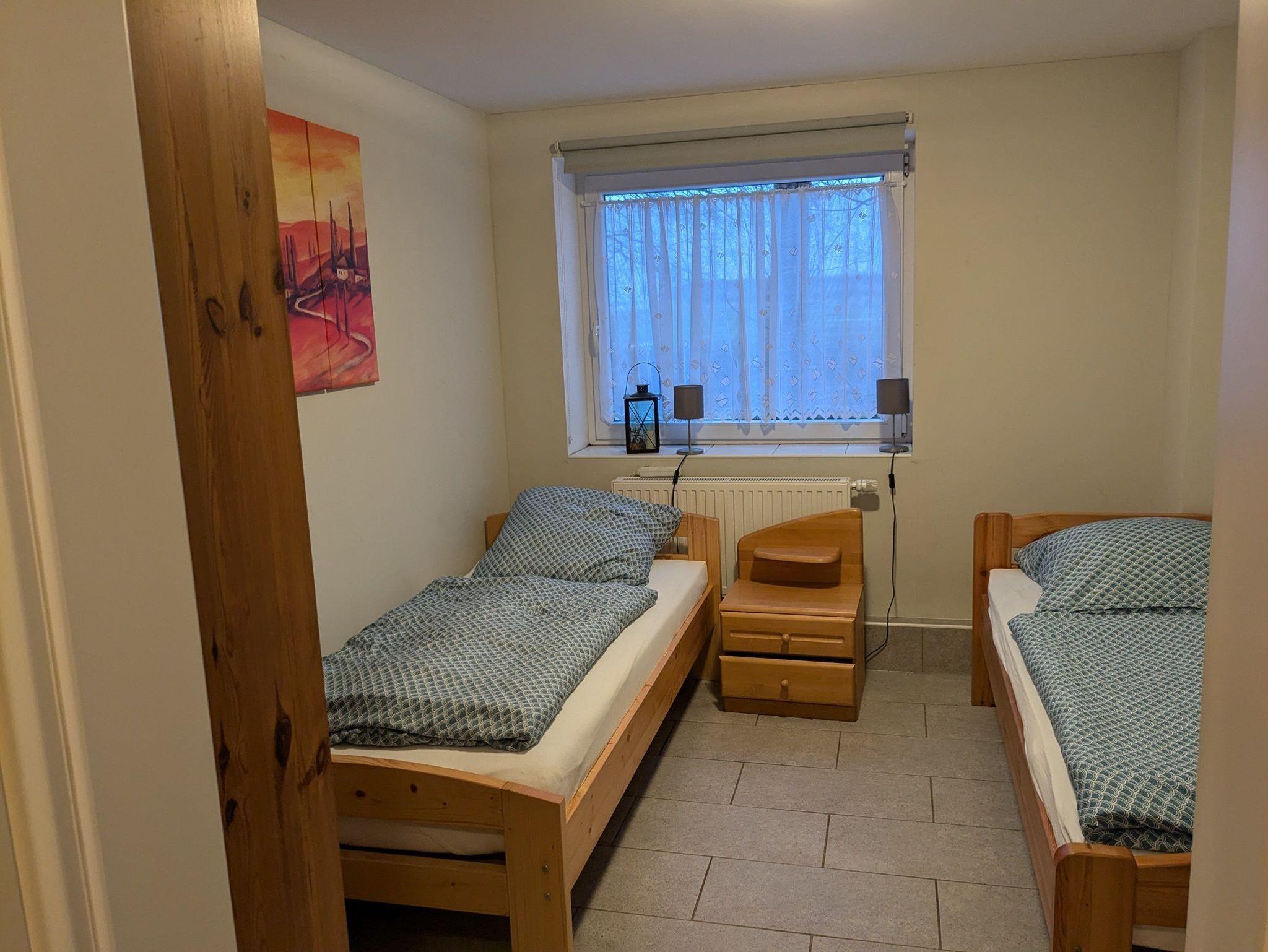 6 Zimmer mit jeweils 2 Einzelbetten, 2 Duschbäder mit einer Waschmaschine und eine Wohnküche inclusive WLAN.