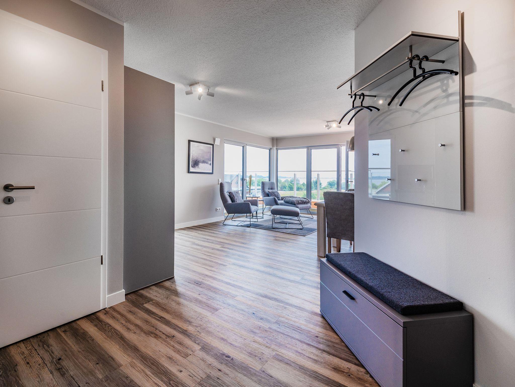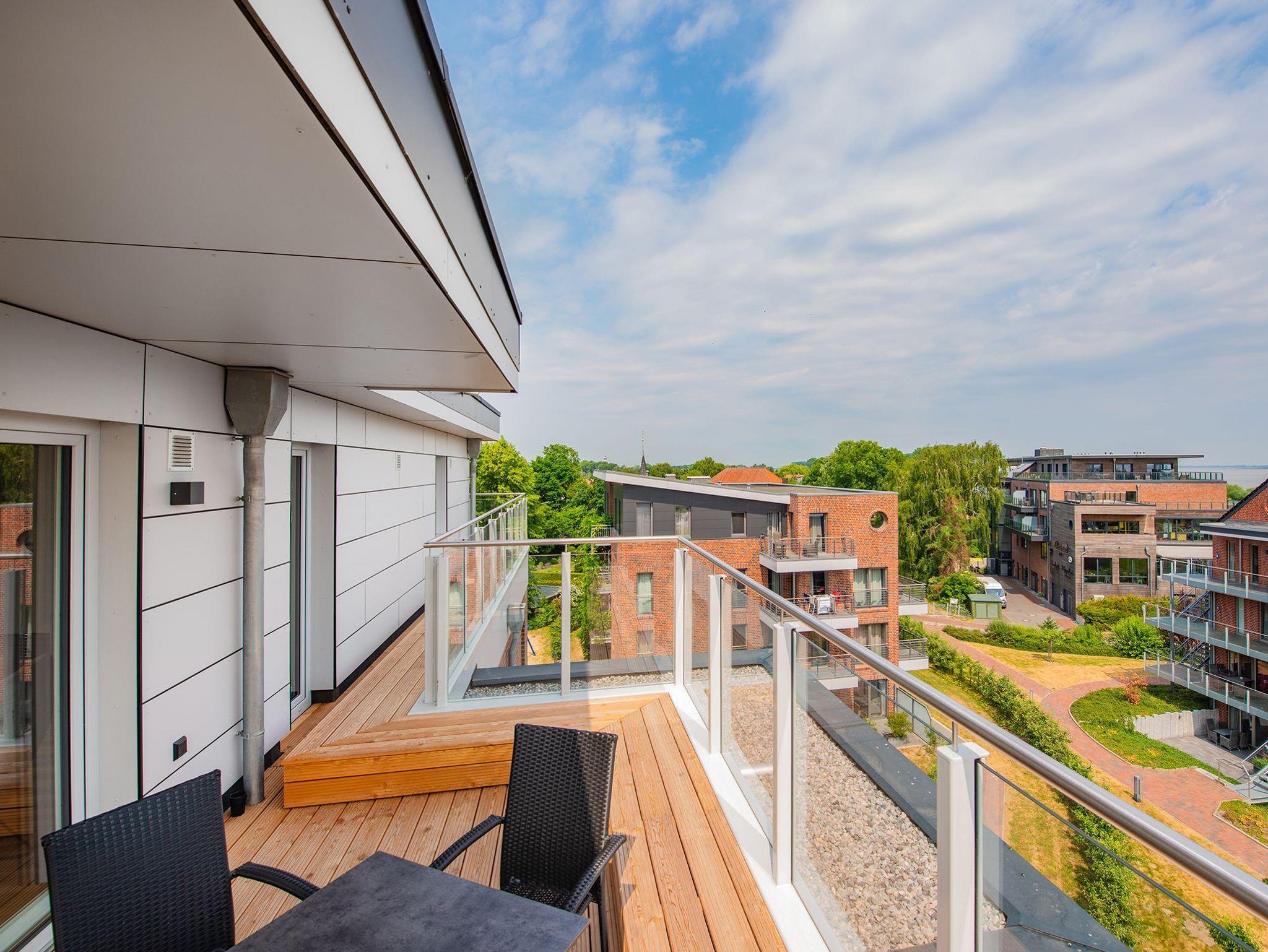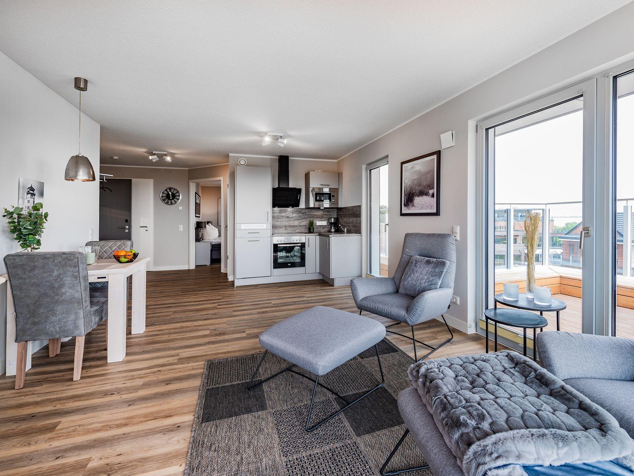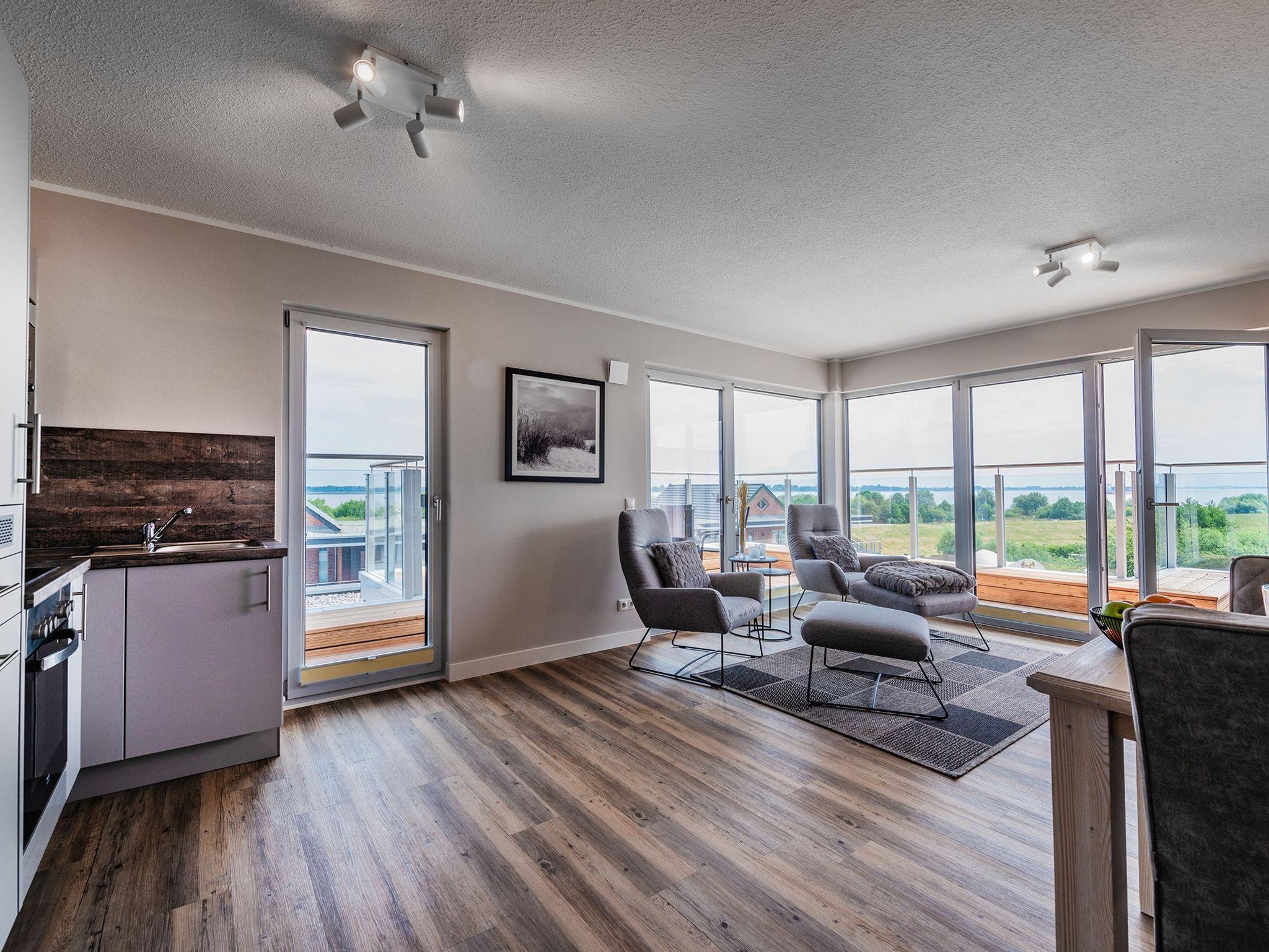 DIe Appartements der Kategorie D6 R2 in unserem Ferienhaus Elbbrise bieten Ihnen eine komfortable Ferienwohnung mit einem separaten Schlafzimmer, einem offenen Wohn-, Koch- und Essbereich und einem Balkon mit Blick auf die Elbe.