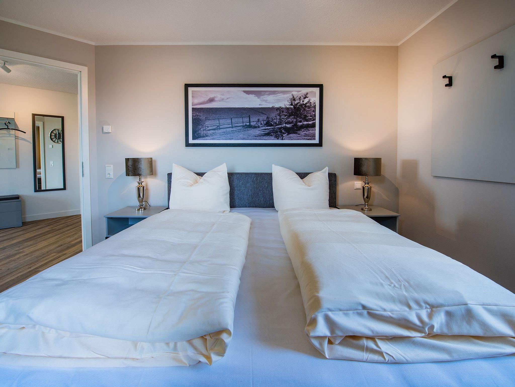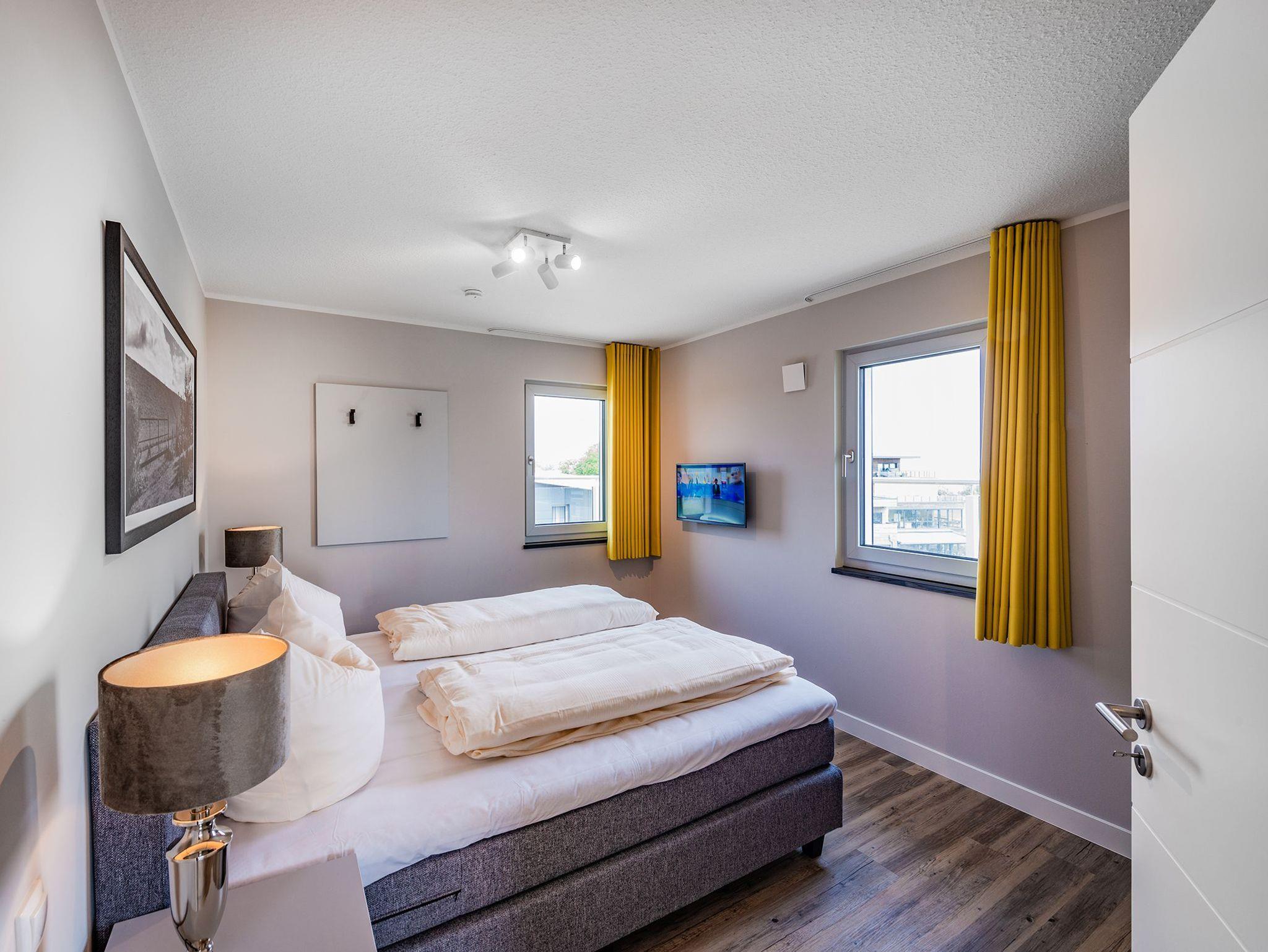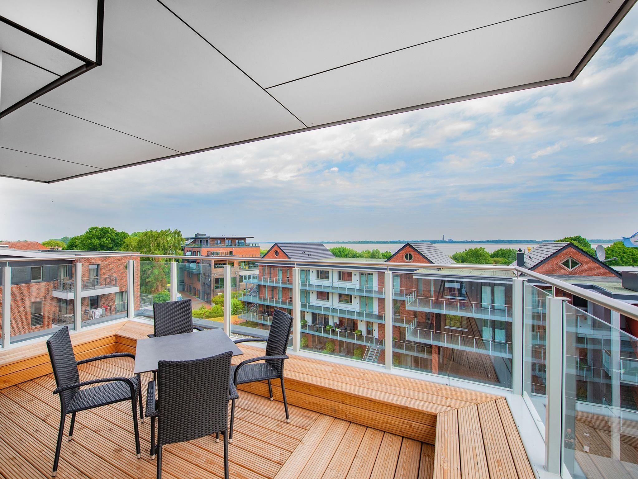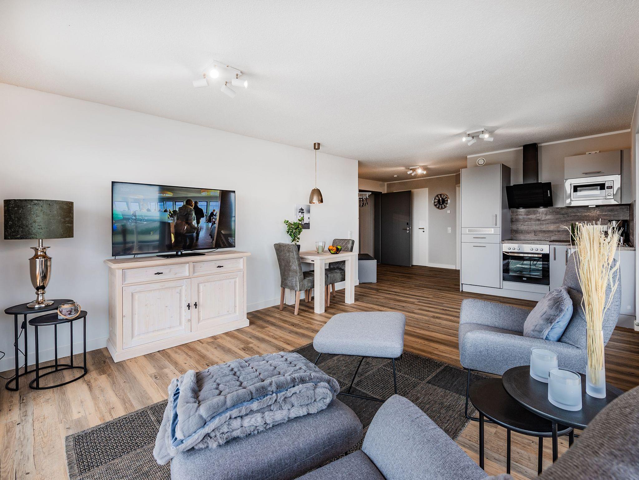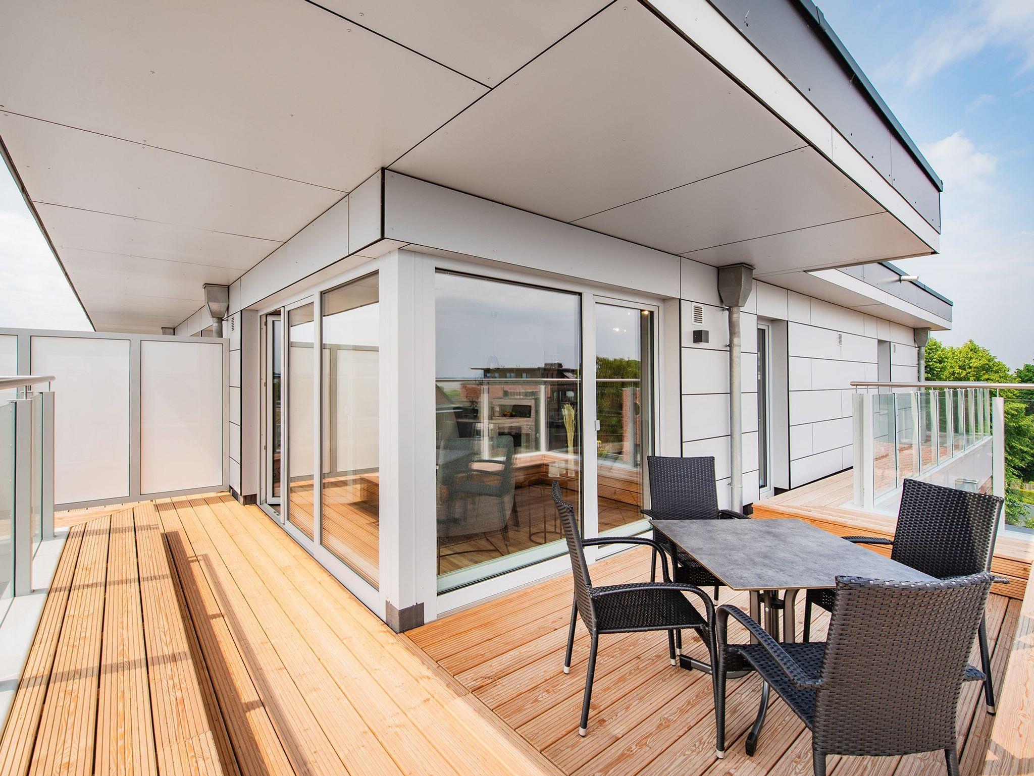 DIe Appartements der Kategorie D6 R2 in unserem Ferienhaus Elbbrise bieten Ihnen eine komfortable Ferienwohnung mit einem separaten Schlafzimmer, einem offenen Wohn-, Koch- und Essbereich und einem Balkon mit Blick auf die Elbe.