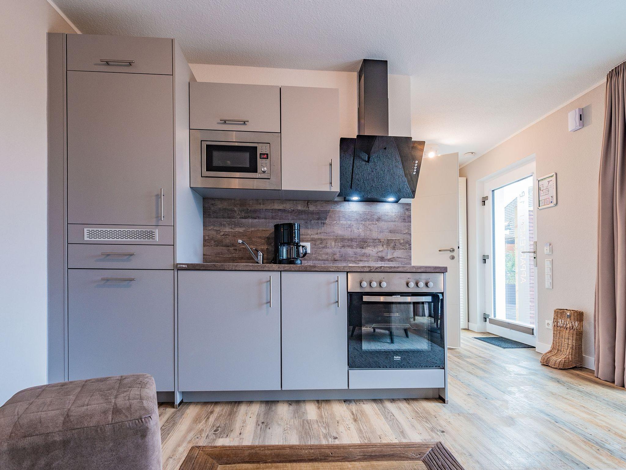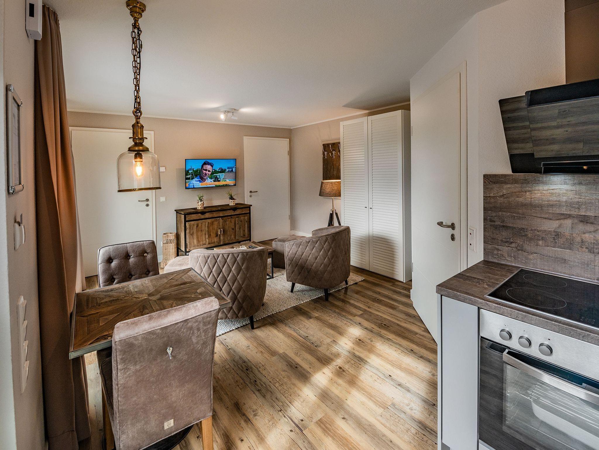 Die Wohnungen der Kategorie D1 R2 im Haus Elbaussicht verfügen über ein separates Schlafzimmer, einen Wohn-, Koch- und Essbereich und einer sonnigen Südterrasse.